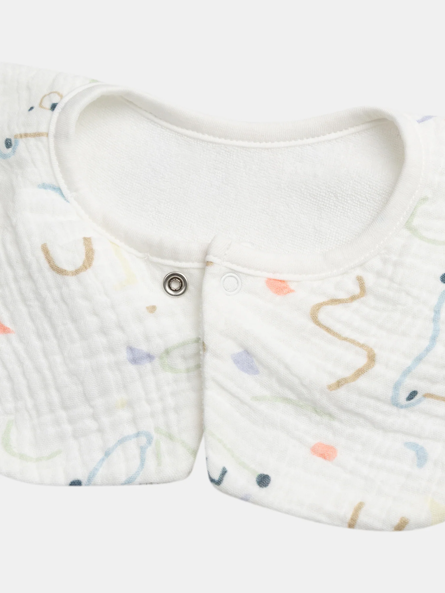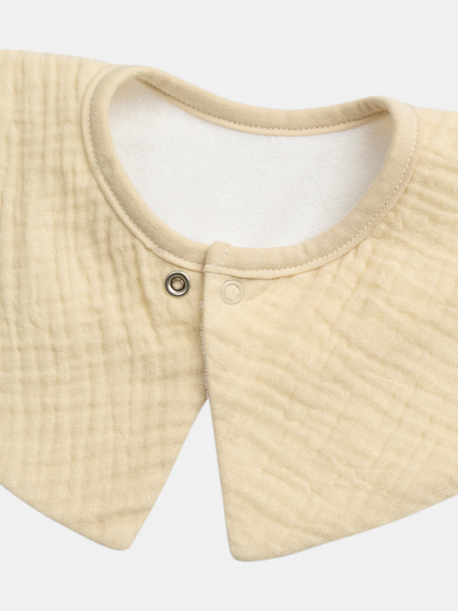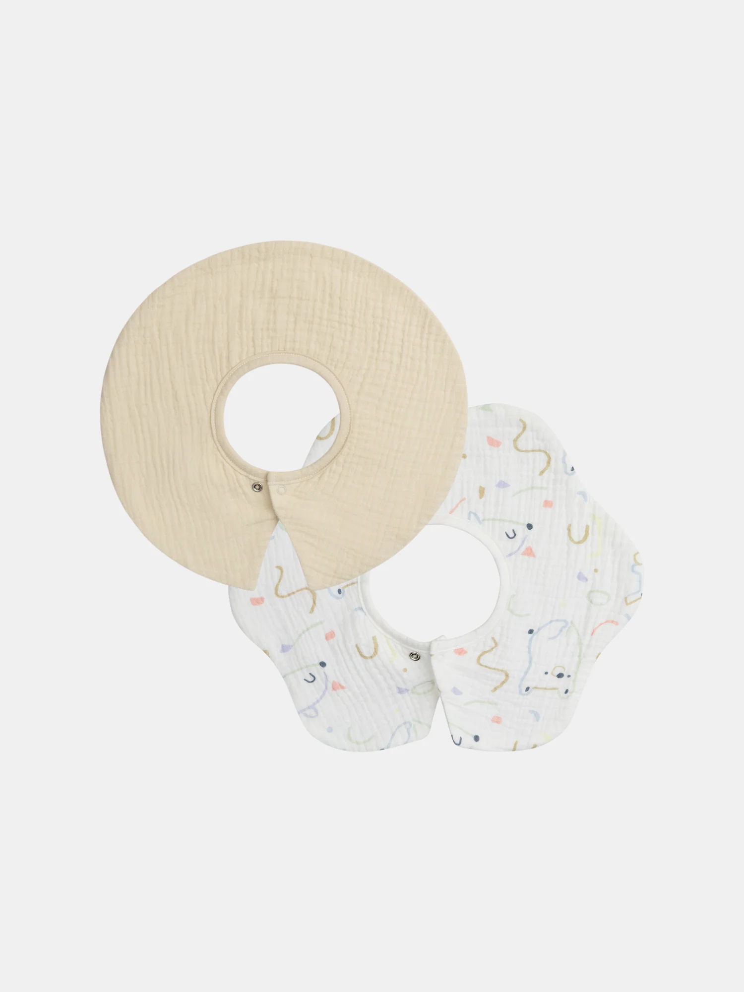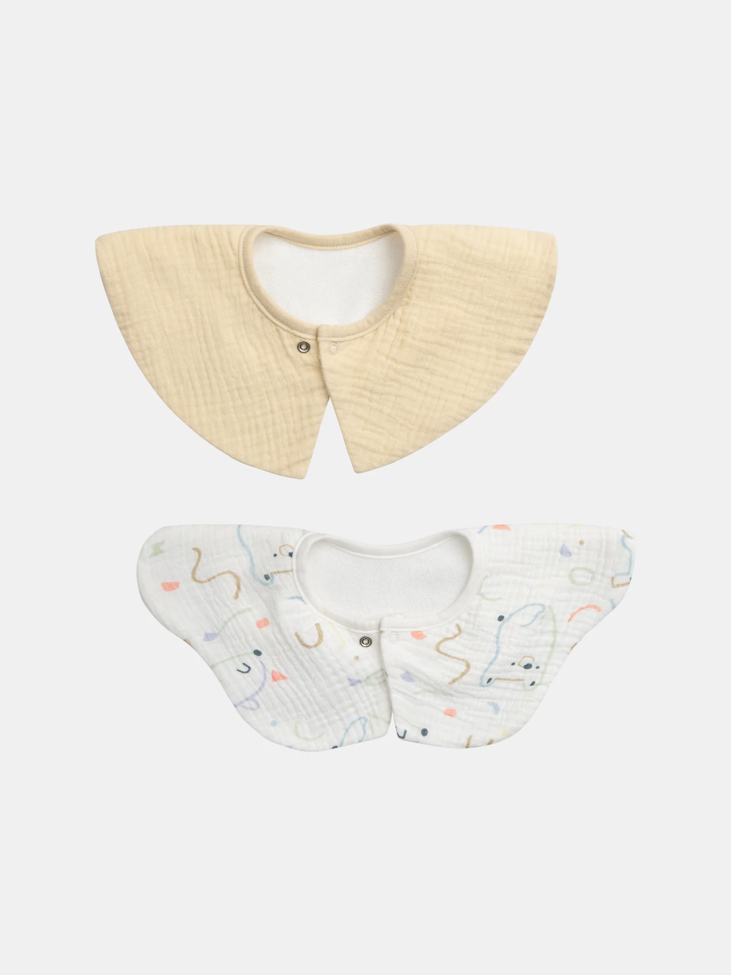 Ce lot de 2 bavoirs en double gaze de coton, doublés éponge, comprend un modèle imprimé et un uni aux formes fantaisies, avec un tour de cou à ouverture pressionnée pour un habillage simple.