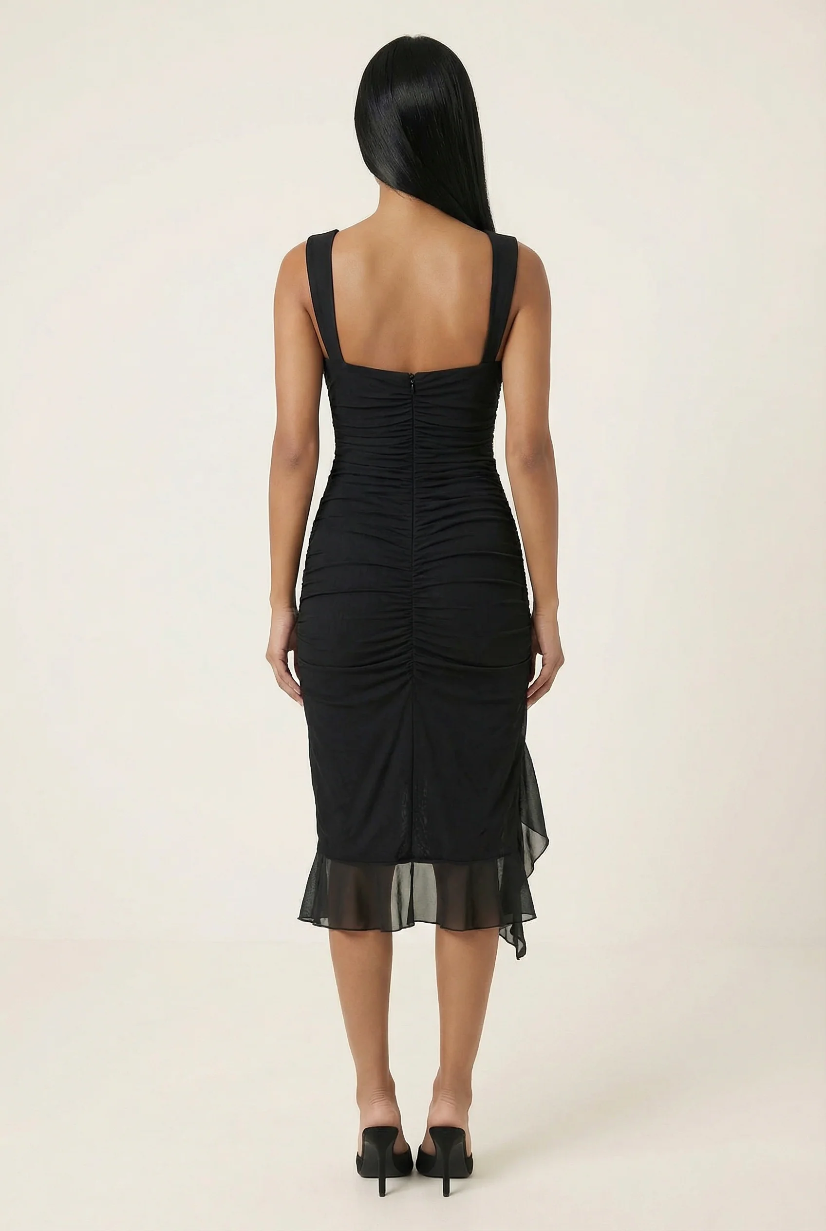 - Détails couture : coupe asymétrique, jeux de fronces, dos légèrement ouvert