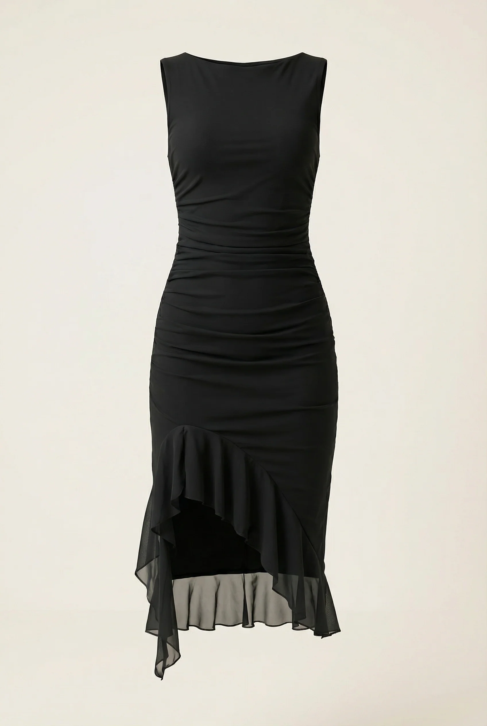 Un pas devant l’autre, la lumière accroche les plis de la robe comme des éclats sur une onde calme. Son tissu fluide souligne les courbes sans les contraindre, tandis que l’encolure ronde et la coupe sans manches dégagent avec élégance les épaules et le port de tête. La taille haute structure la silhouette, et la jupe asymétrique, animée de légers plissés, dessine un mouvement naturel et gracieux. Le dos subtilement dégagé dévoile juste ce qu’il faut d’audace. Une robe dessinée pour celles qui avancent avec grâce et caractère.