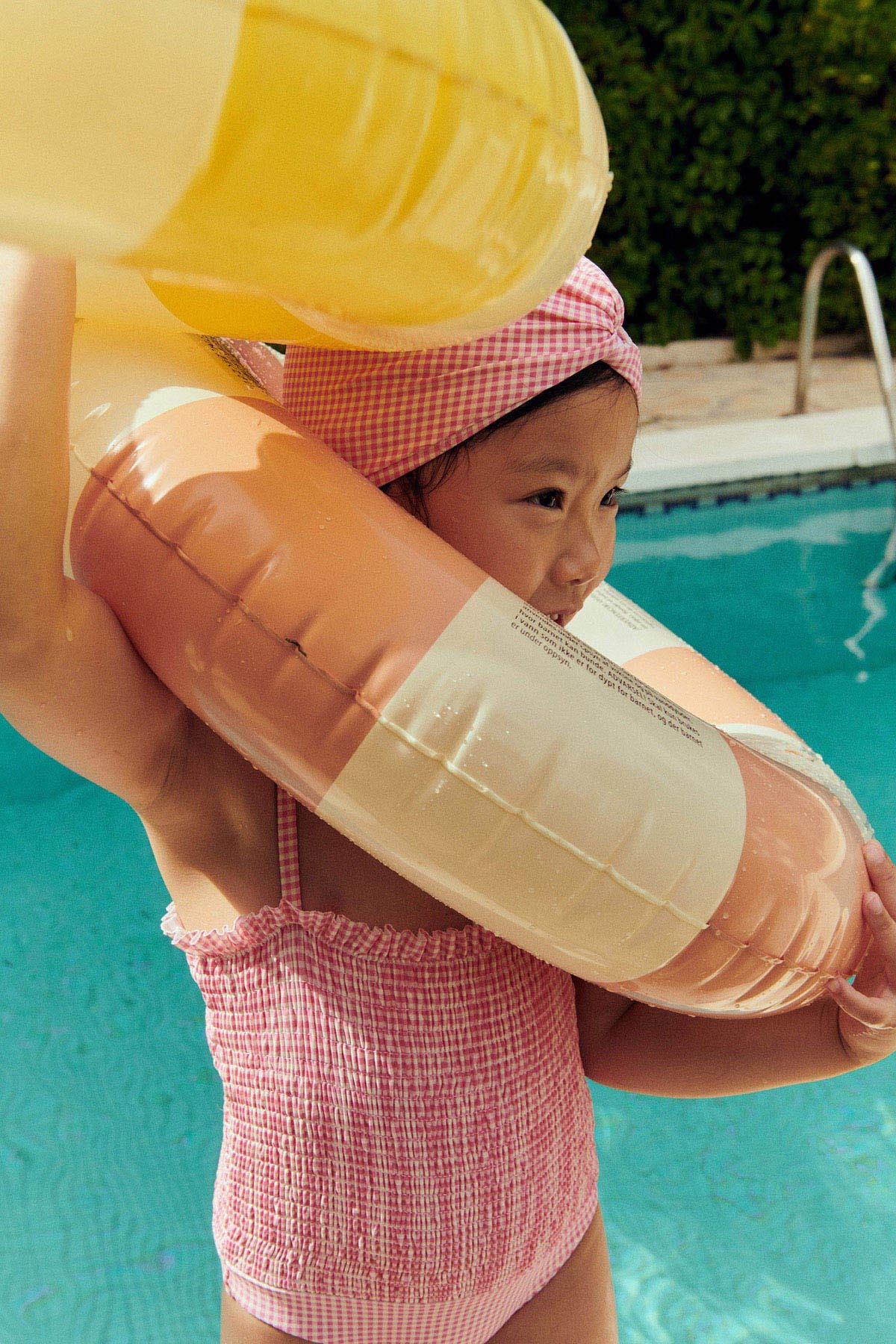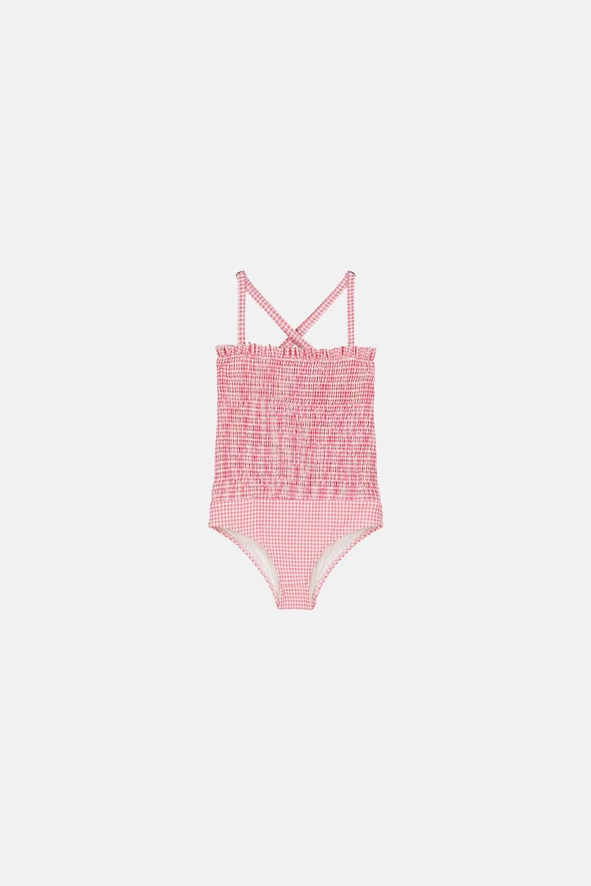 - Maillot de bain une pièce avec haut smocké et petit volant en haut des smocks.