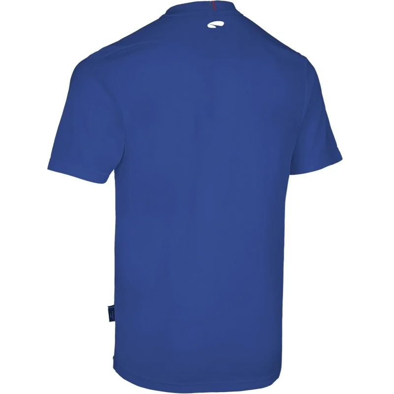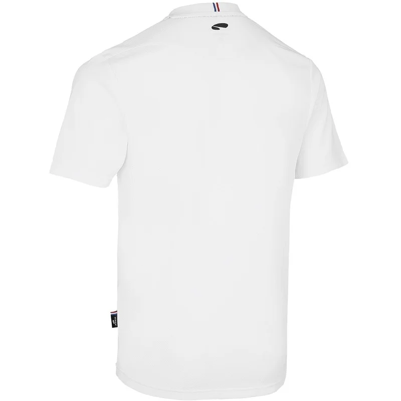 Col en bords-côtes, bande de propreté et détail tricolore pour une finition parfaite.