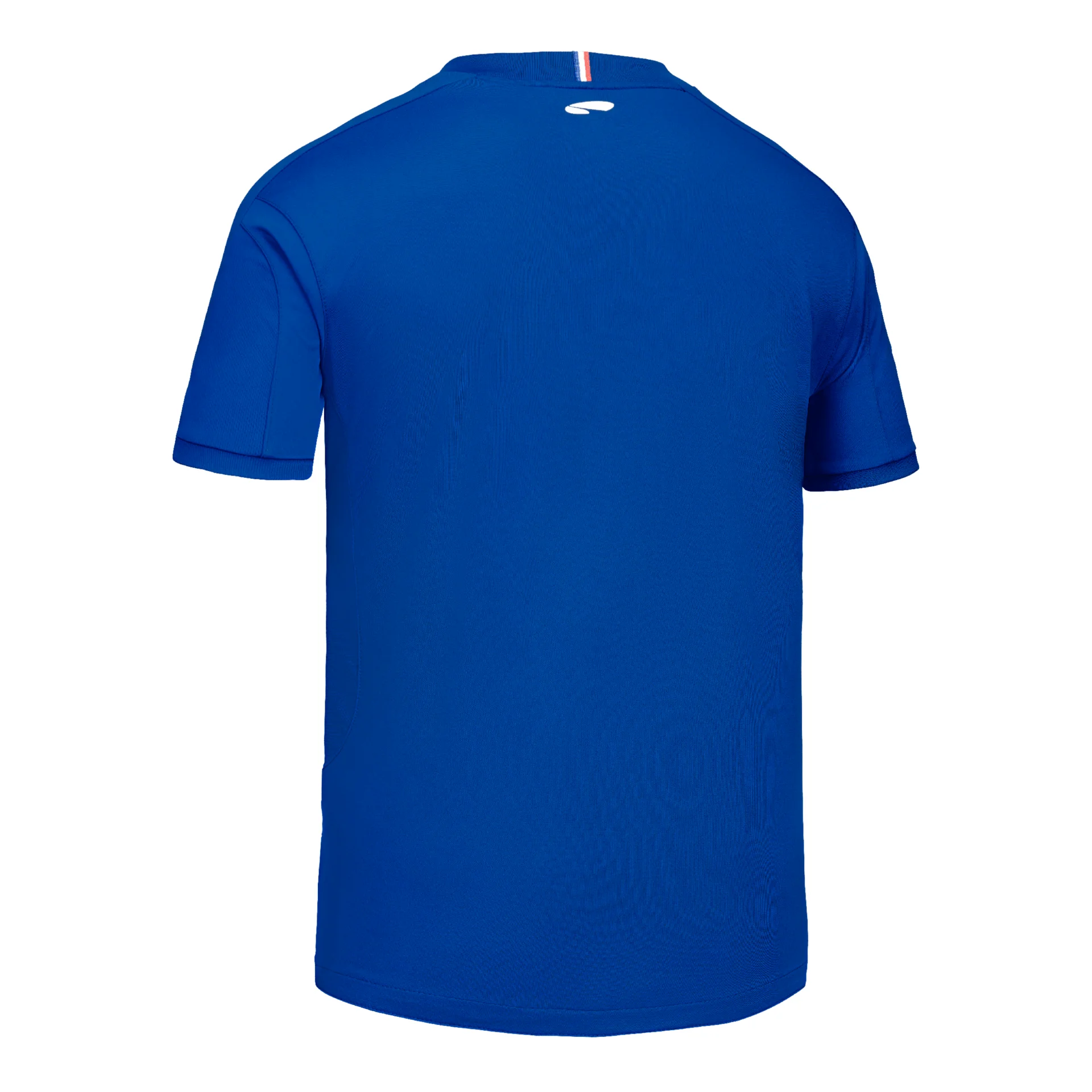 Le maillot LEAGUE manches courtes existe en uni et bicolore, il est idéal pour les matchs. Tissu principal en polyester avec empiècements mesh sur les parties supérieures et latérales permettant une ventilation optimale de la transpiration. Col en bords-côtes avec bouton de fermeture et détails intérieurs (bande de propreté et languette tricolore). Fentes latérales avec inserts en bords-côtes. Détails logo avec embossage sur les épaules. Finition des manches en bords-côtes. Logo avant brodé et printé au dos. Composition 100% polyester.