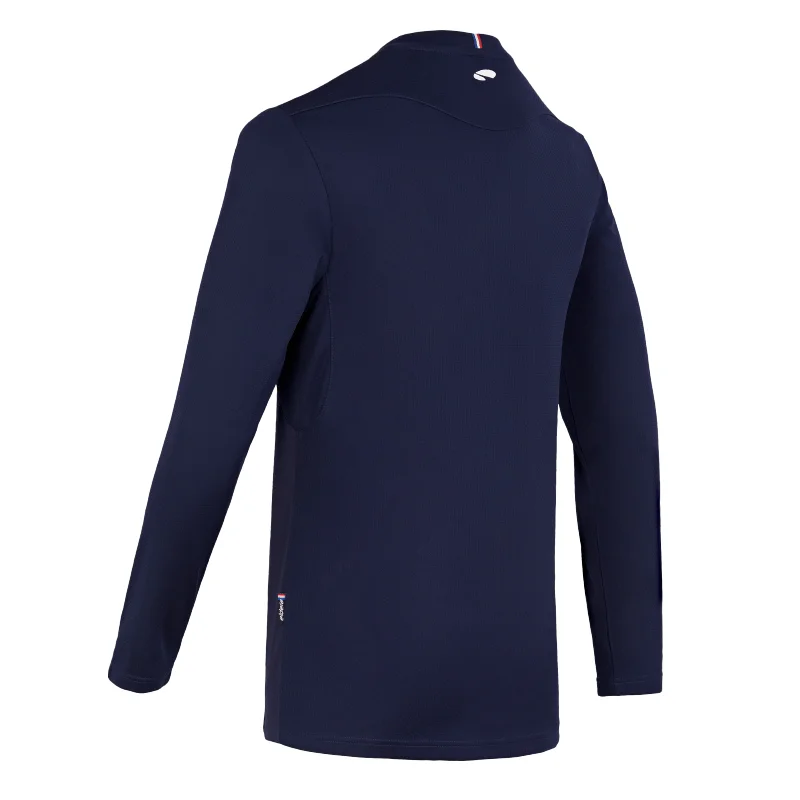 Col en bords-côtes, bande de propreté et détail tricolore pour une finition parfaite.