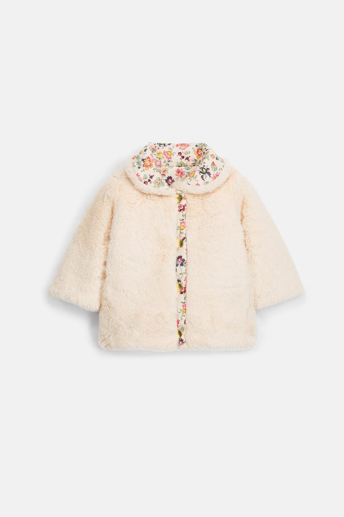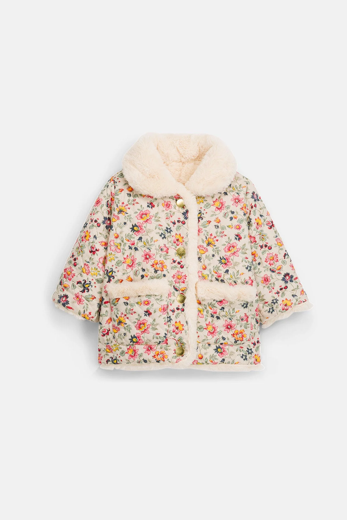 - Manteau réversible avec un côté en double gaze de coton fleuri matelassé et un côté en fausse fourrure très douce.