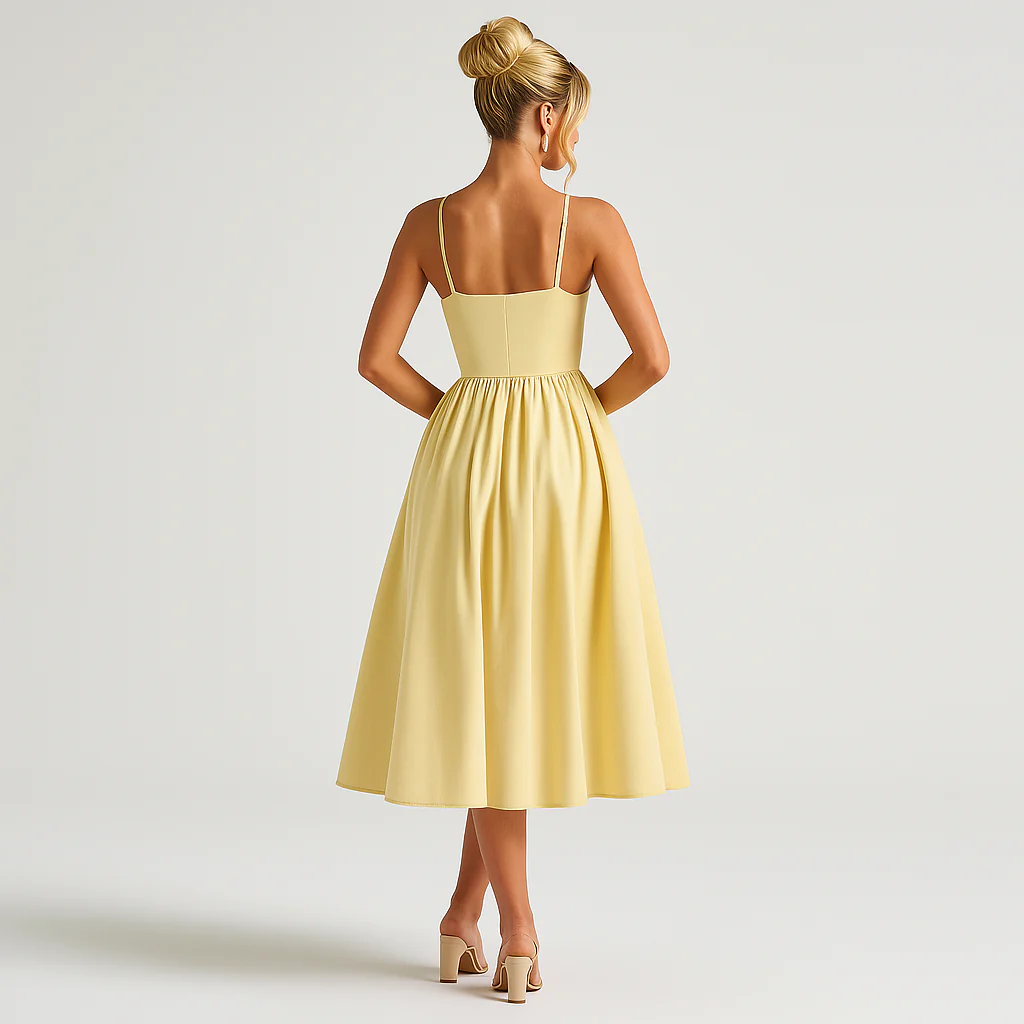 Rehaussez votre style avec la ravissante robe mi-longue Mariella en coloris citron. Son décolleté en cœur et son buste à l’allure corsetée sculptent la silhouette avec finesse, tandis que son dos smocké assure un confort optimal. La jupe ample, légèrement froncée à la taille, apporte une touche d’élégance aérienne. Une pièce lumineuse, parfaite pour les fêtes en plein air, les célébrations en journée ou toute occasion où fraîcheur et féminité sont de mise.