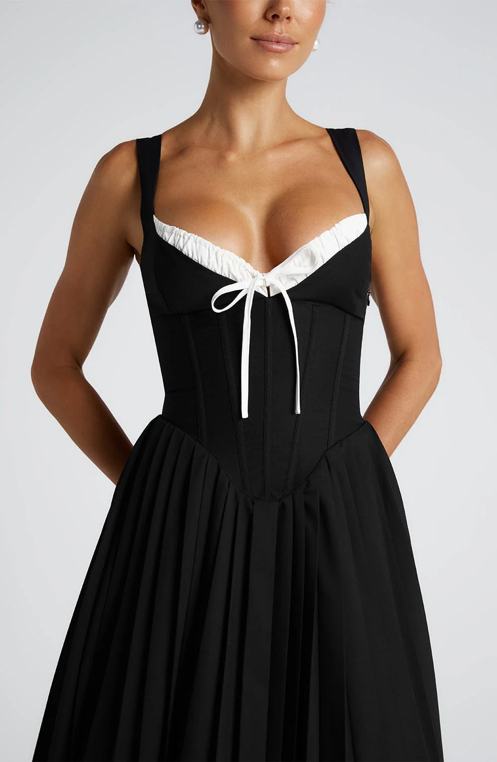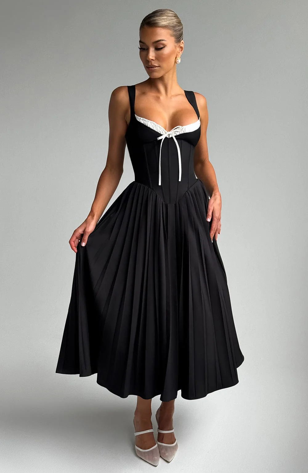 La robe mi-longue Natassia en noir et blanc incarne l’élégance avec une touche audacieusement moderne. Conçue pour faire sensation, elle se distingue par ses bretelles réglables en forme d’éventail et son décolleté cœur plongeant, mis en valeur par un détail froncé contrastant façon « peek-a-boo », noué au centre pour une subtile touche de séduction. Le corsage structuré avec baleines et laçage au dos affine la taille et sculpte une silhouette impeccable. Fluide et élégante, sa jupe mi-longue à plis plats accompagne chaque pas avec grâce. Parfaite pour les cocktails, mariages ou soirées chics, la robe Natassia se marie à merveille avec des talons fins et des bijoux dorés délicats pour un look raffiné.