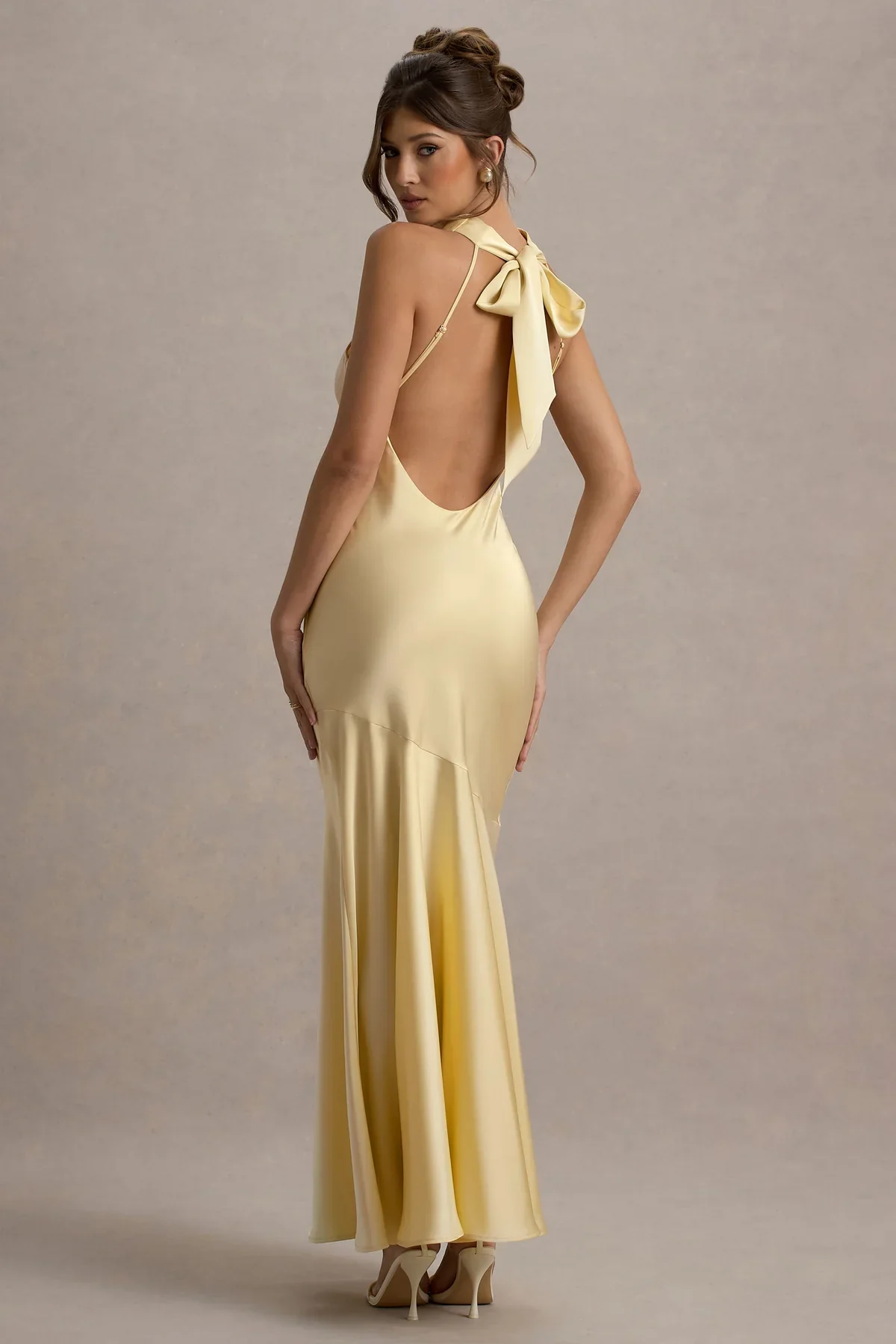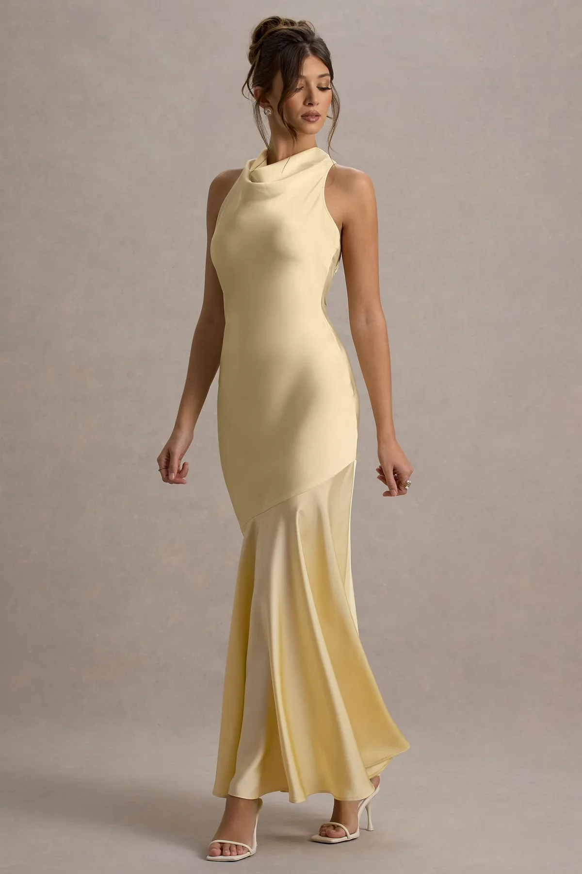 Un rayon de lumière traverse délicatement les plis dorés de la robe, évoquant une aurore douce sur une prairie. Le tissu en polyester suit la silhouette avec fluidité, épousant les courbes sans jamais contraindre, tandis que la coupe sirène sublime chaque mouvement. Le drapé asymétrique à l’encolure révèle une épaule, ajoutant une note d’audace raffinée. La fermeture discrète assure une ligne impeccable. Une robe pensée pour magnifier la féminité sans jamais la contraindre.