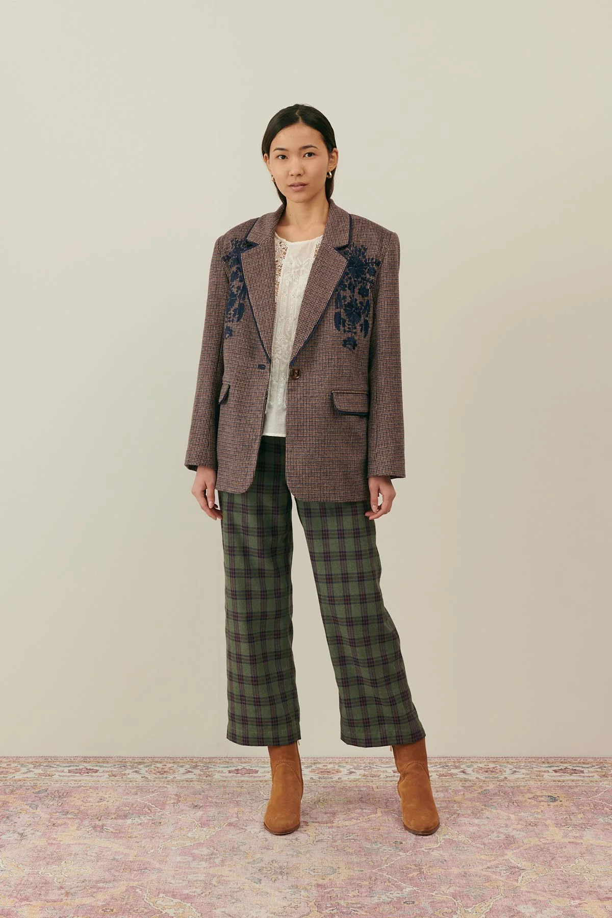La créatrice revisite avec douceur le pantalon façon “grand-père”, tout droit sorti des années 50 ! On adore le porter avec la veste Maura assortie pour un total look à carreaux au style affirmé.