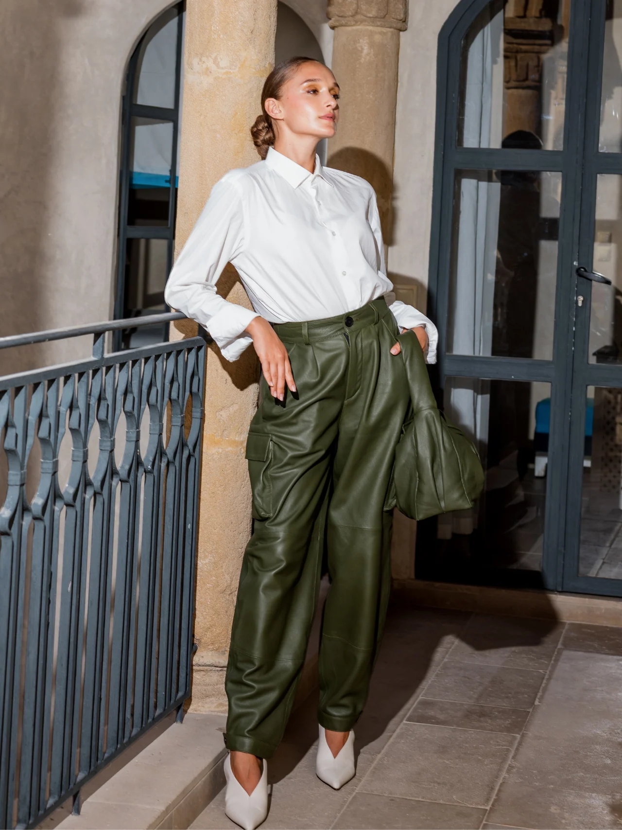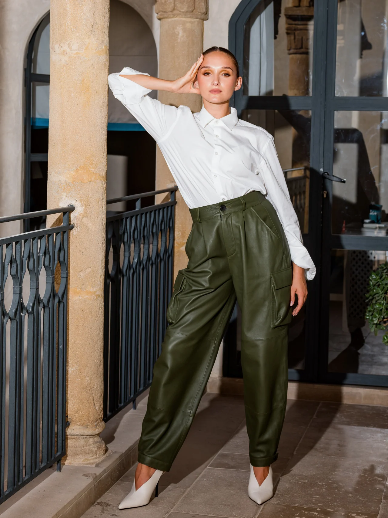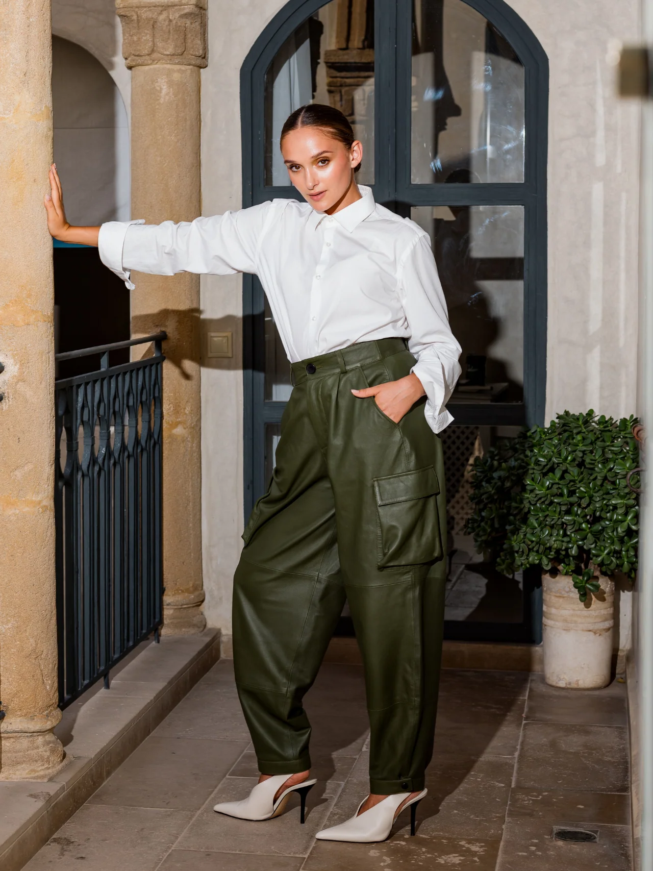 Le pantalon en cuir cargo est doté d’une taille haute et d’une coupe slouchy pour un look structuré et urbain.