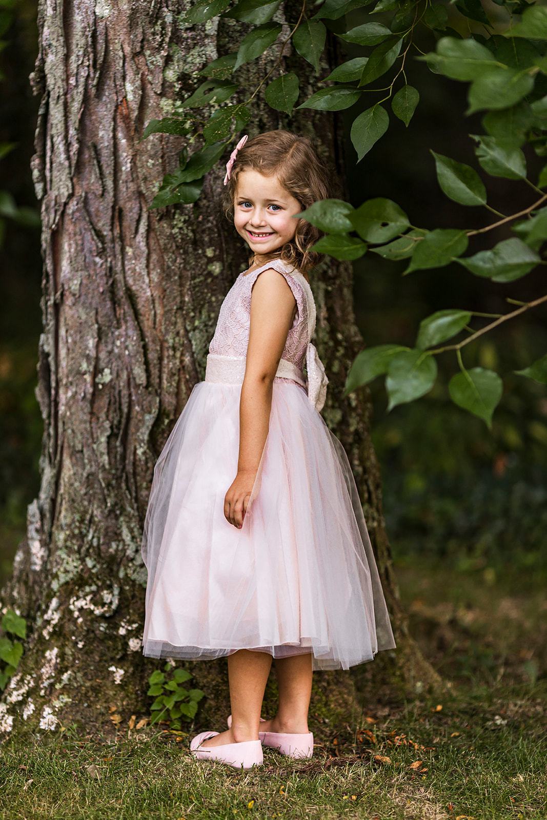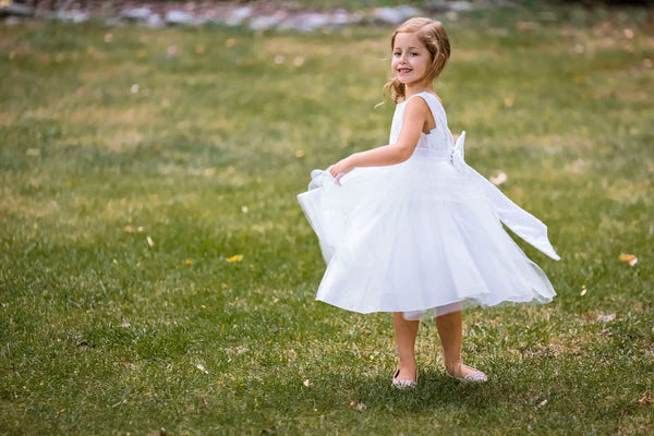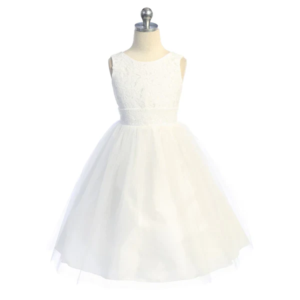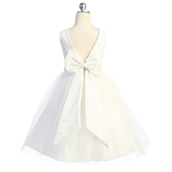 Corsage en dentelle sans manches avec couches de jupe en tulle et bordure à sequins à la taille. Le dos du corsage a un V accentué de sequins. La robe est finie avec un nœud à sequins dans le dos.