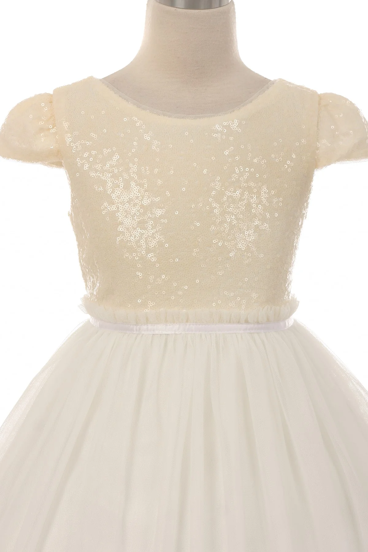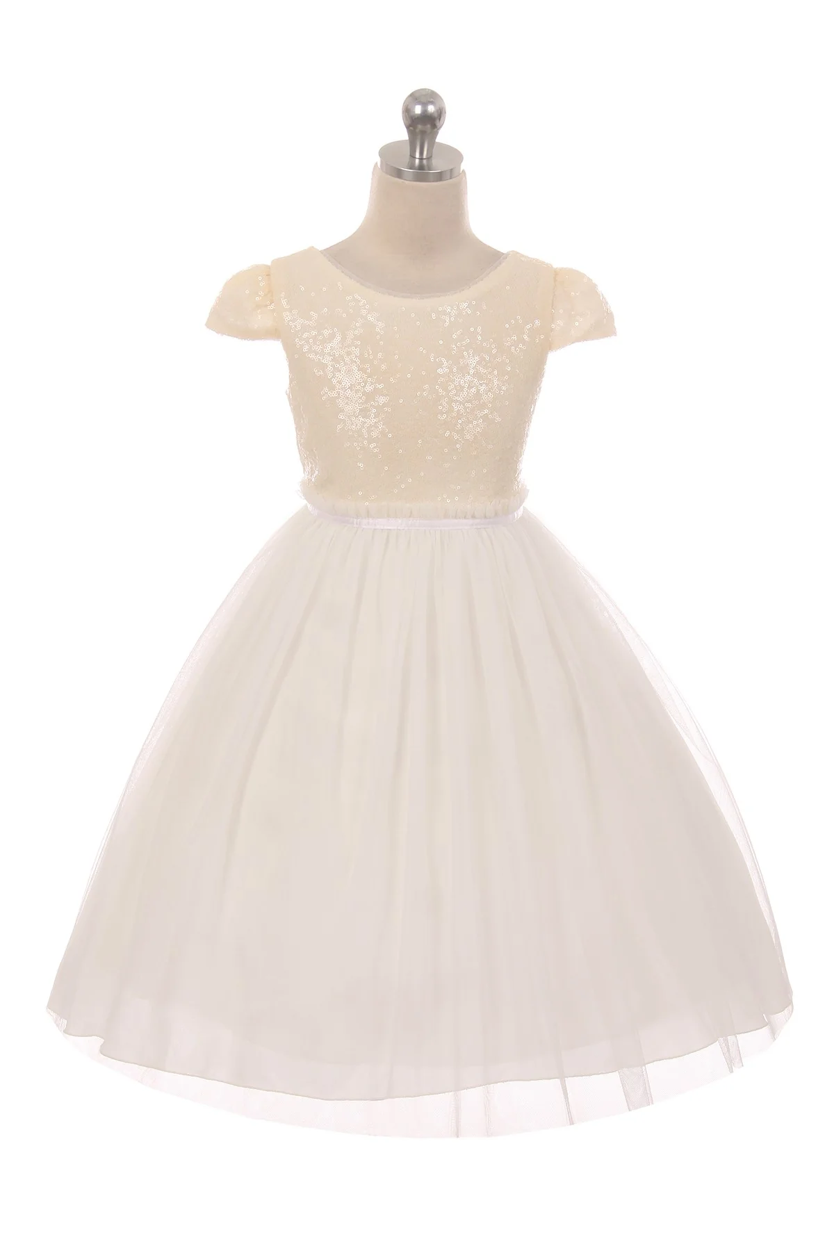 La robe de filles en maille plissée à paillettes est une robe de corsage à paillettes fantaisie avec des mancherons et une bordure en mesh sur le décolleté. La jupe a des couches de mesh douce et est plissée à la taille. La robe de filles en mesh plissée à paillettes est parfaite pour toute occasion spéciale ou Flower Girls!
