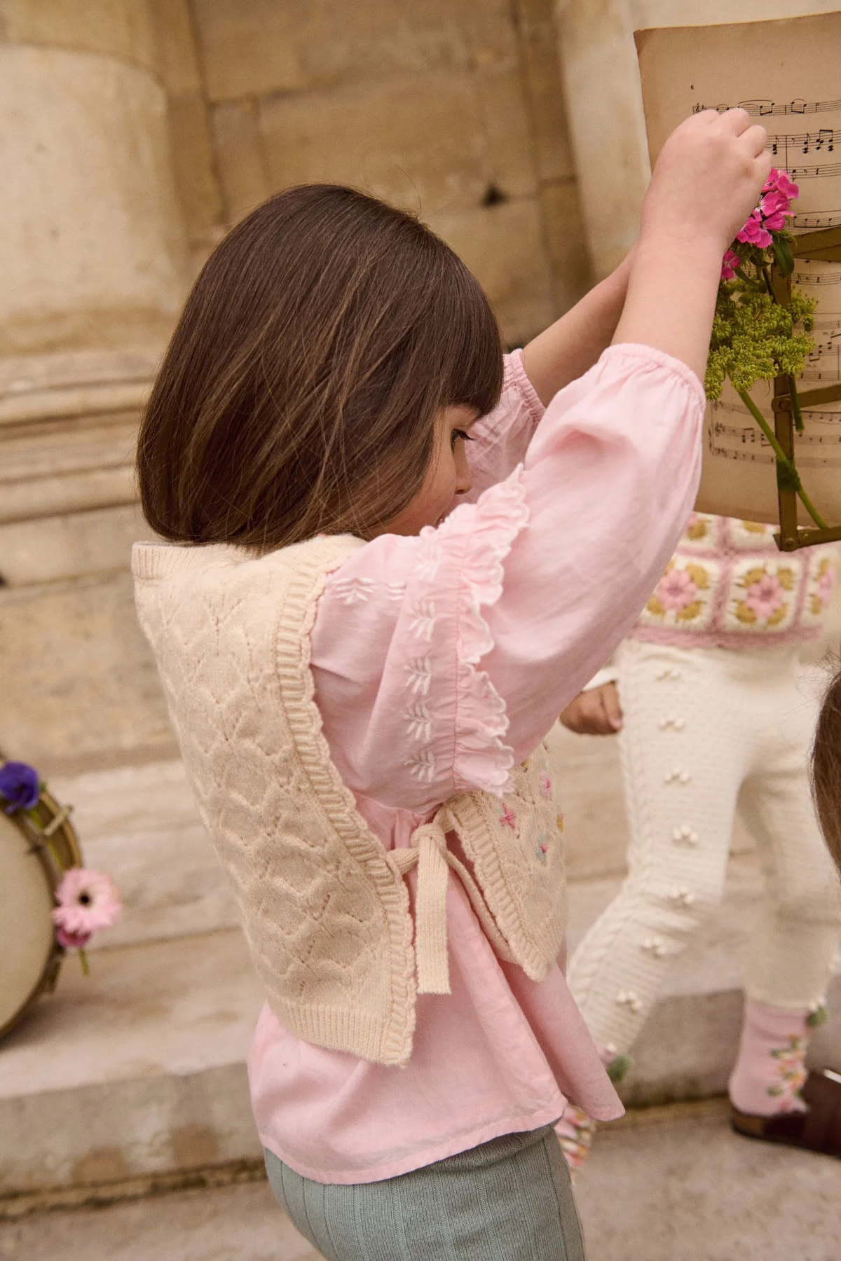 - Broderies faites main en all-over sauf dos. Petits liens à nouer sur les côtés. Finitions festonnées crochetées à la main sur les côtés.