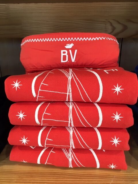 Flocage écru au niveau du revers du col avec un B.V floqué au milieu et le logo pinasse
