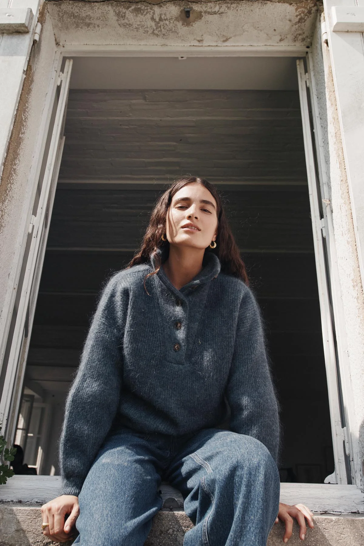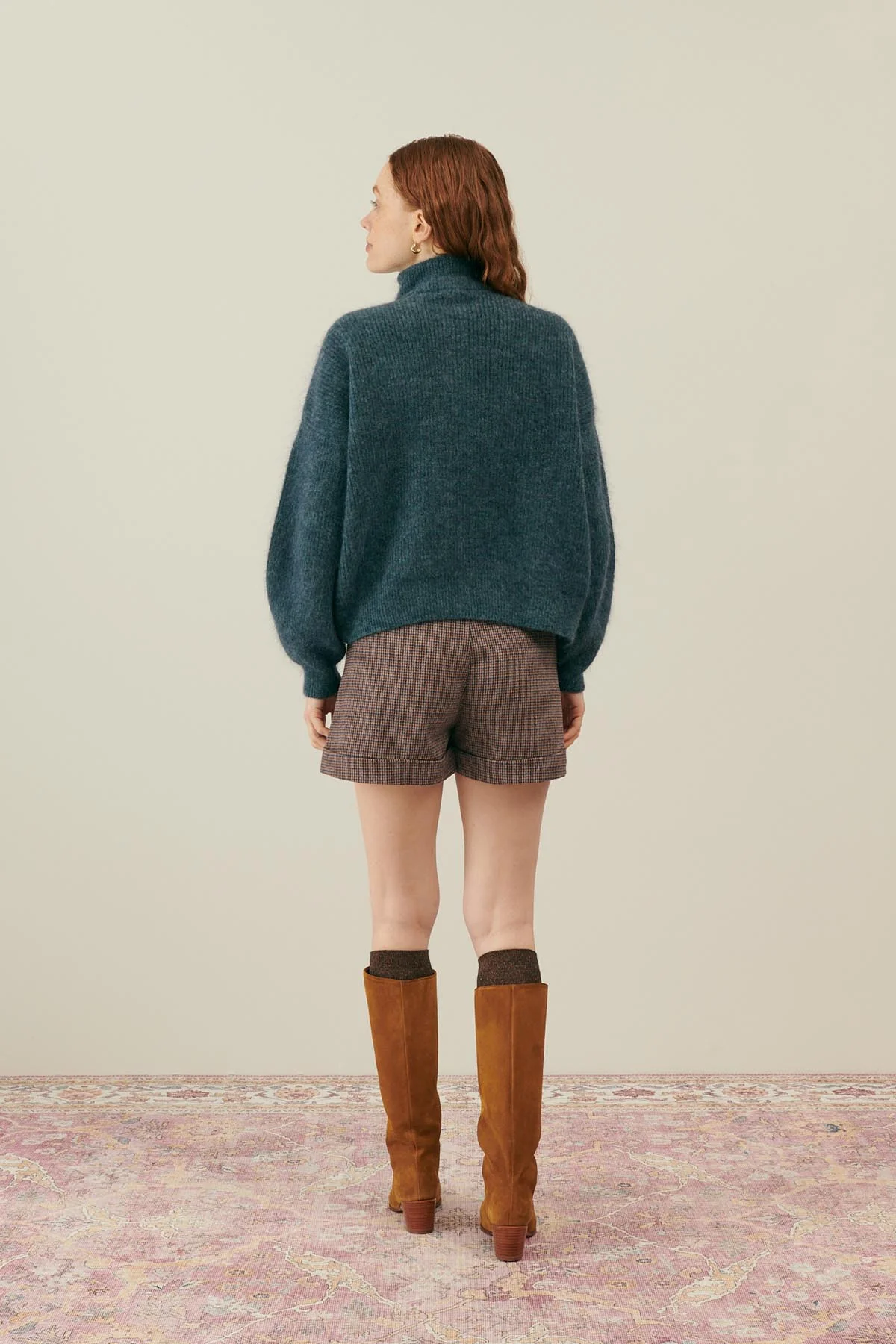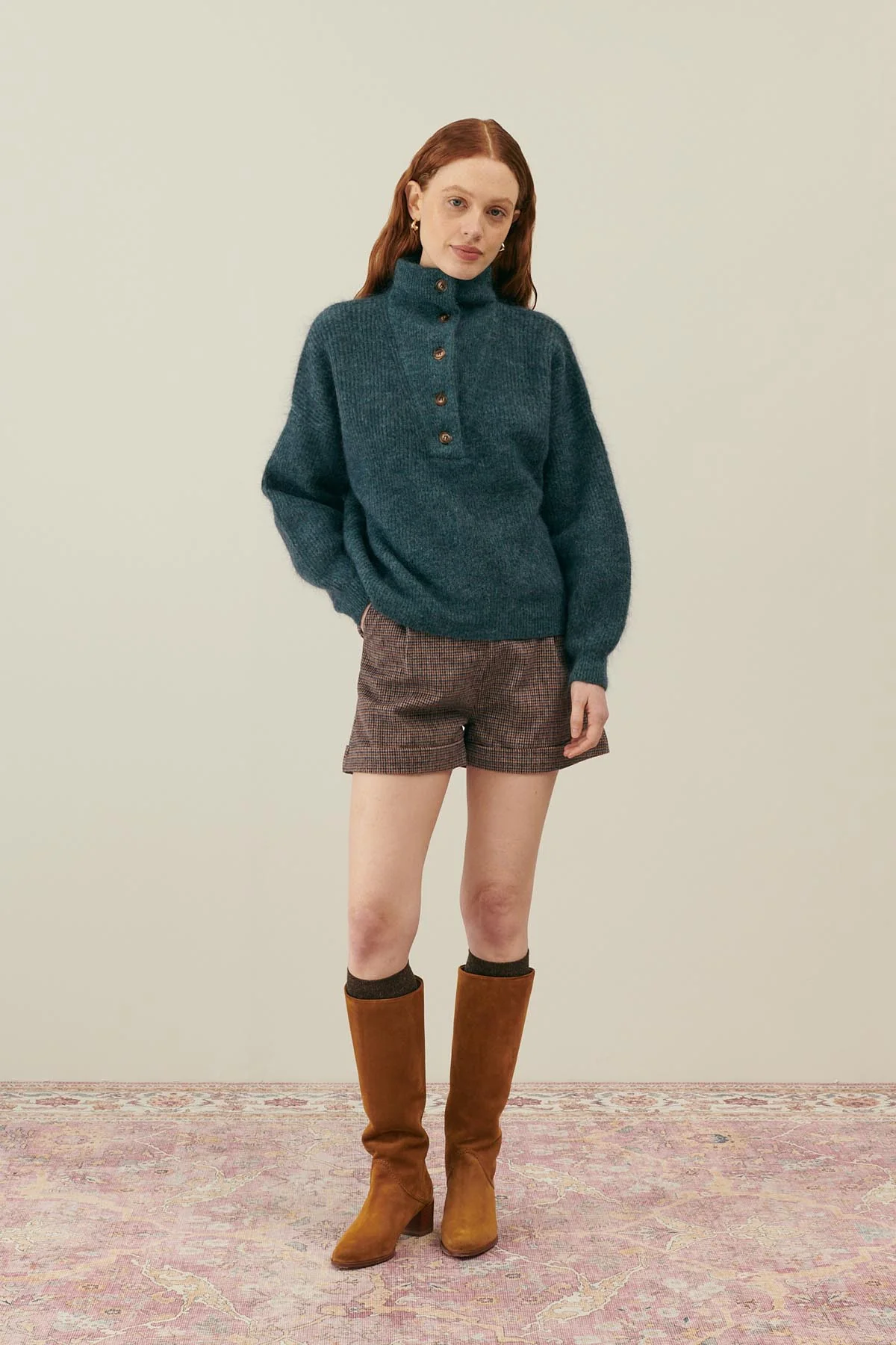 Ce pull à maille épaisse en mélange de laine et mohair est comme un nid douillet bien chaud. Avec son col camionneur, il offre style et caractère tout en étant une pièce décontractée qu’on peut porter tous les jours, encore et encore, surtout lorsqu’on part en vadrouille d’hiver.