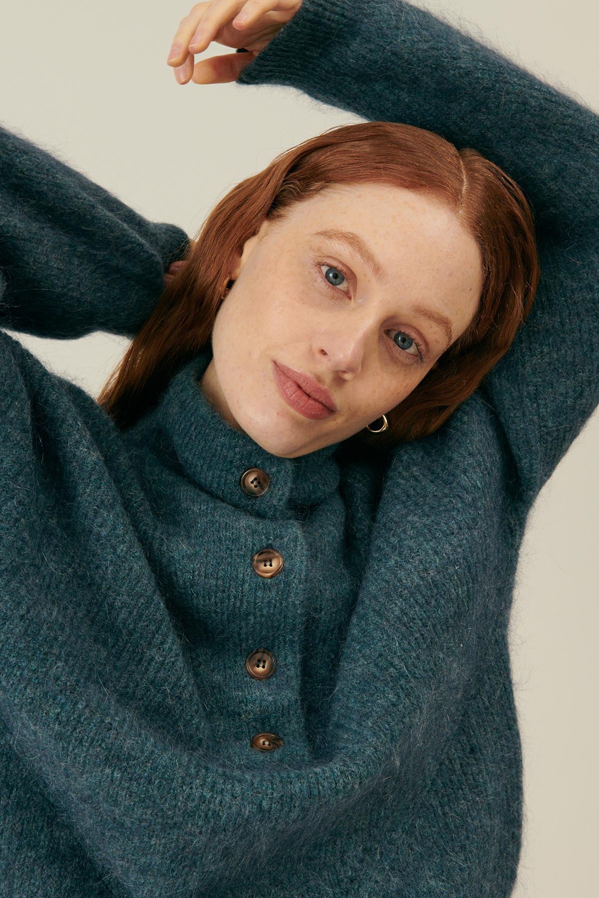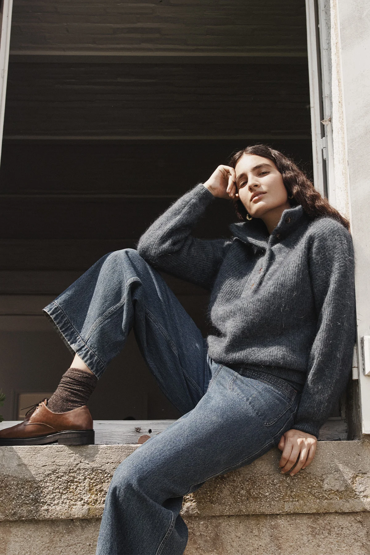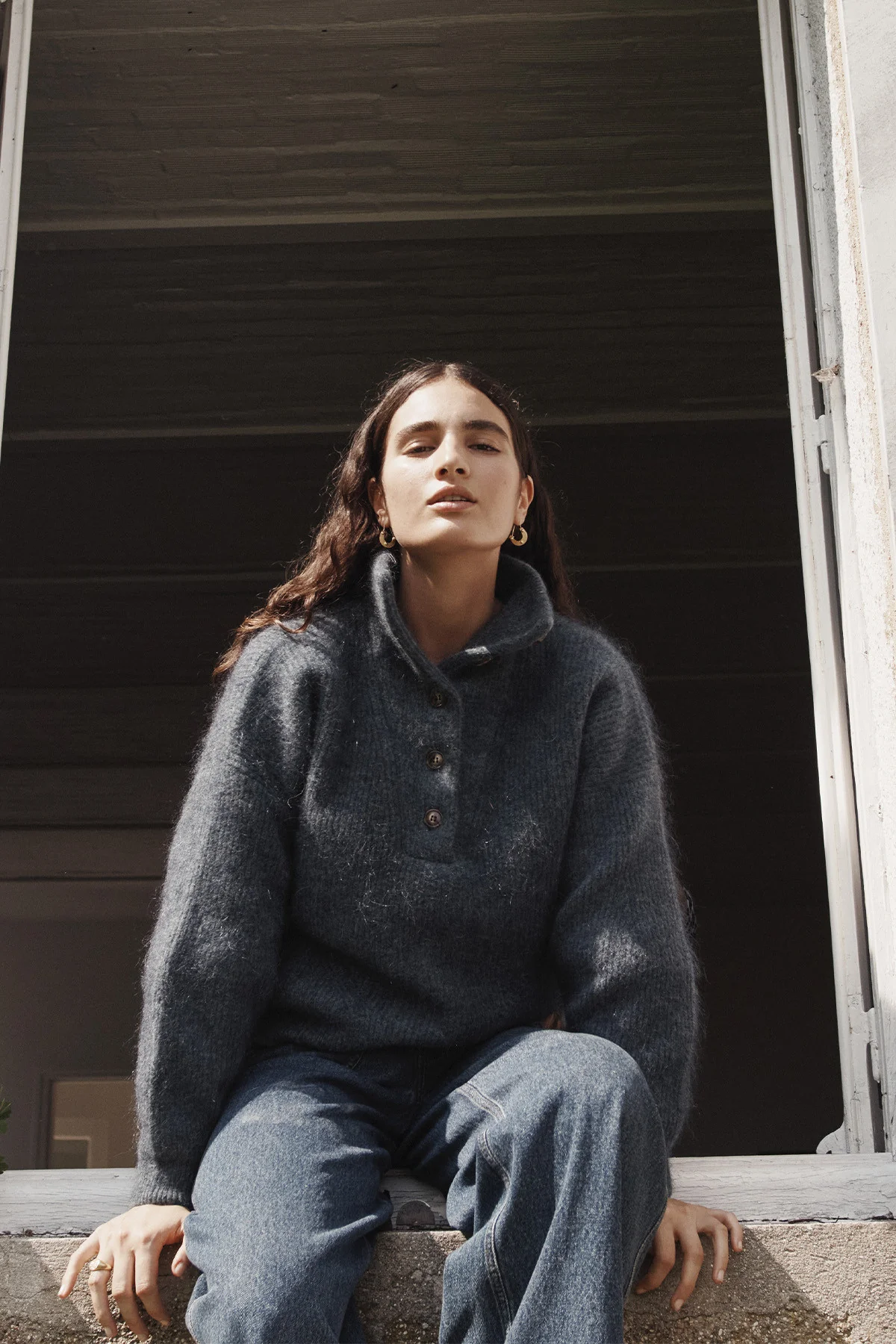 Ce pull à maille épaisse en mélange de laine et mohair est comme un nid douillet bien chaud. Avec son col camionneur, il offre style et caractère tout en étant une pièce décontractée qu’on peut porter tous les jours, encore et encore, surtout lorsqu’on part en vadrouille d’hiver.