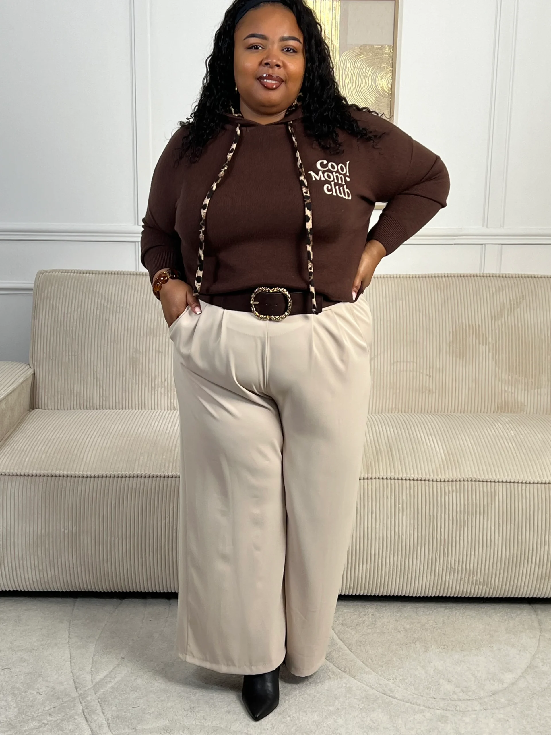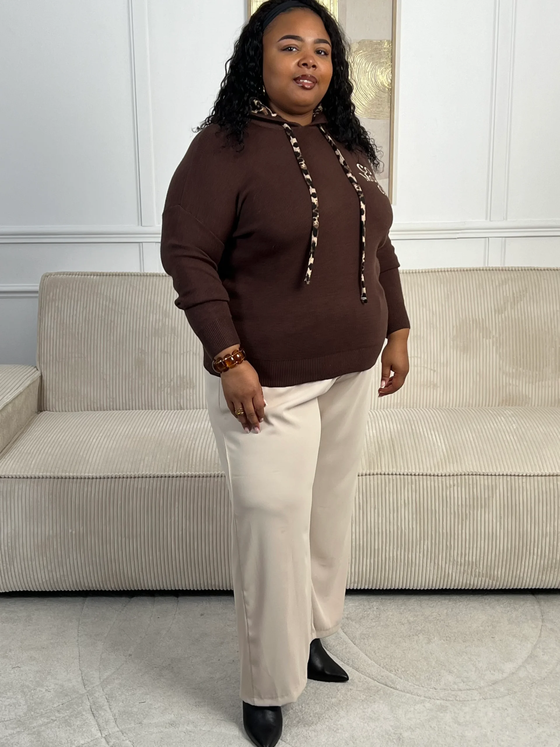 Rejoignez le « Cool mom club » avec notre pull marron à capuche Naelya. Les cordons léopards apportent une touche de style, tandis que l’intérieur léopard de la capuche vous garde au chaud. Les manches longues vous offrent confort et praticité.