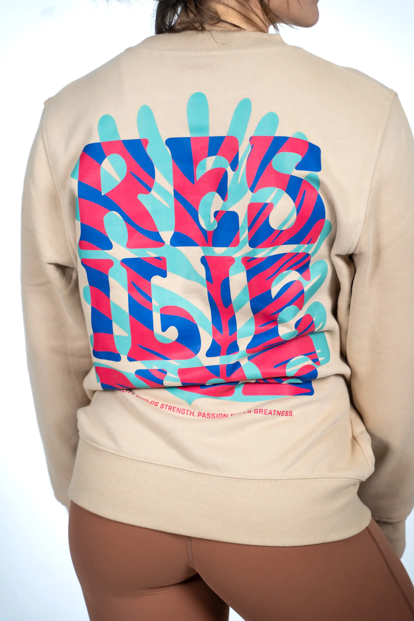 Le pull Ginga affiche le mot RESILIENCE en grand, dans un style moderne et coloré. Les teintes vives bleu, rose et turquoise donnent une énergie estivale et positive, à l’image des athlètes qui avancent avec engagement et passion.