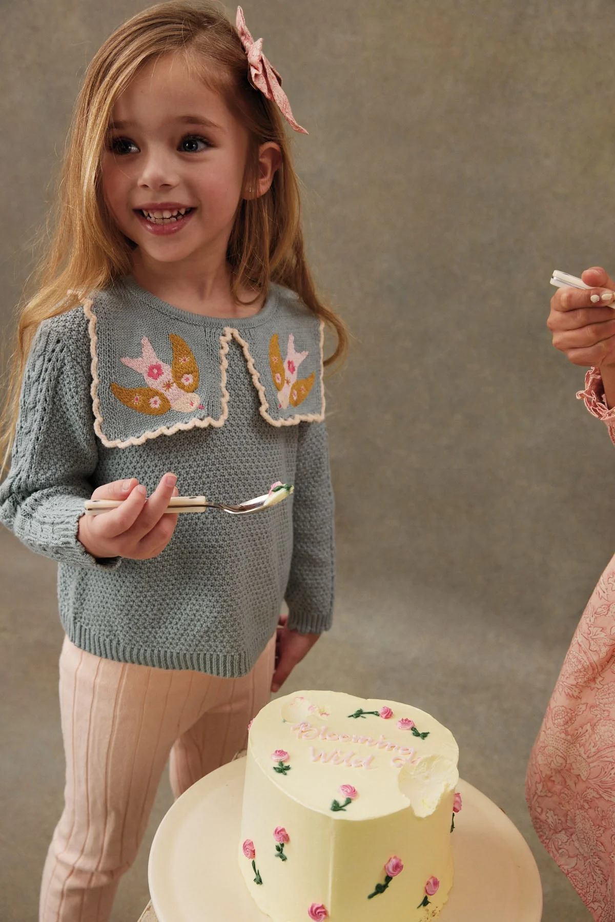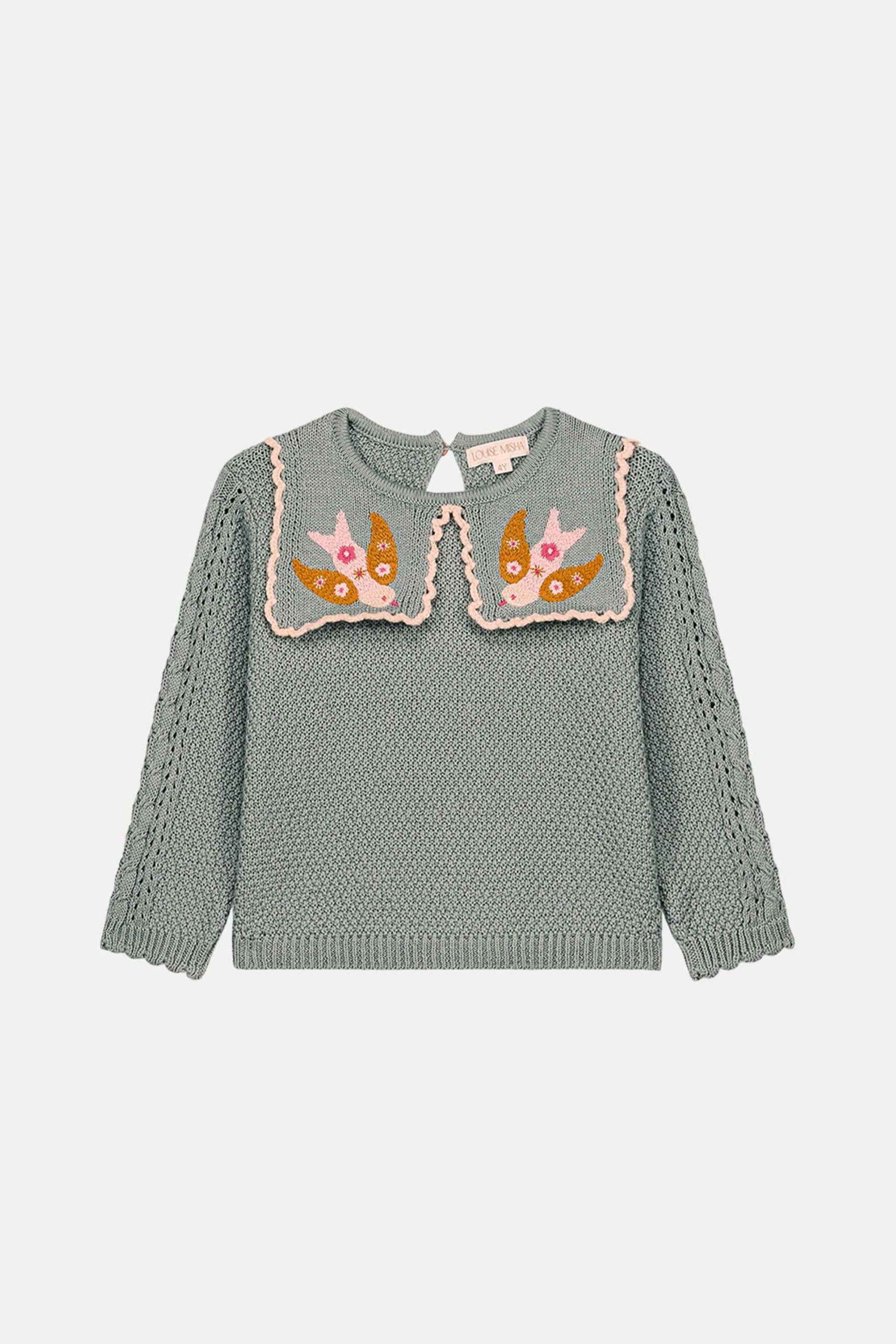 • Grand col carré orné de broderies et finitions crochetées à la main.