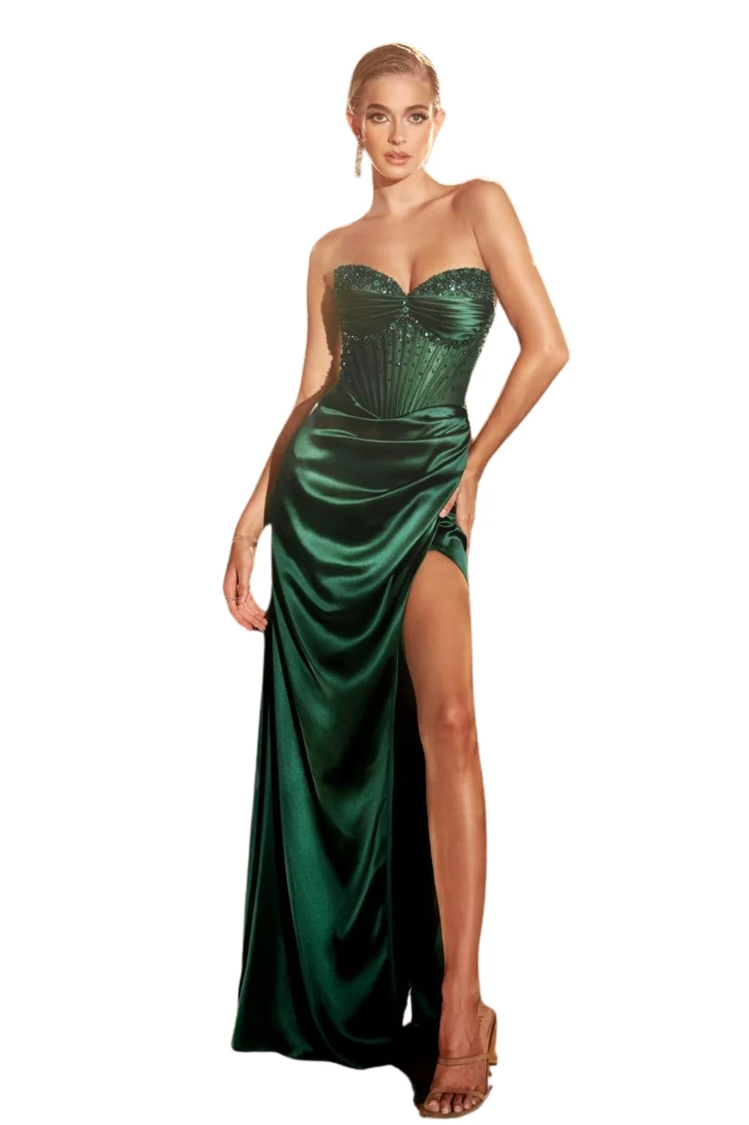 Éblouissante et sophistiquée, cette robe bustier en satin met en valeur la silhouette avec son corset semi-transparent richement orné de perles scintillantes. Le dos à laçage assure un ajustement parfait et ajoute une touche raffinée. La jupe fluide, drapée avec élégance, est sublimée par une fente audacieuse qui allie sensualité et modernité.