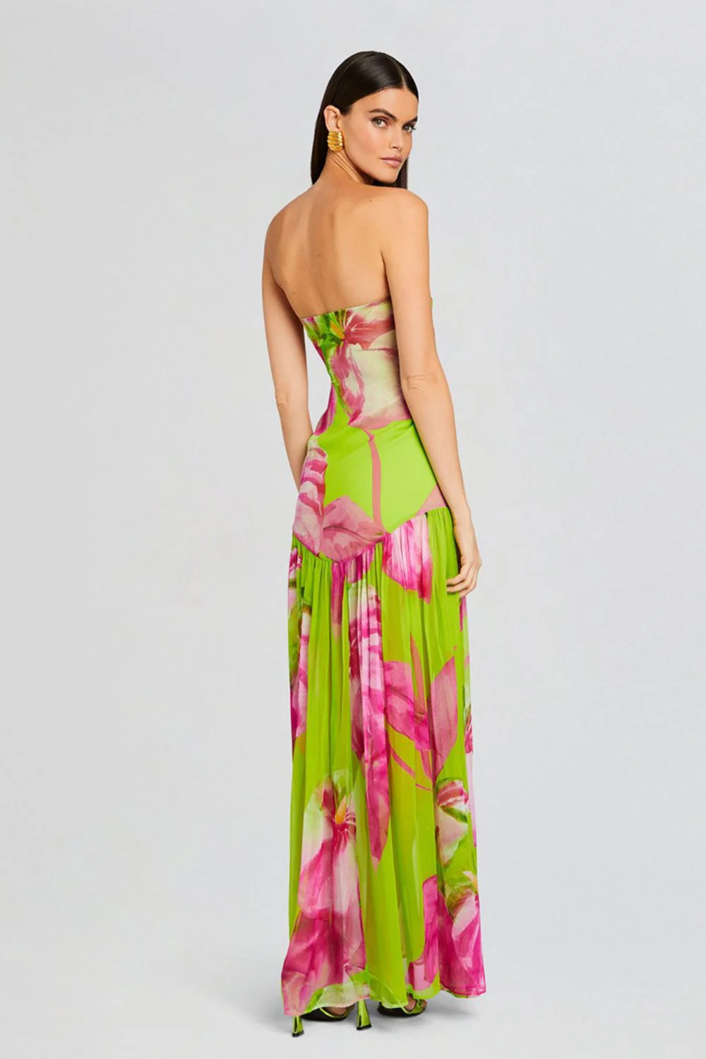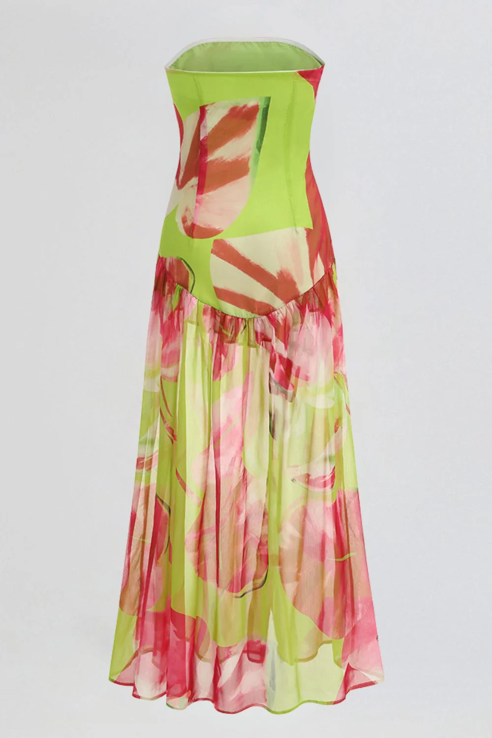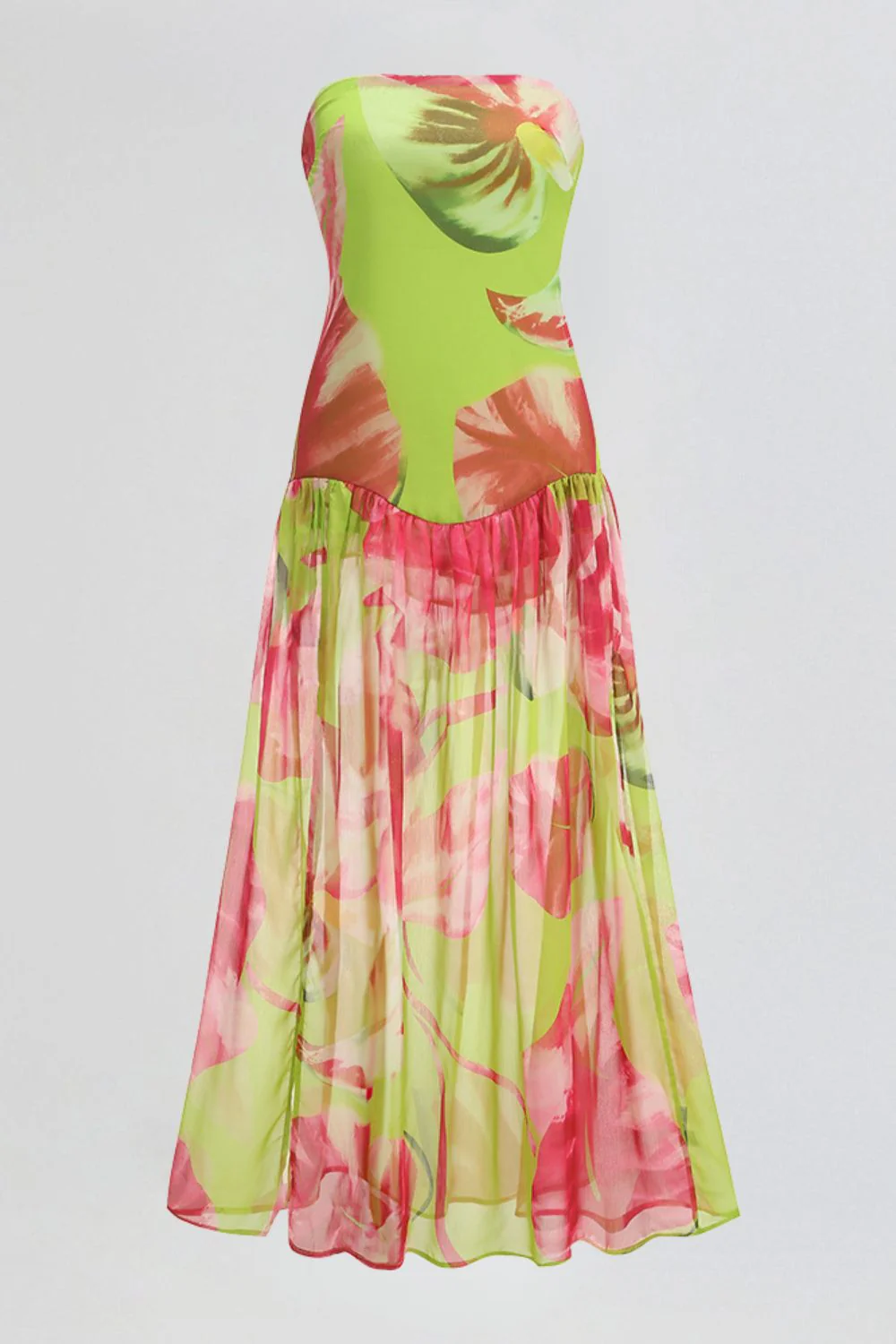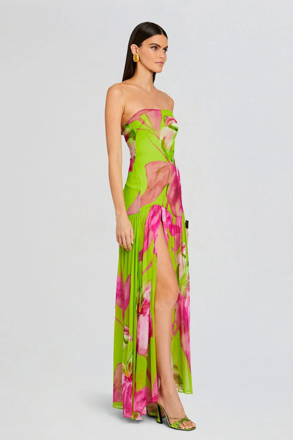 Cette robe bustier longue séduit par sa fluidité et son imprimé floral éclatant. Confectionnée en voile léger, elle présente un drapé structurant sur le buste et une fente haute qui dévoile la jambe avec subtilité.