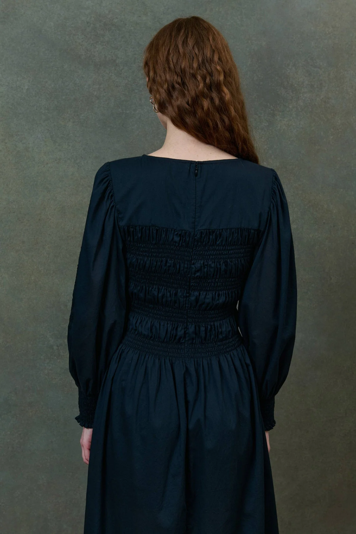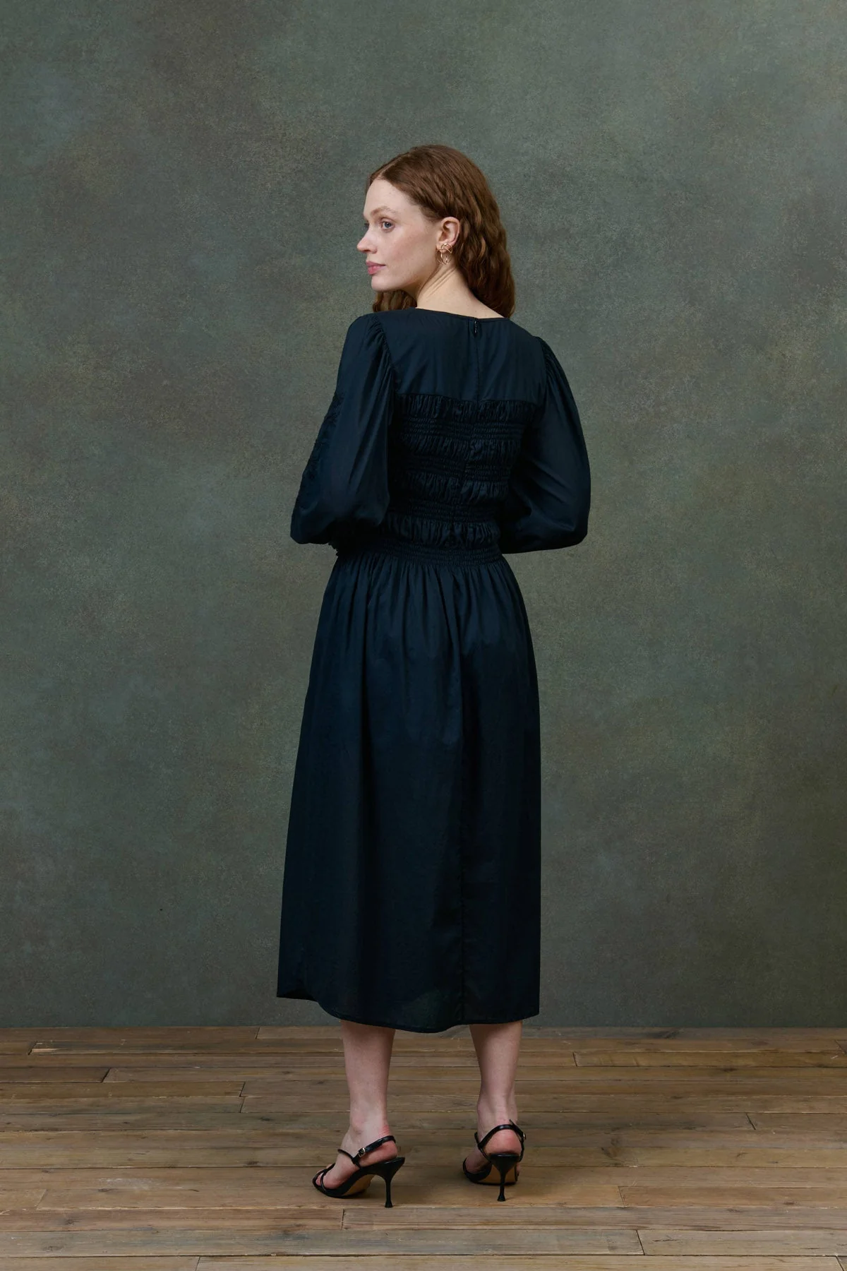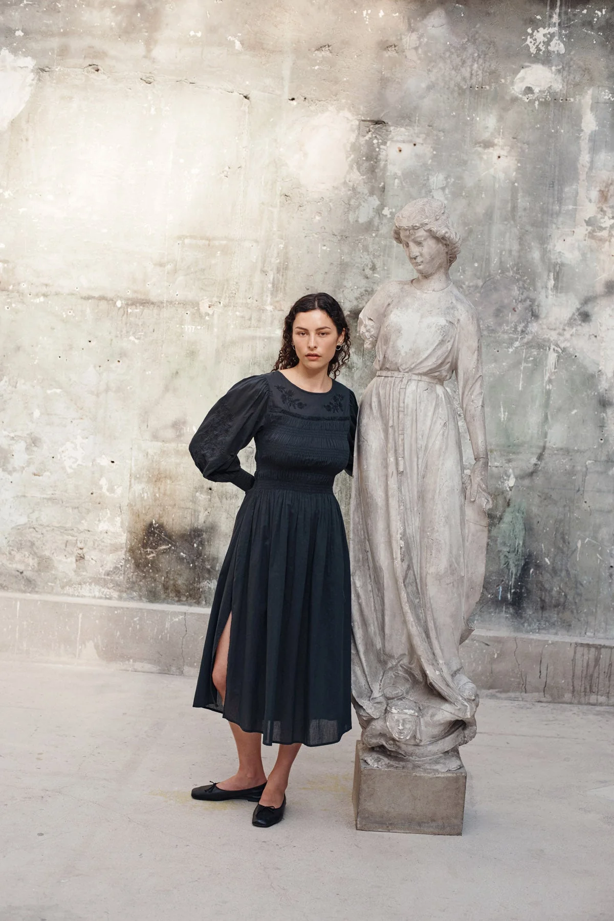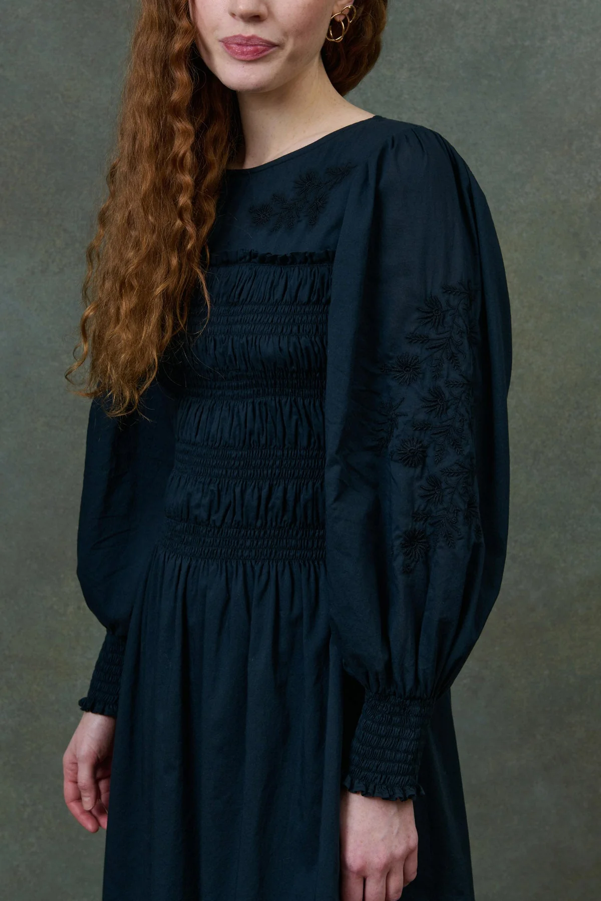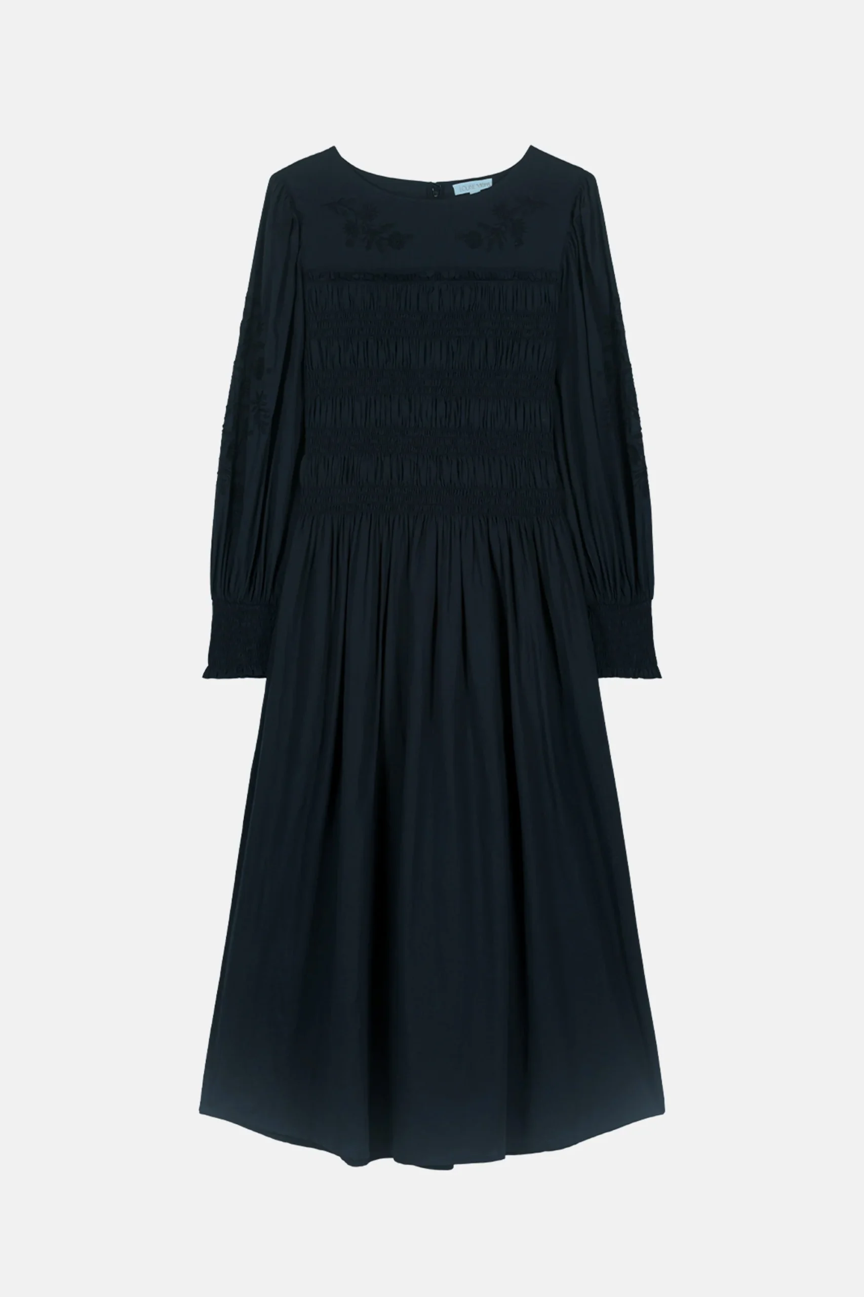 - Manches brodées ton sur ton avec poignets smockés et volantés.