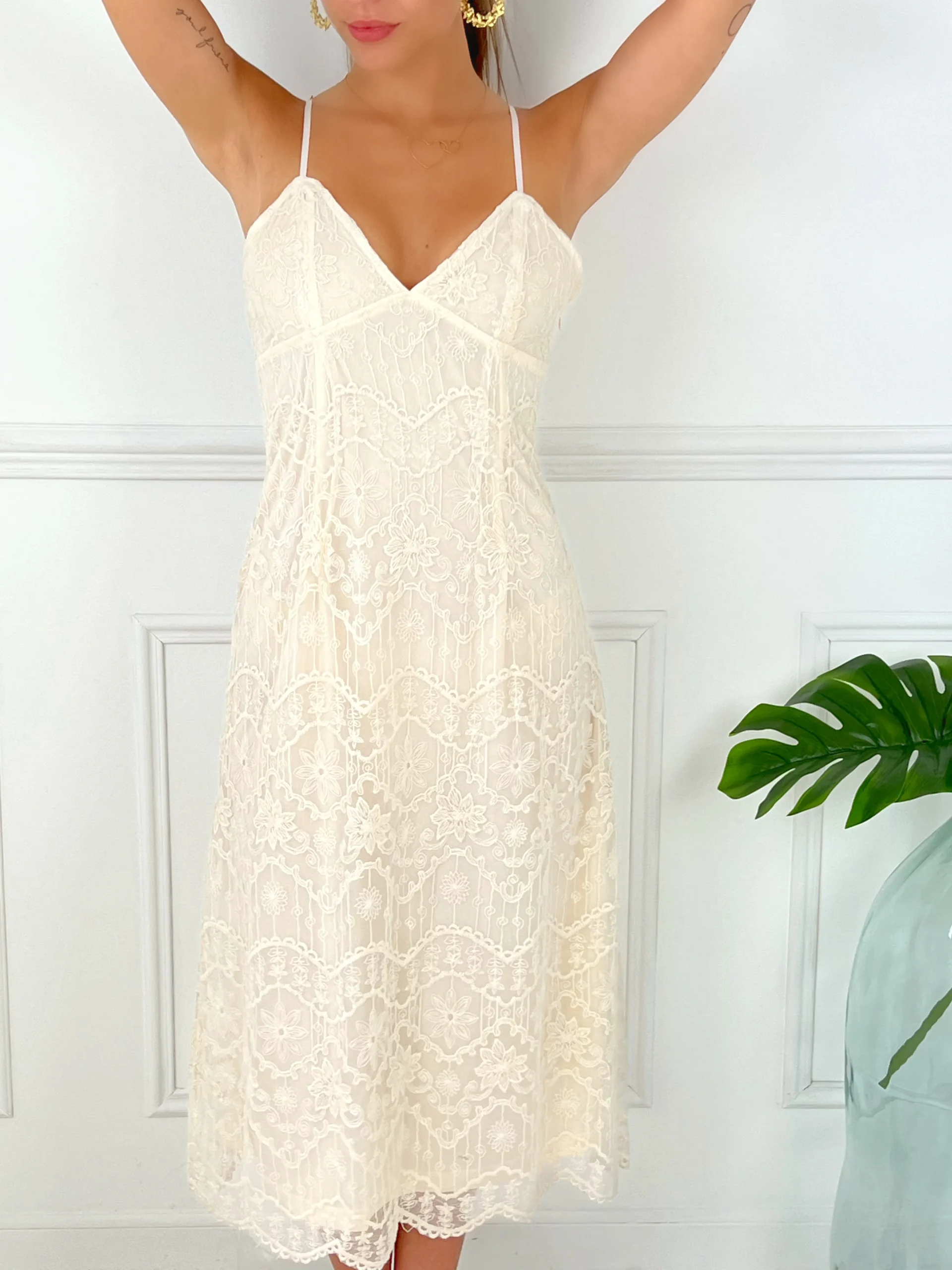 Une robe beige à bretelles avec des détails en dentelle combine élégance et féminité. Les bretelles ajoutent une touche délicate, tandis que la dentelle apporte une dimension romantique à la robe.