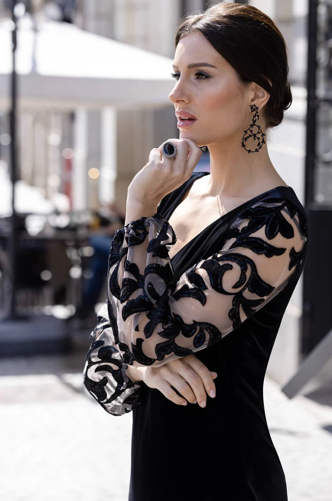 Tissée avec le plus doux velours noir, cette robe courte de soirée Lyman offre une silhouette élégante et sophistiquée pour toutes les occasions spéciales. Stylez la robe fourreau avec manches volumineuses en dévoré pour un look chic et raffiné qui est à la fois élégant et intemporel.