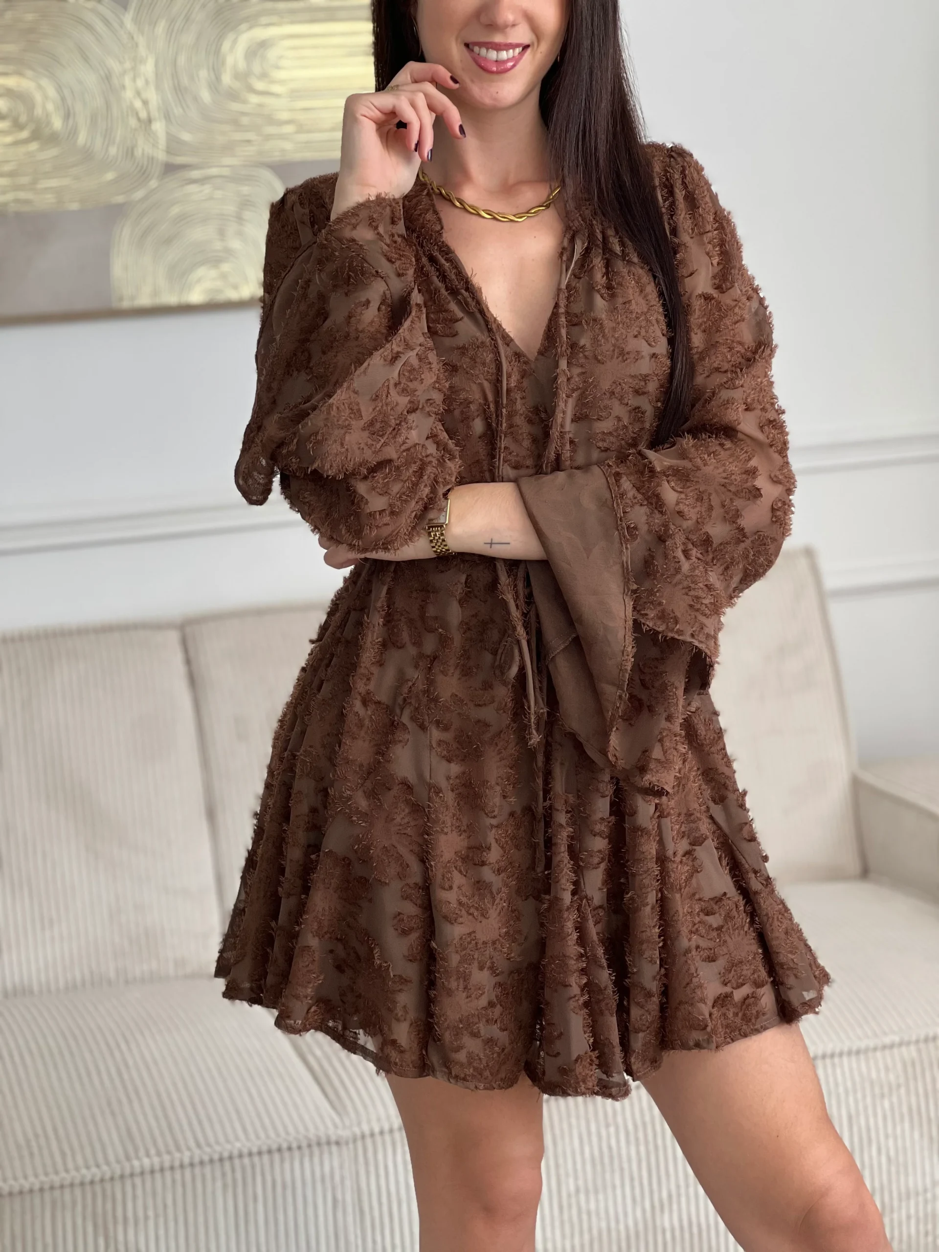 Délicate et féminine, cette robe marron clair séduit par ses volants élégants et son motif en relief au toucher doux. Une pièce pleine de charme, à la fois confortable et raffinée, parfaite pour toutes les occasions.