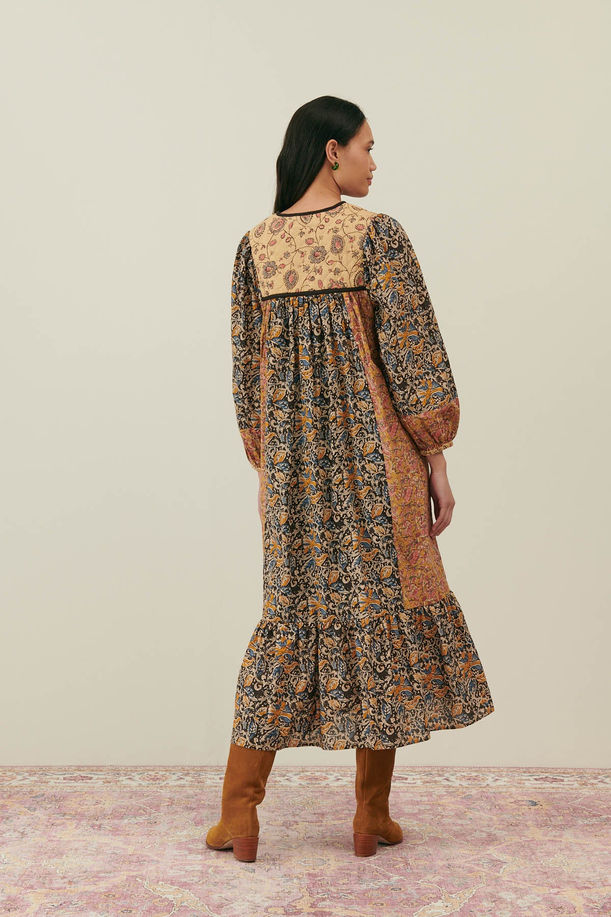 Cette robe est un modèle bohème par excellence qui mélange les styles et les époques. Sa forme d’inspiration folklorique mêle plusieurs imprimés traditionnels indiens ! Le tout en 100% coton, à porter dès la mi-saison.