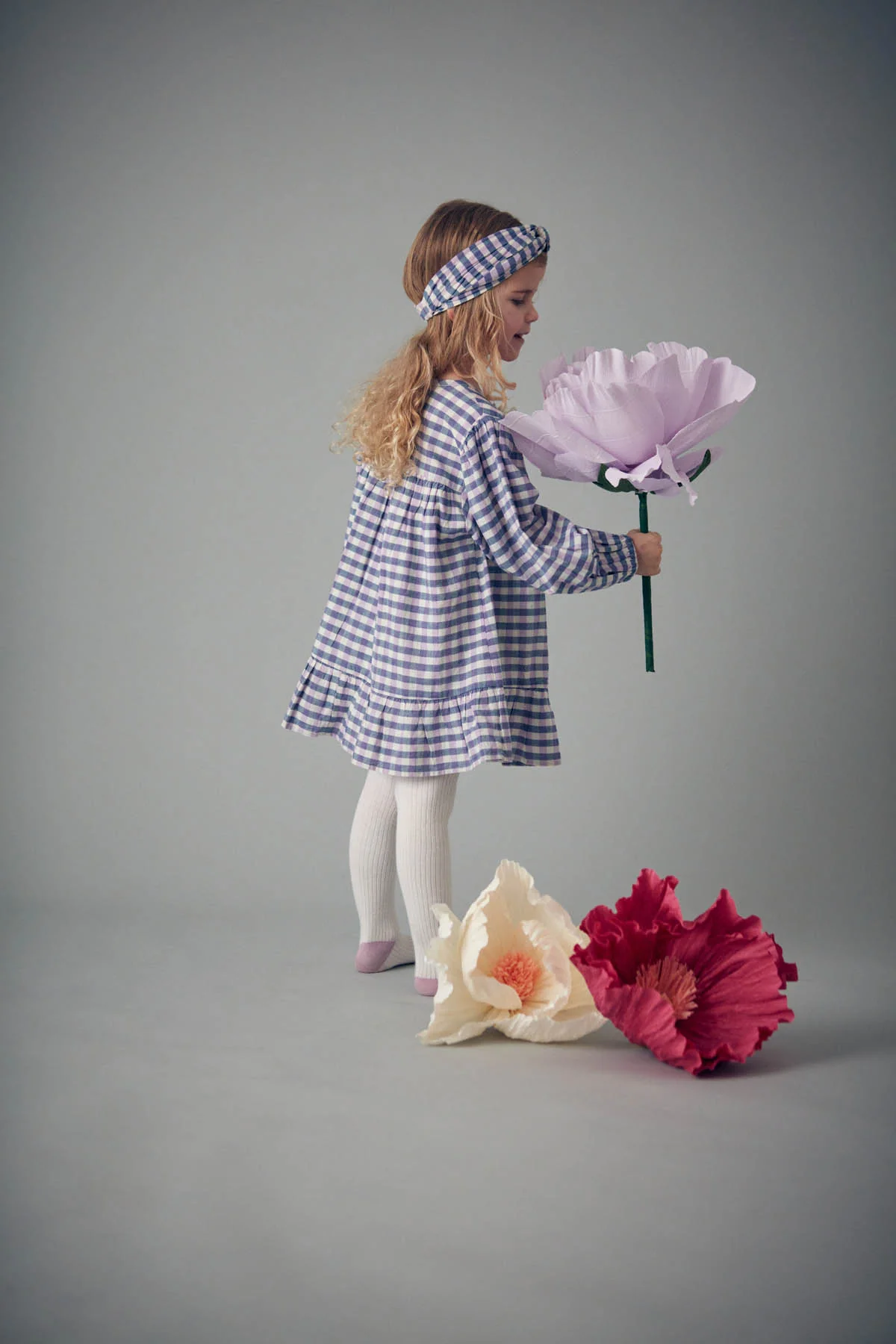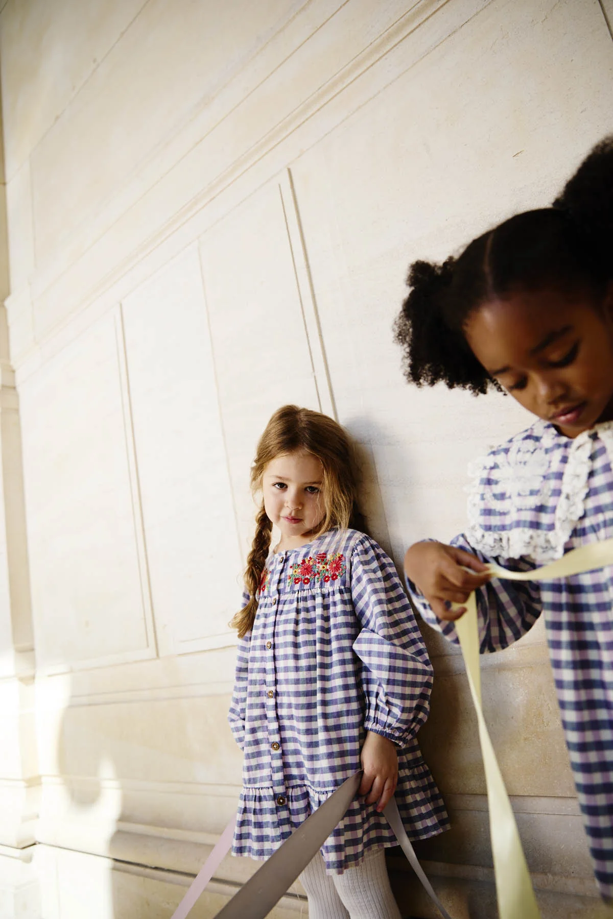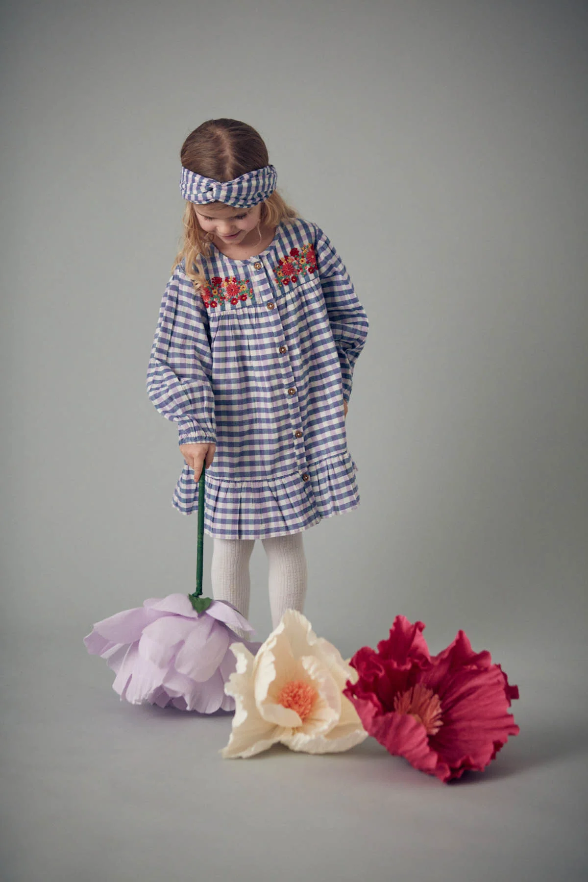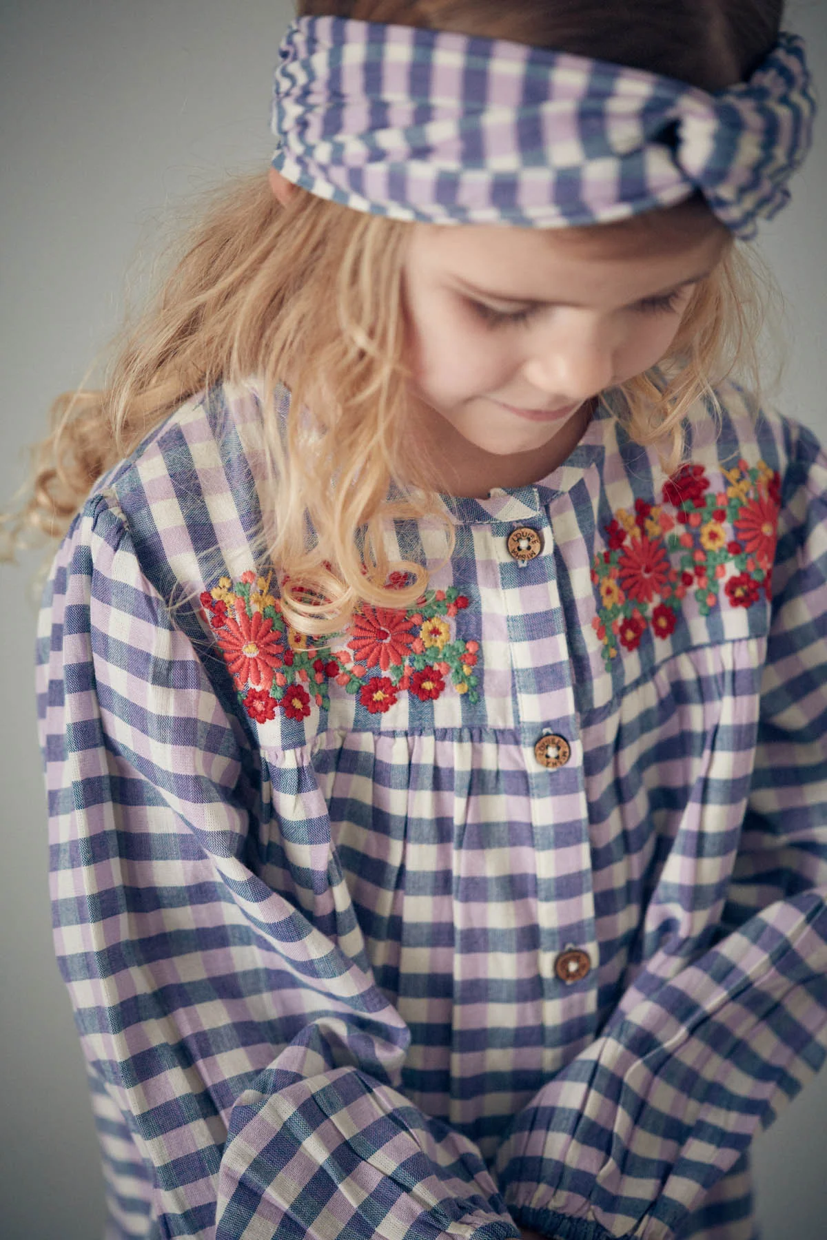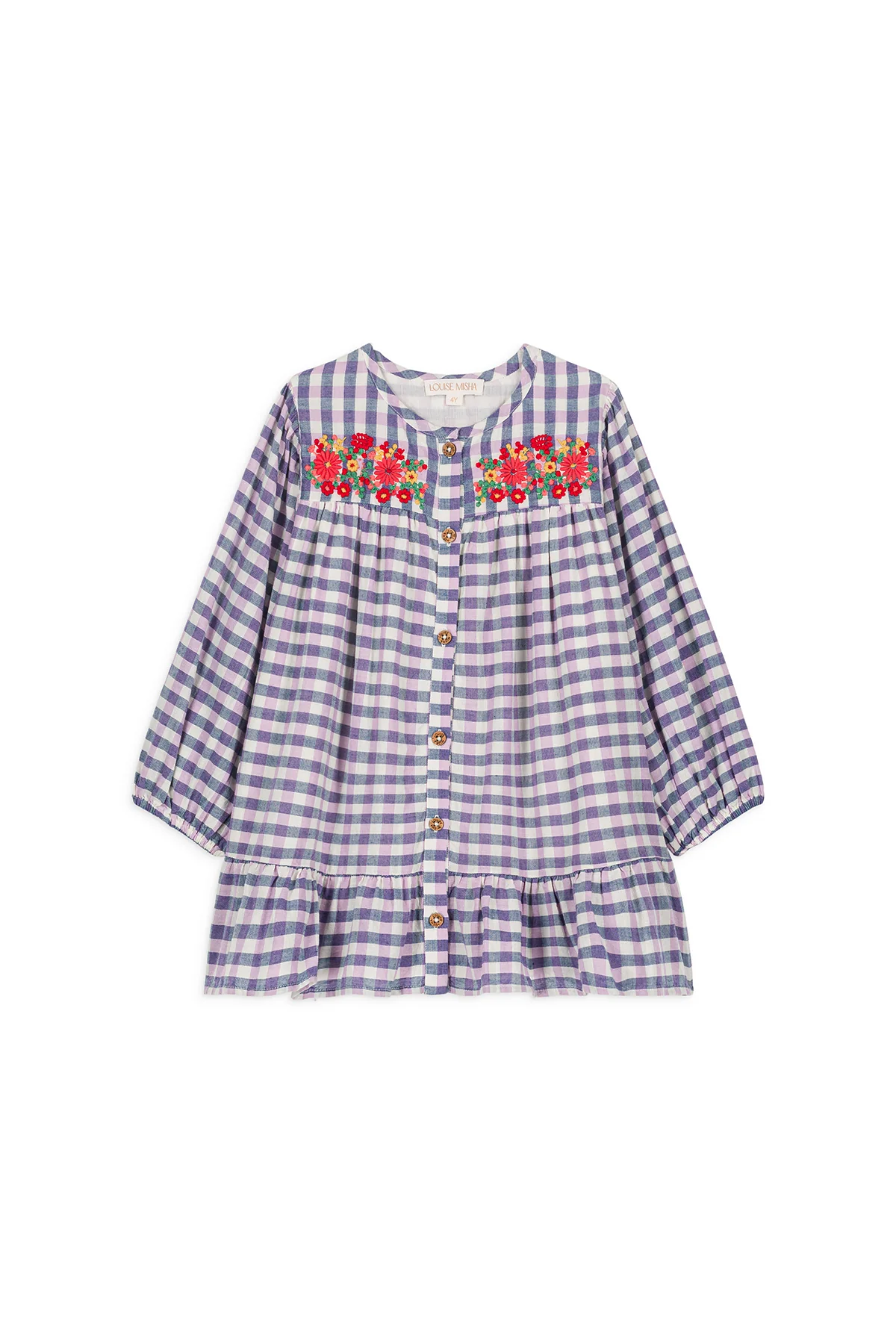 Les carreaux de la robe Massilia déploient leur charme d’autrefois et leur élégance rustique. Et les fleurs ne sont jamais loin : brodées sur le plastron, elles apportent une touche de poésie !