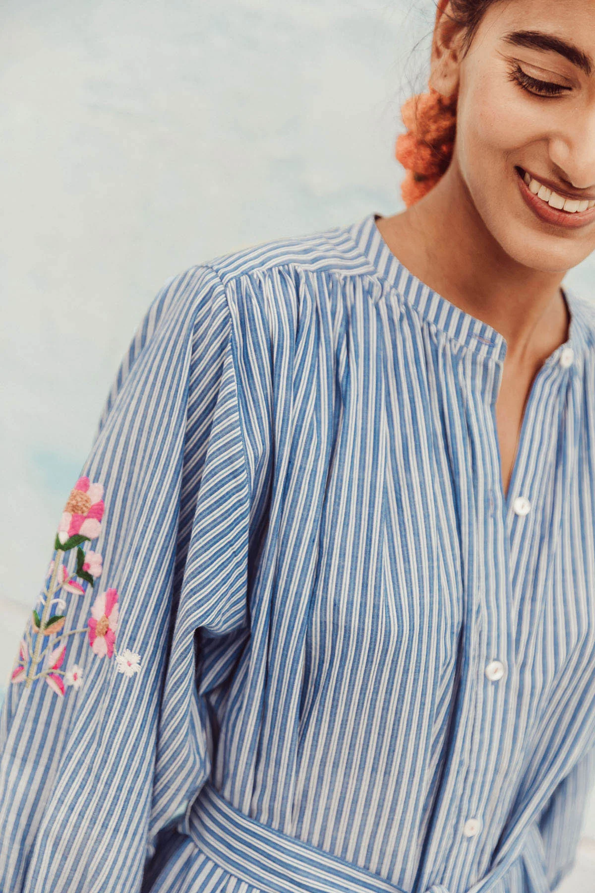 - Manches bouffantes ornées de broderies faites main et poignets volantés avec bouton.