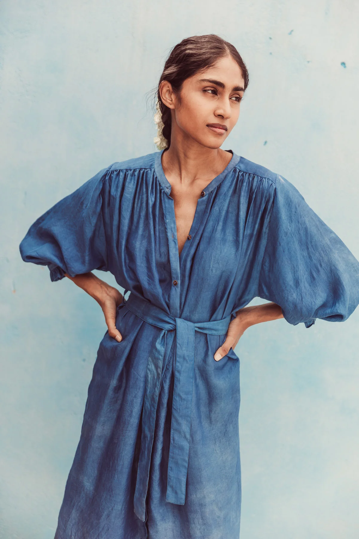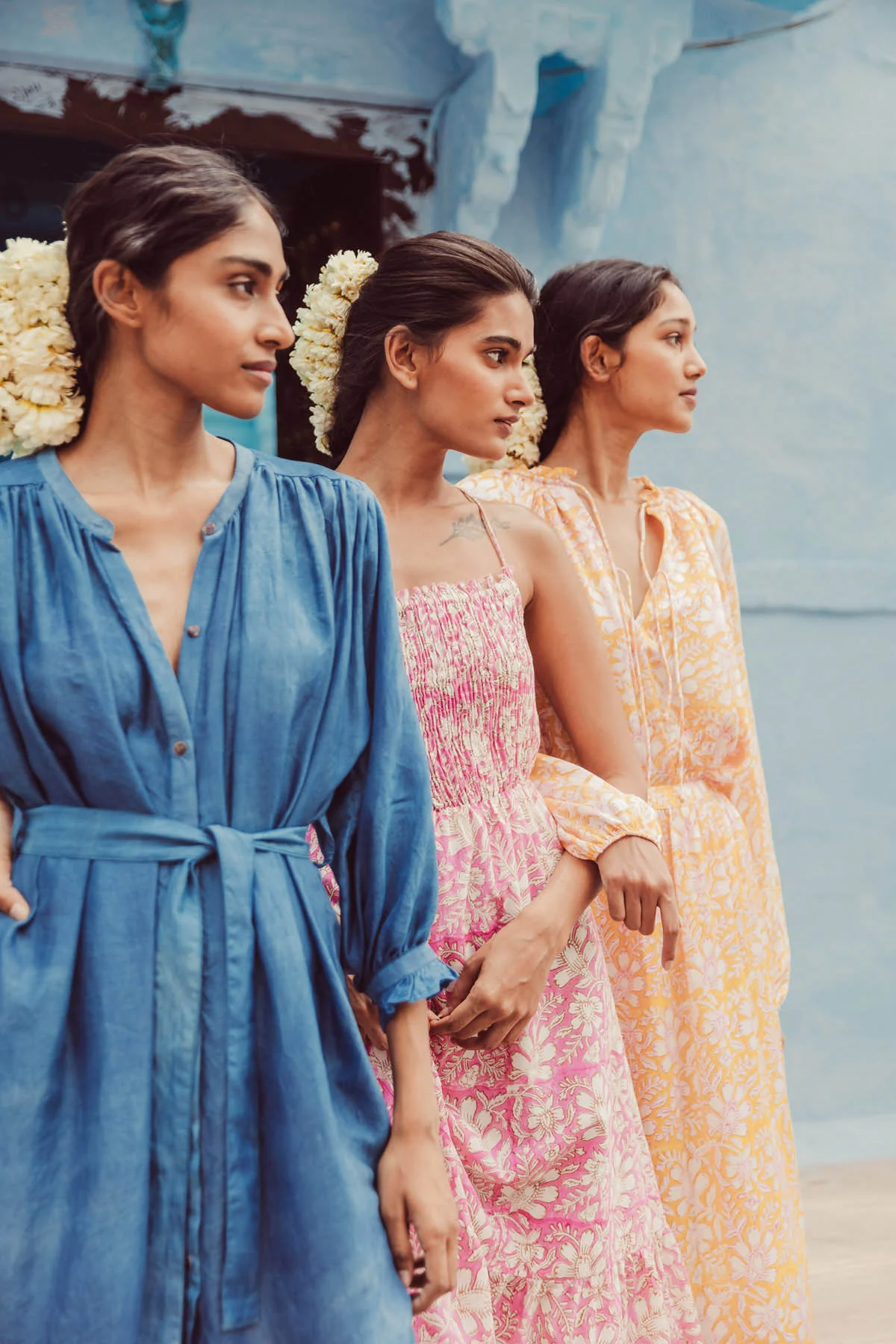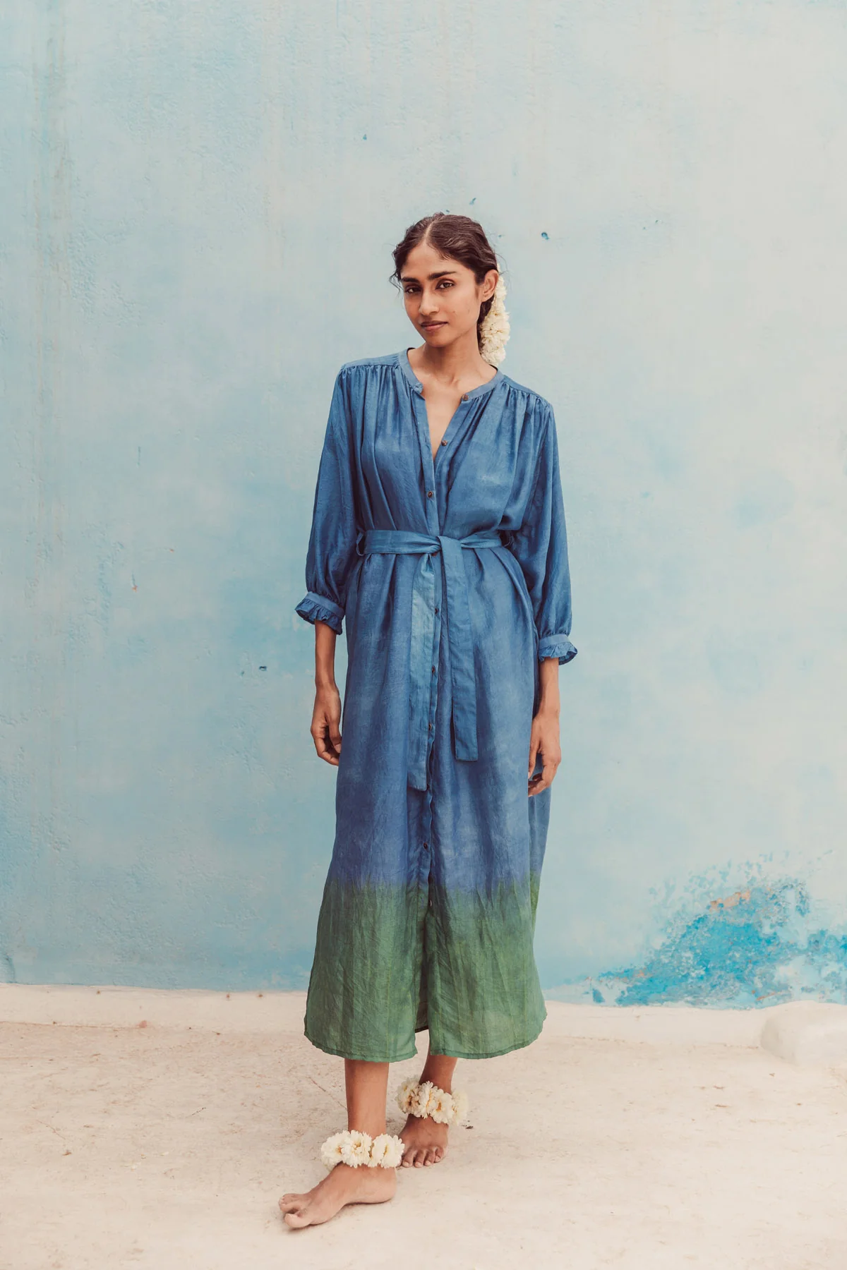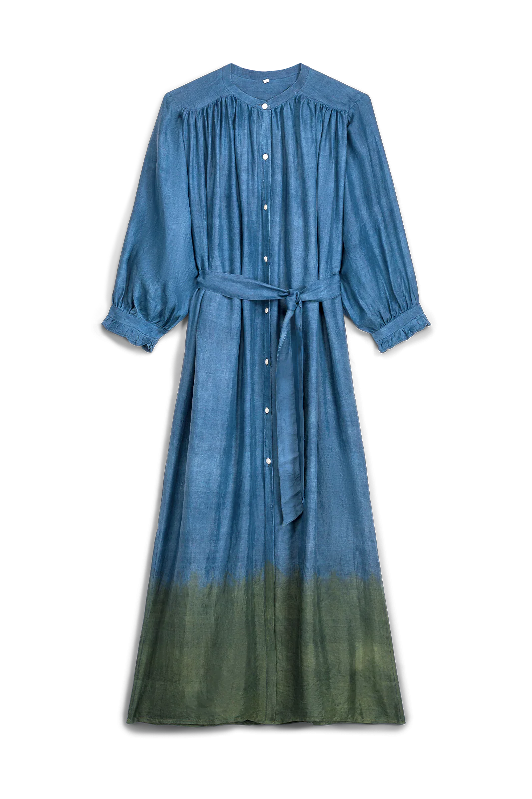 - Cette robe a d’abord été teinte entièrement avec de l’indigo naturel, puis le bas a été plongé à la main dans une teinture de marigolds, permettant à la couleur de monter progressivement.
