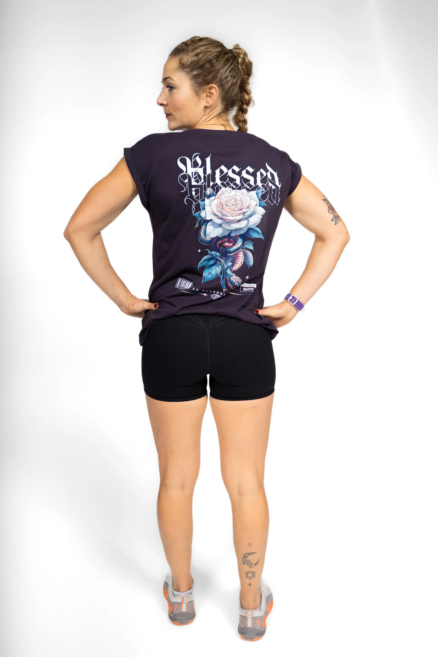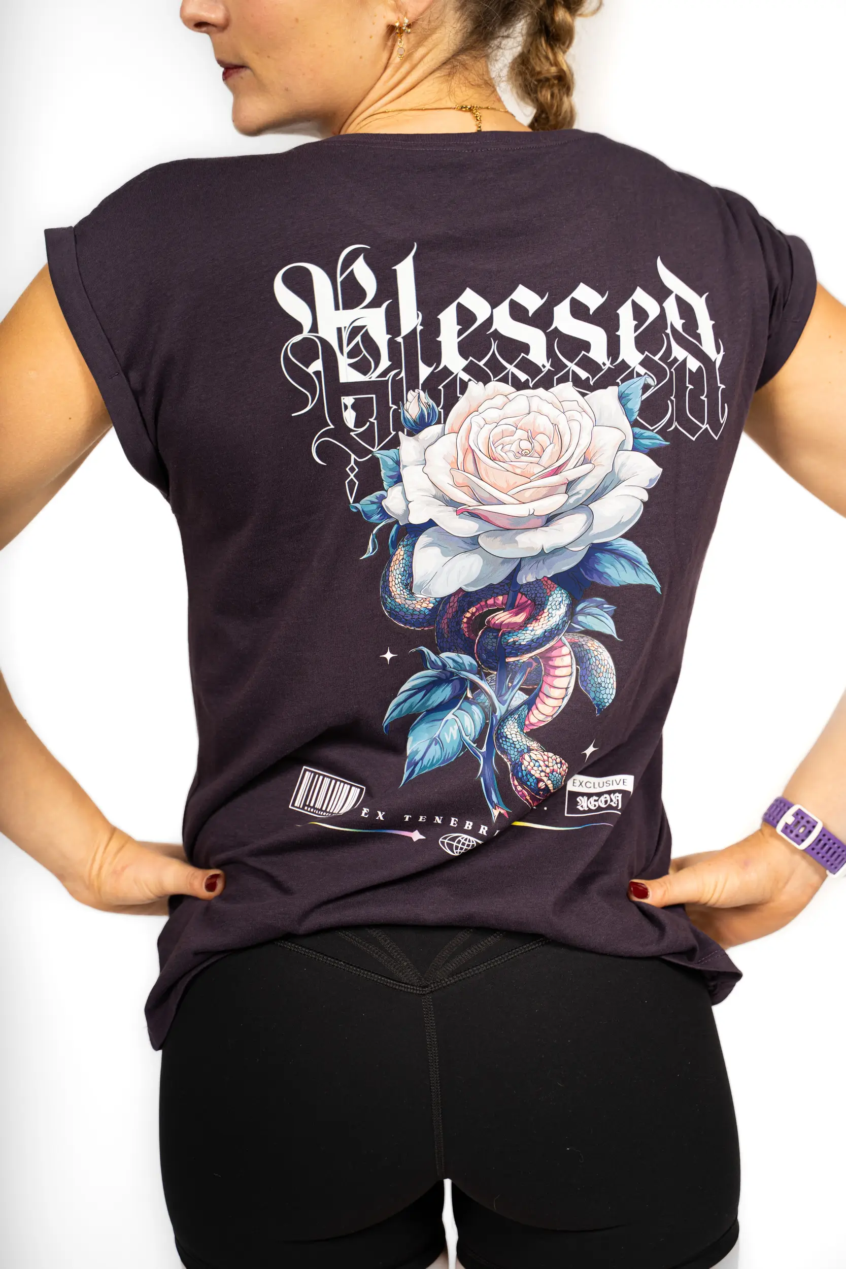 Le design “Blessed”, inspiré du thème Nekyia, illustre la résilience lumineuse : la rose, symbole de beauté et de courage, s’élève face au serpent, représentant l’épreuve et la peur.