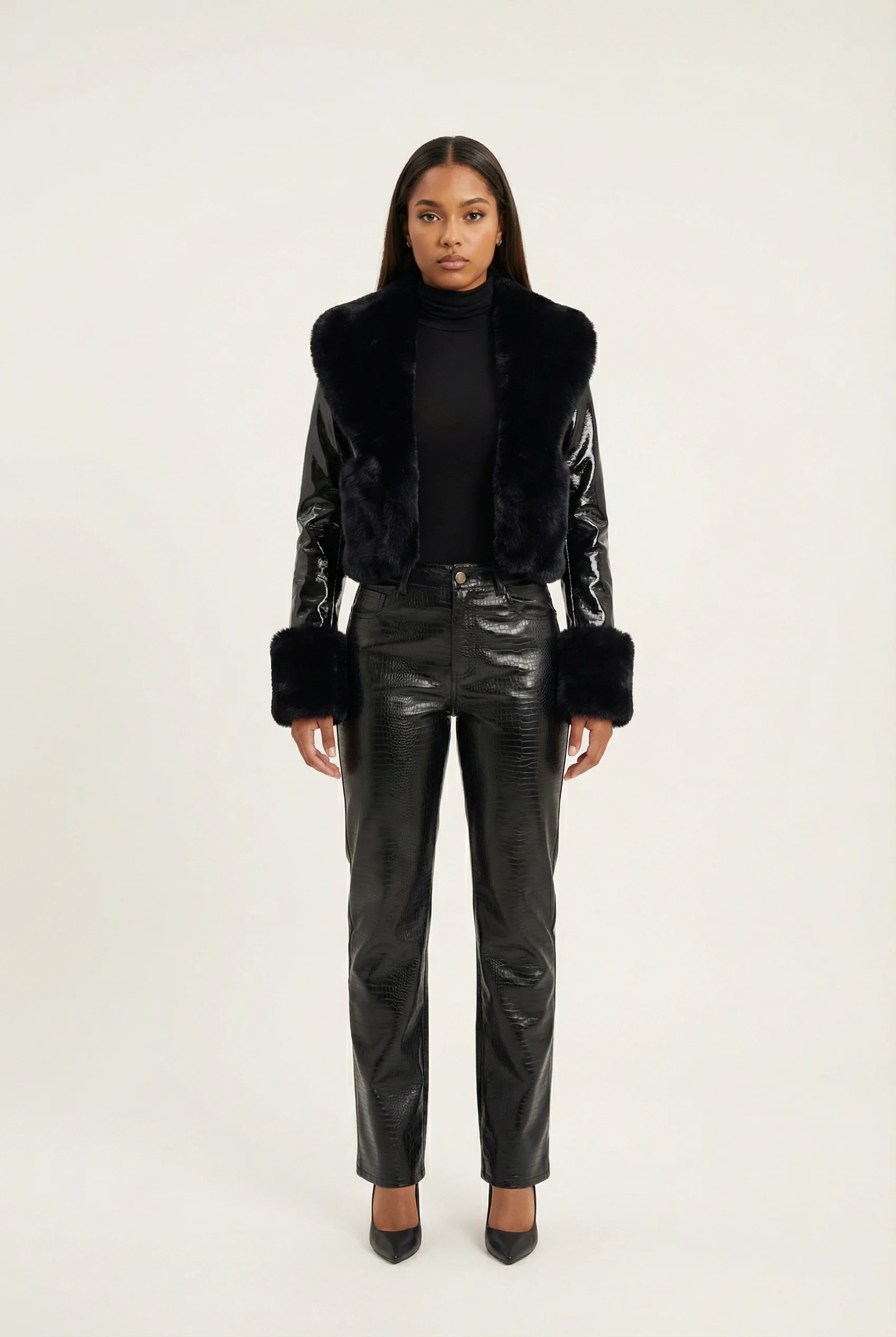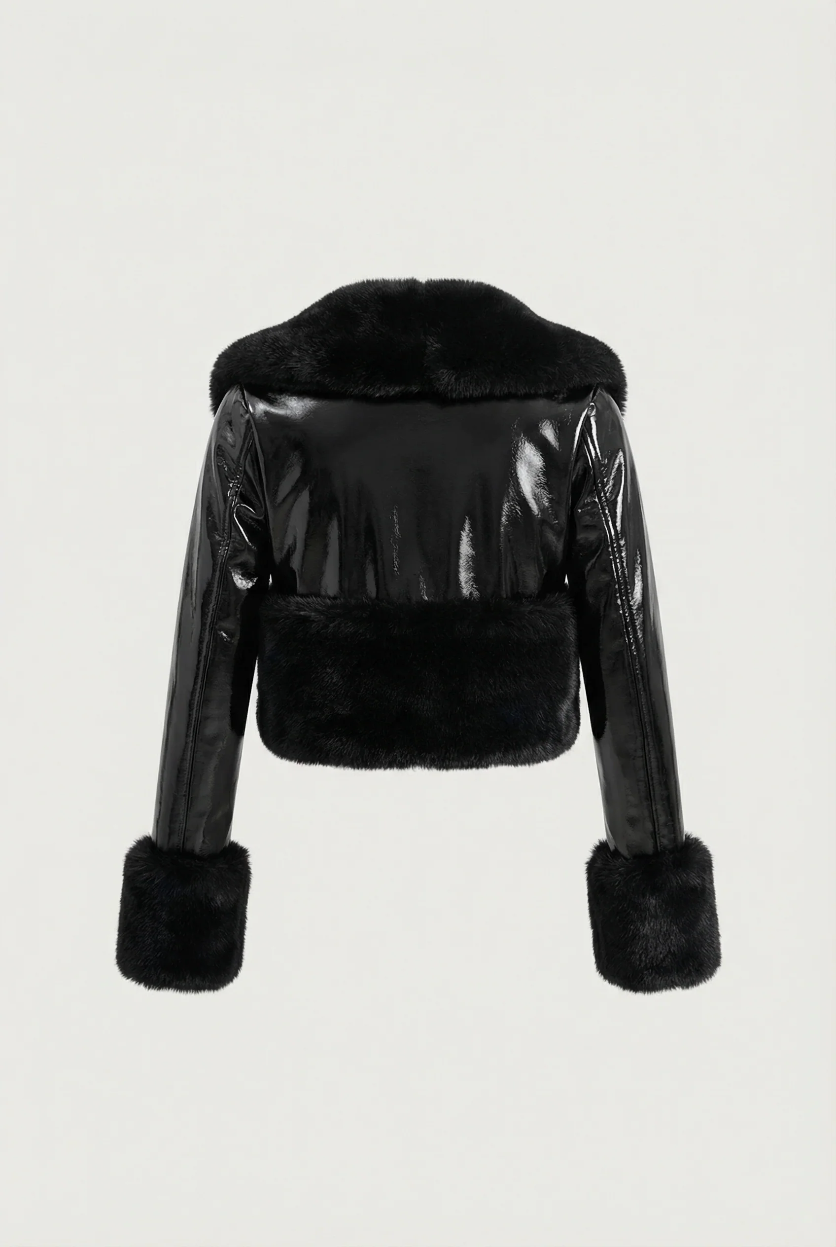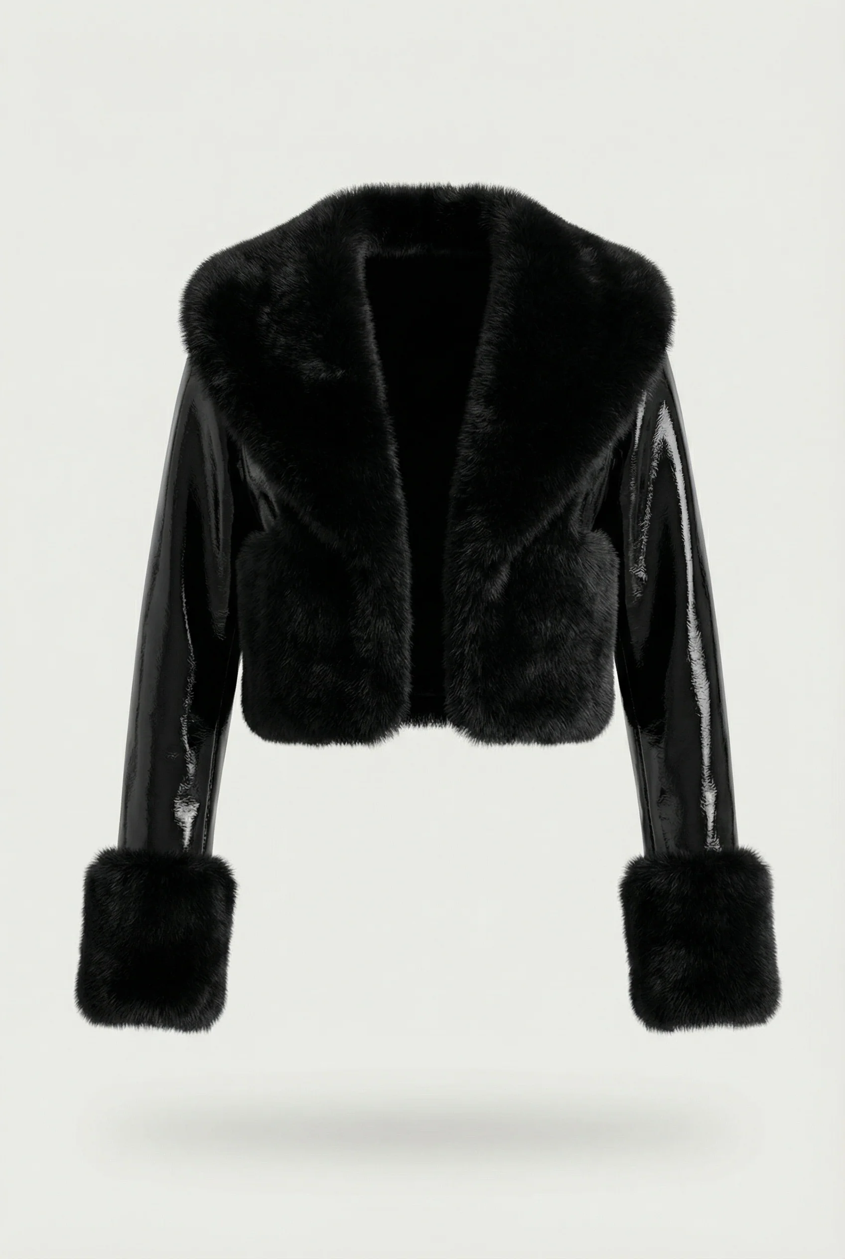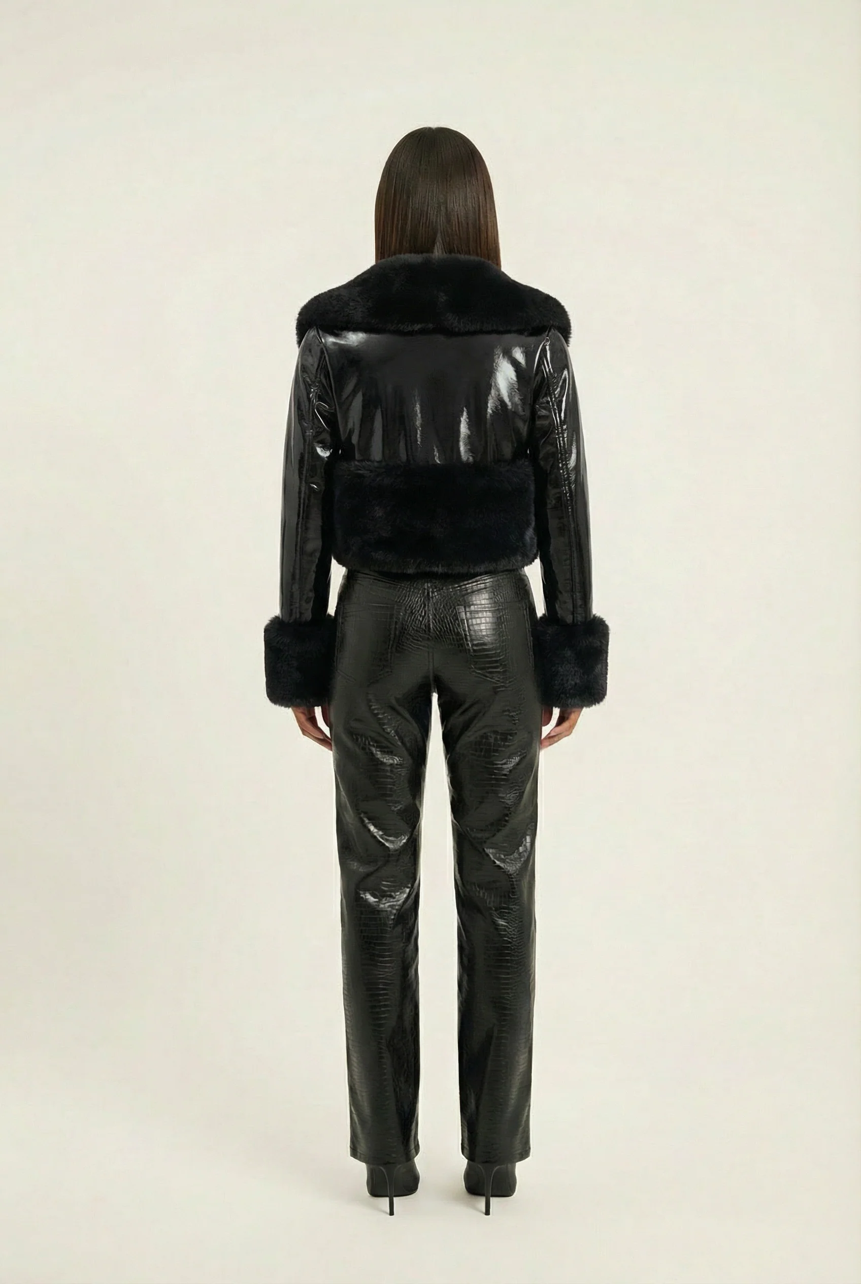 Dans l’esprit Ladies In Paris, cette veste noire signe une allure de nuit, nette et assumée. Le col en fourrure généreux encadre le décolleté comme une étole, tandis que la matière à effet laqué accroche la lumière à chaque mouvement. Les poignets en fourrure ajoutent du contraste et donnent tout de suite un rendu “haute silhouette”, sans effort. Portée sur un col roulé près du corps, elle devient ultra parisienne; portée sur une robe ajustée, elle crée ce décalage chic qui fait la différence. Sa ligne courte met la taille en valeur et fonctionne parfaitement avec un pantalon taille haute ou une jupe crayon. C’est la pièce qui donne du caractère à une tenue minimaliste et qui rend une sortie, même simple, immédiatement plus élégante.
