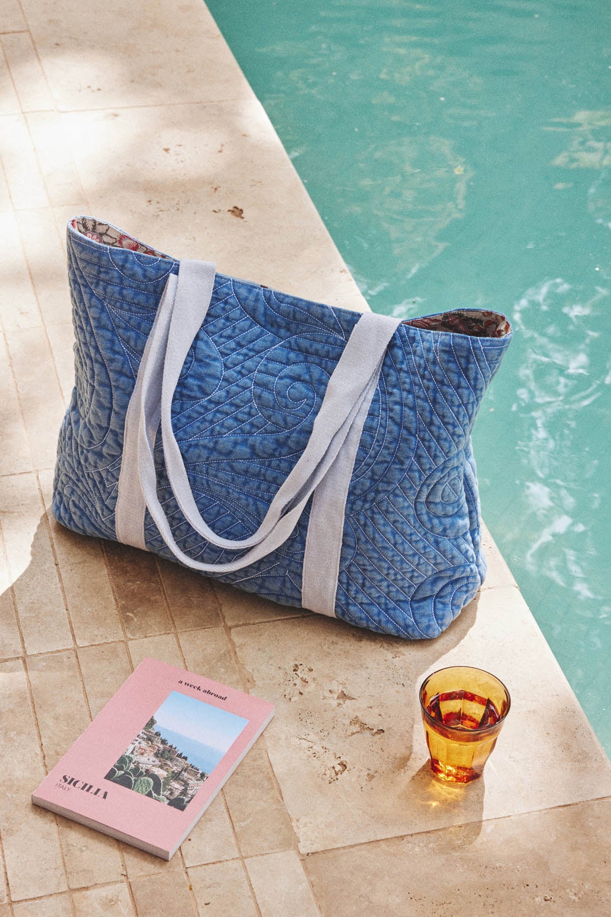 - Cabas en toile de coton façon denim avec un côté matelassé motif vagues et un côté surpiqûres verticales.