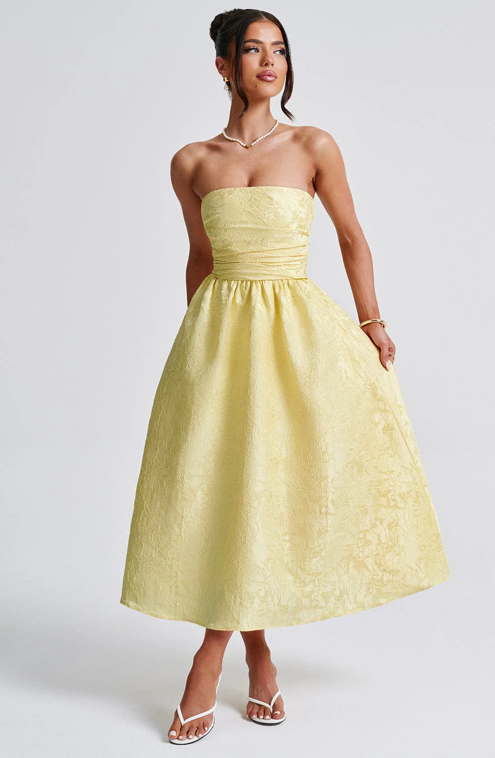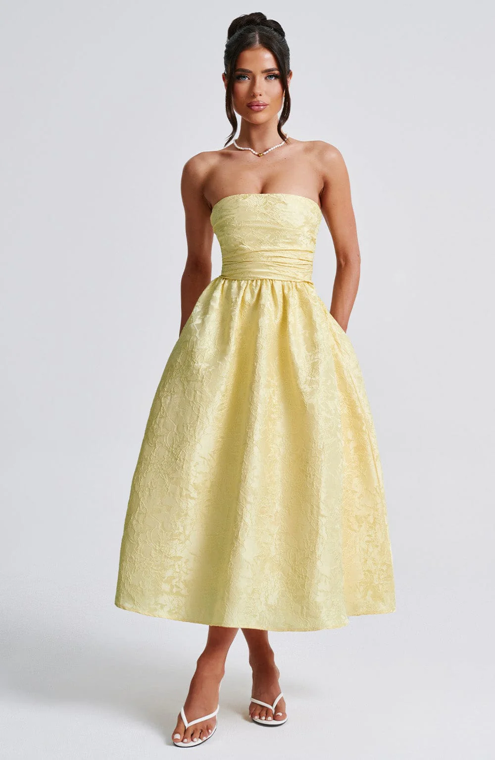Une robe à porter en toute saison, Saoirse en jaune citron est confectionnée dans notre plus beau jacquard fleuri, avec une longueur mi-longue et une jupe très ample doublée de tulle pour plus de volume. Ce modèle bustier intègre des baleines dans le corsage pour une taille cintrée, avec des détails plissés et froncés. Le look est complété par un laçage dans le dos. À porter avec des talons pointus et une coiffure élégante relevée.