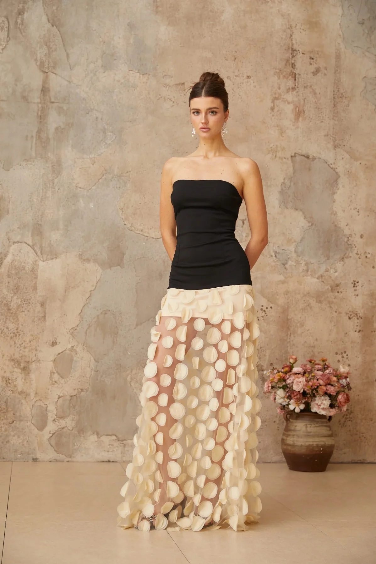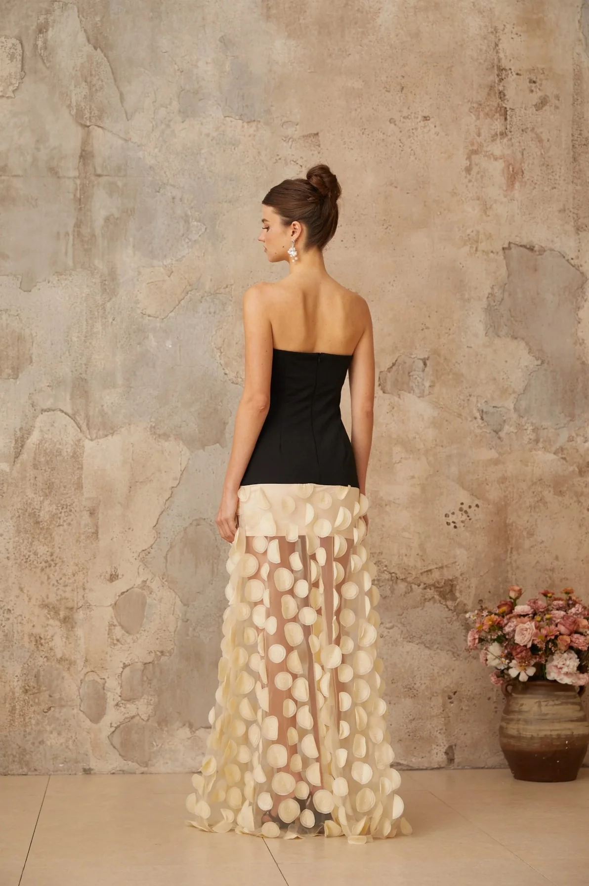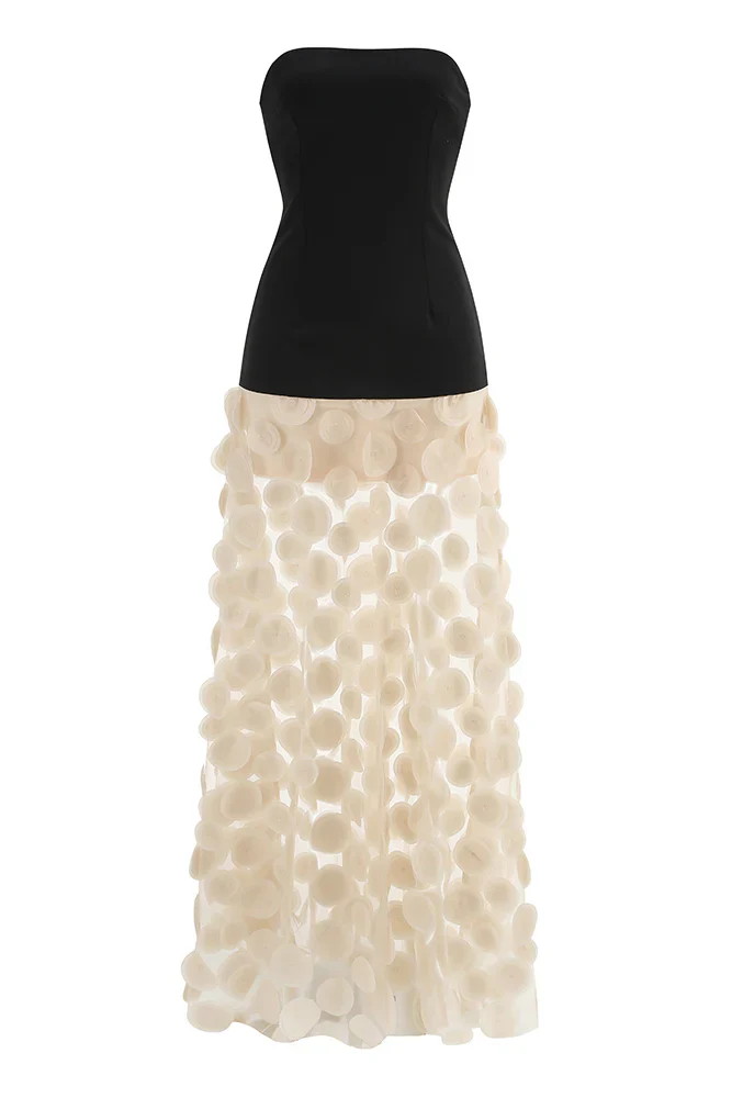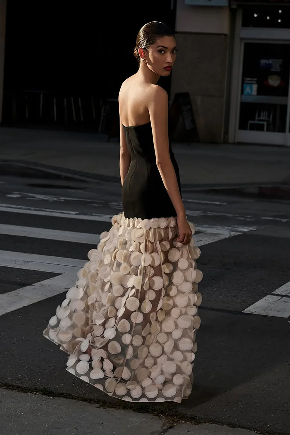 Le bustier noir, structuré et minimal, épouse les courbes sans les contraindre. Puis vient l’éclat inattendu d’un jupon aérien, une pluie d’écailles ivoire dansant sur un tulle diaphane. À chaque pas, un murmure de contraste entre rigueur et légèreté, entre opacité et transparence. Une silhouette sculptée dans l’épure, magnifiée par le jeu subtil des volumes et des matières.