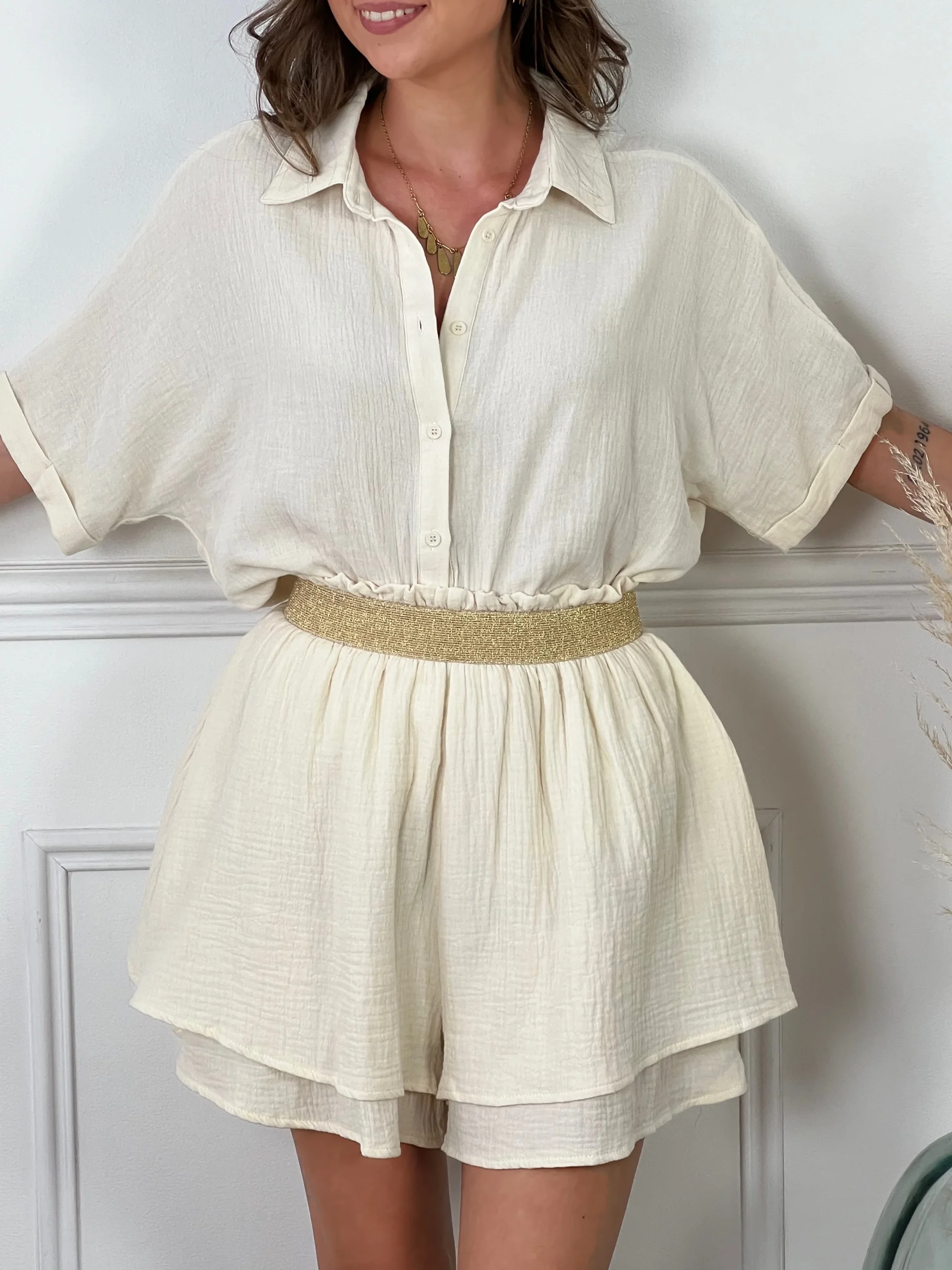 Découvrez ce magnifique short beige, agrémenté de volants délicats pour une touche féminine et élégante. La ceinture dorée rehausse subtilement la taille, ajoutant une note chic et sophistiquée. Idéal pour les journées d’été, ce short est parfait pour un look raffiné et tendance, que ce soit pour une sortie entre amis ou une occasion spéciale.