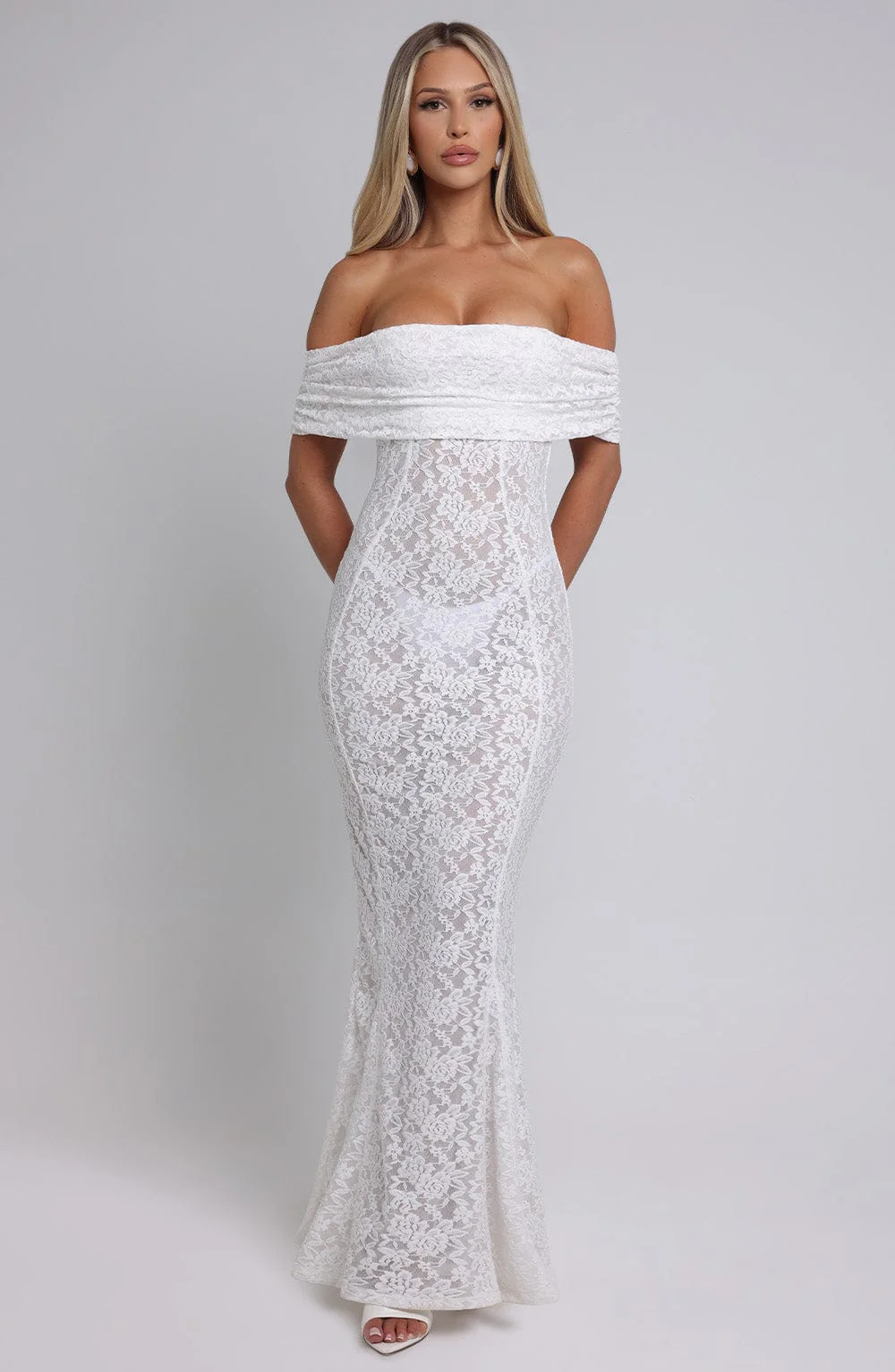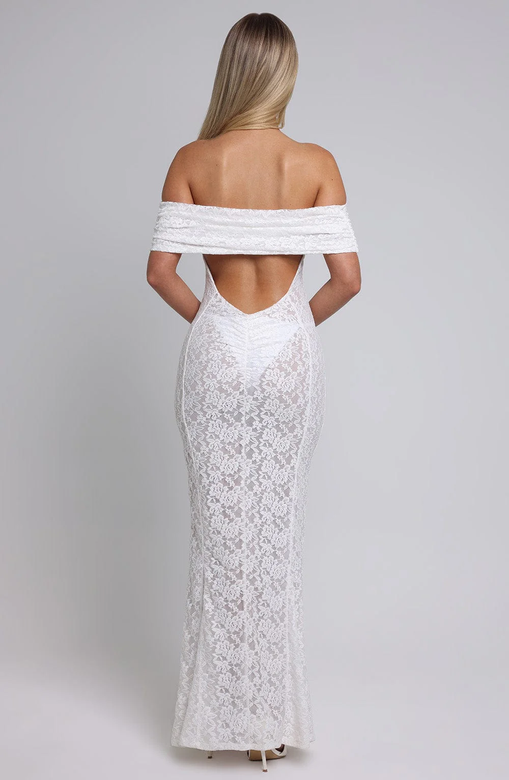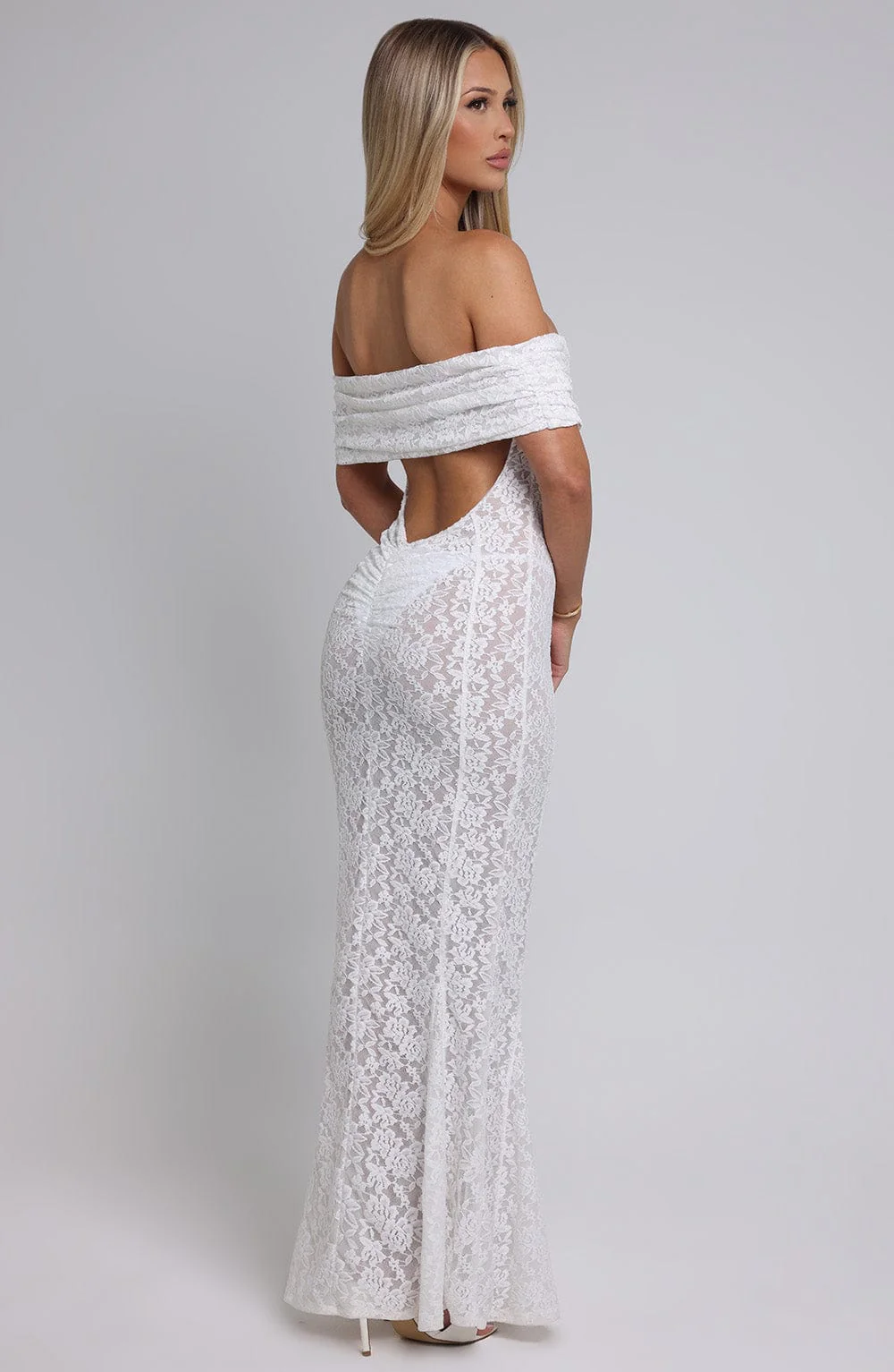 Faites sensation avec la robe Stephanie, une robe longue et transparente confectionnée dans notre dentelle florale extensible premium, à la fois élégante et audacieusement sensuelle. Sa coupe évasée met la silhouette en valeur, tandis que son encolure Bardot dévoile les épaules avec raffinement. Le dos plongeant, les coutures galbantes et les fronces au niveau des fesses soulignent les courbes avec subtilité. À superposer sur un bralet basique et un short taille haute pour un effet maximum.