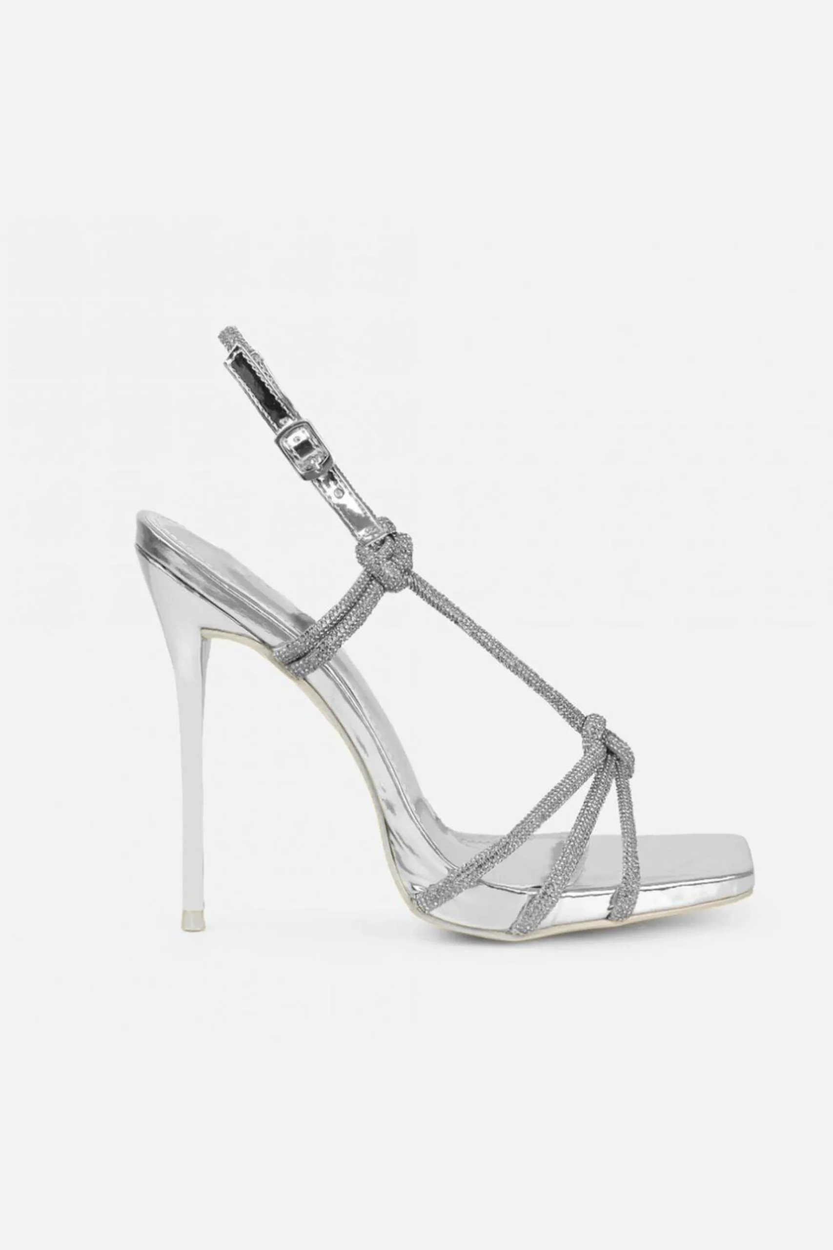 Ces talons couleur argent combinent un design audacieux et un confort cambré. La bride scintillante et le nœud glamour soulignent le pied avec finesse. Un must-have pour toutes vos soirées.