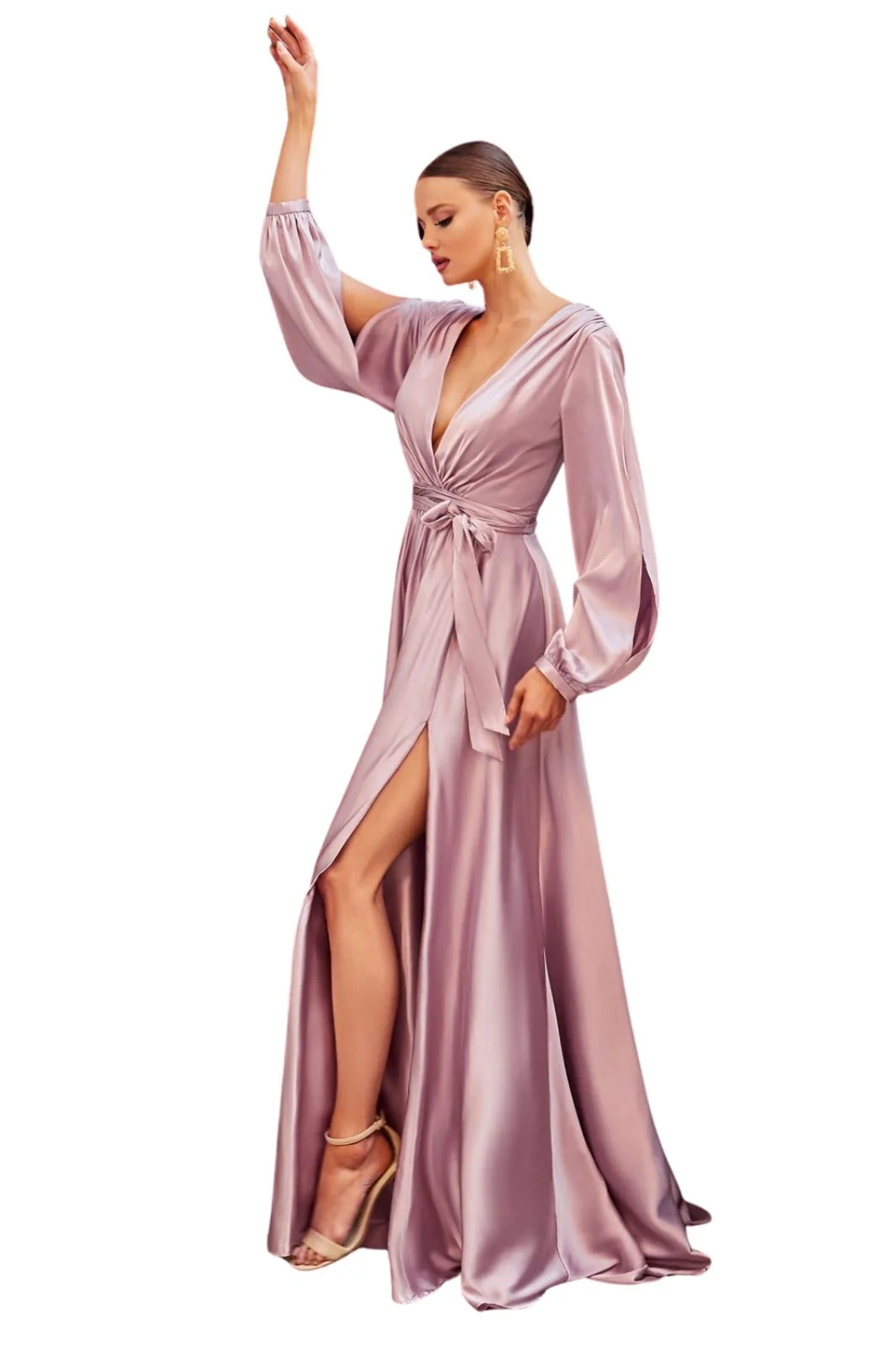 Description: Confectionnée dans un satin doux, cette robe longue présente des manches blouson fendues romantiques, un corsage plissé effet portefeuille et une encolure en V profonde. La jupe trapèze froncée présente une fente qui effleure la cuisse pour que vous puissiez montrer une petite jambe. Cette robe est l’incarnation de l’élégance, de la beauté et de la facilité.