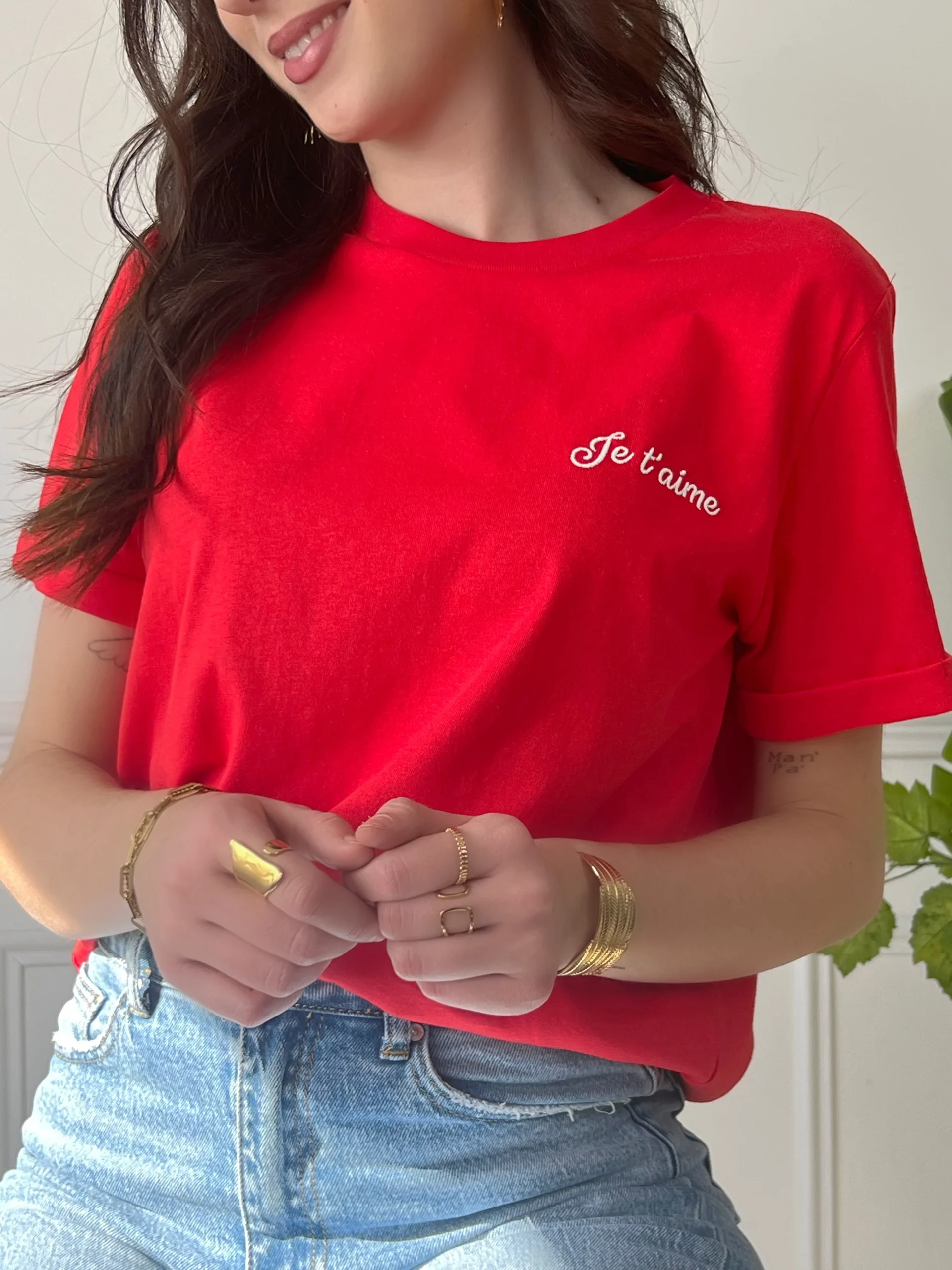 Dites « je t’aime » avec élégance grâce à notre tee-shirt rouge féminin à col rond et manches courtes en 100% coton. Sa coupe confortable allie style et douceur pour vous accompagner au quotidien. Une déclaration d’amour intemporelle à porter fièrement.