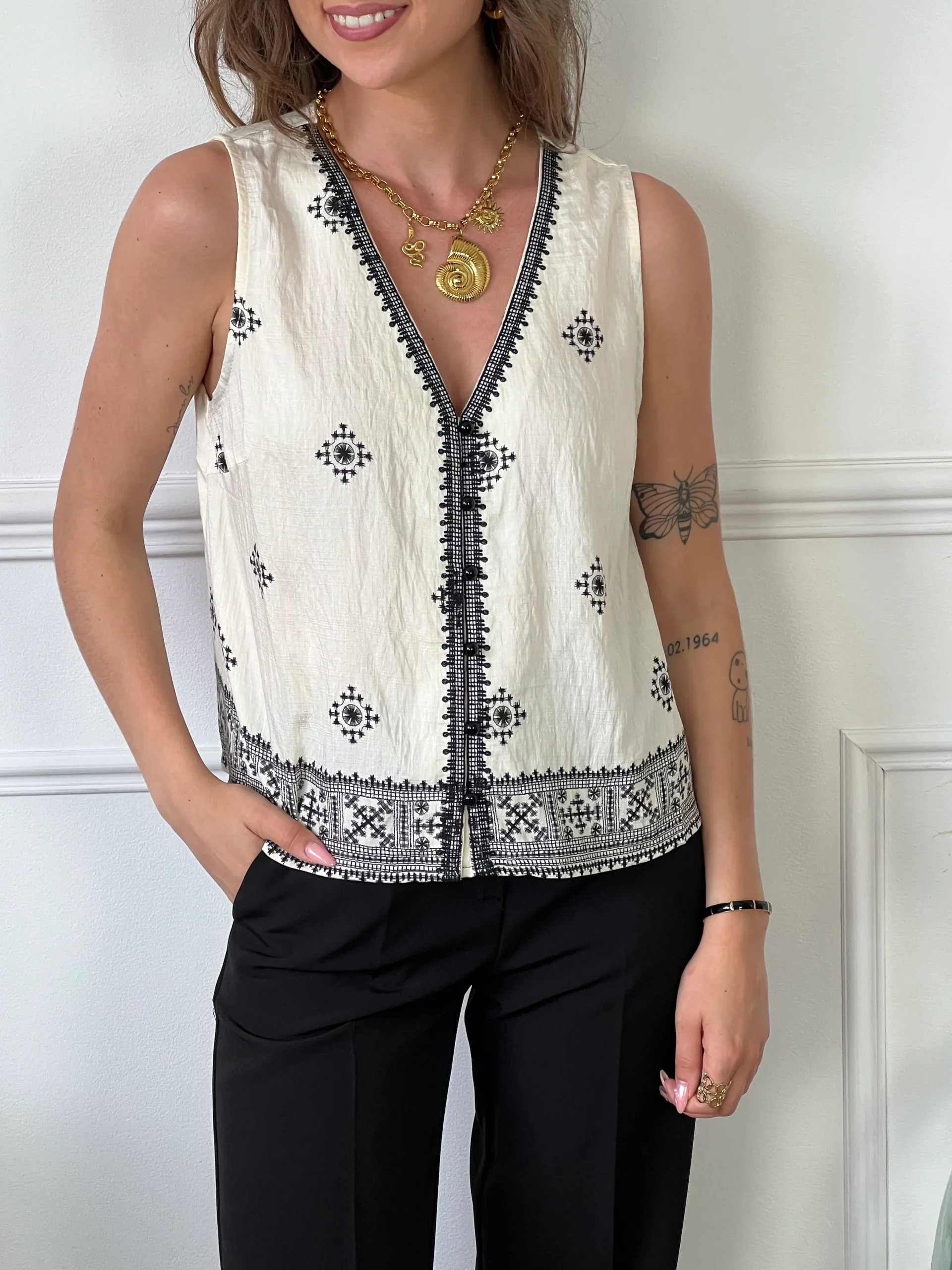 Ce gilet sans manches beige, orné de motifs noirs élégants, est un parfait mélange de chic et de confort. Son design sans manches apporte une allure légère et estivale, tandis que les motifs noirs ajoutent une touche de sophistication. Polyvalente et tendance, elle se porte aussi bien au bureau qu’en sortie décontractée, offrant une élégance intemporelle.