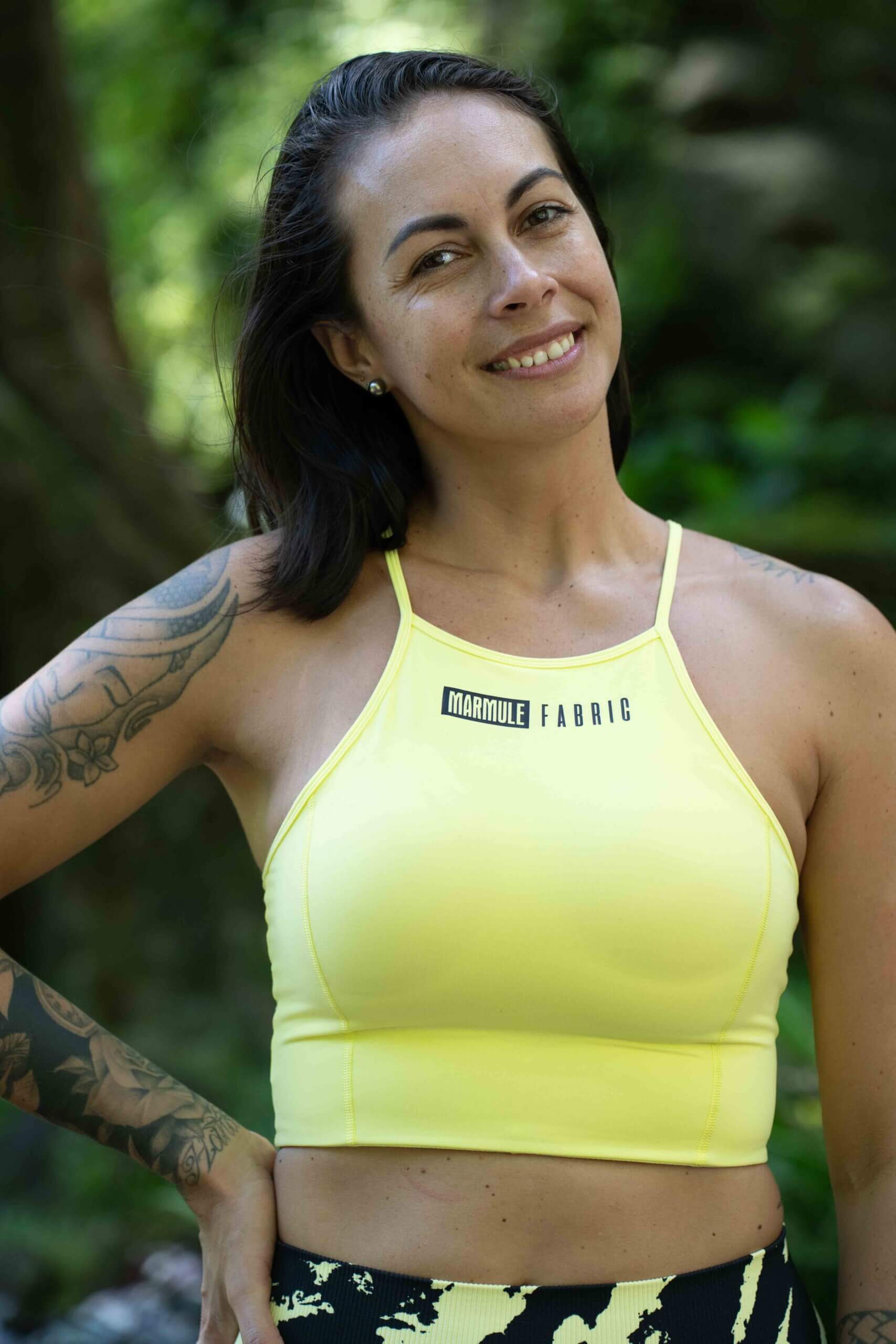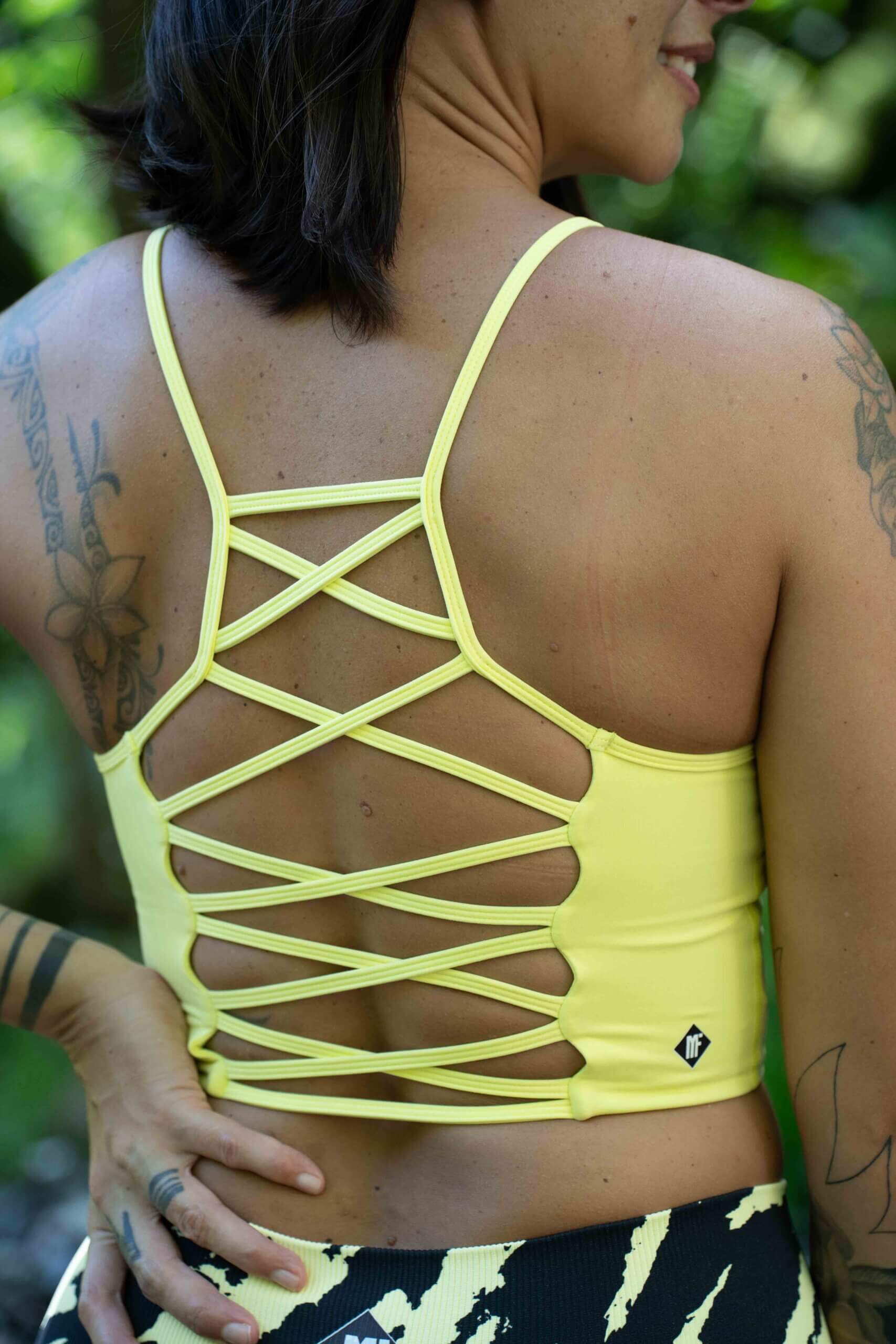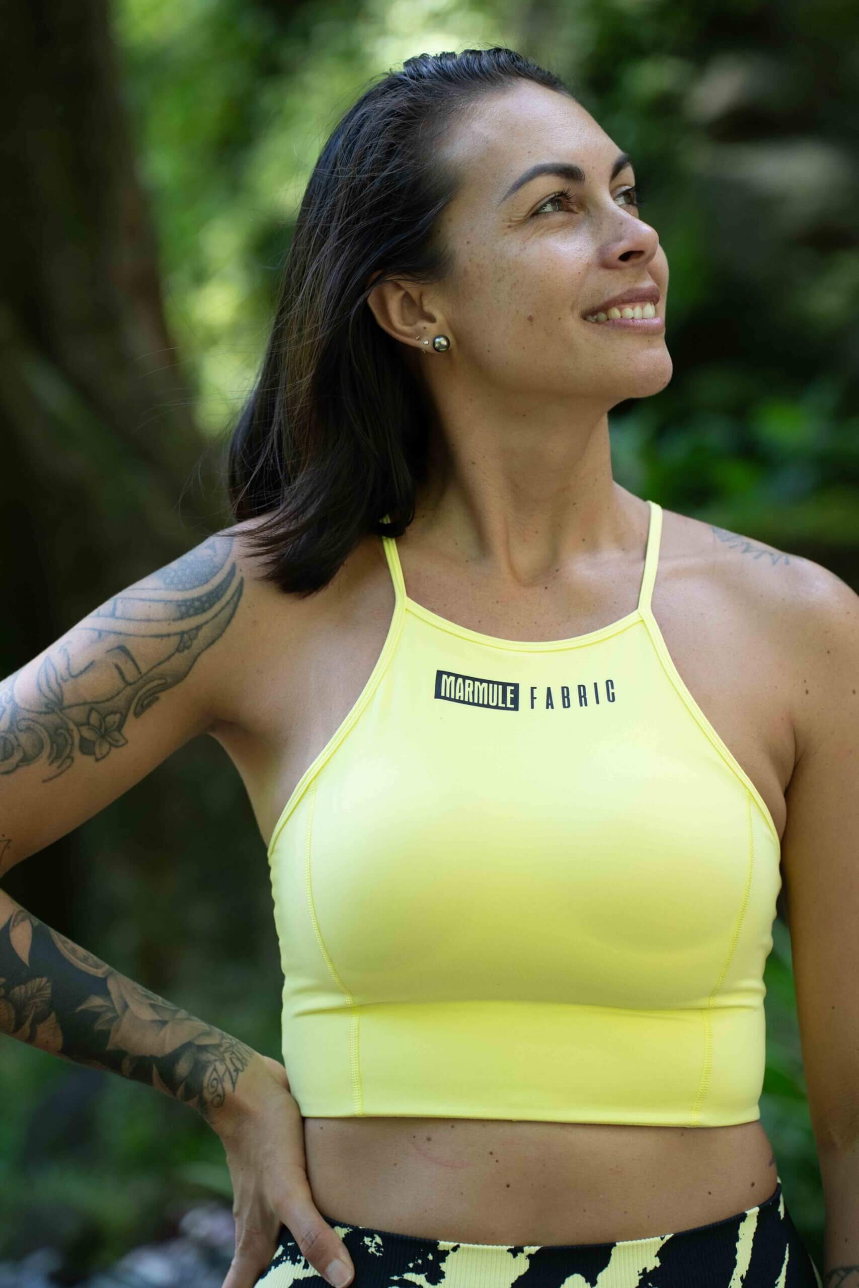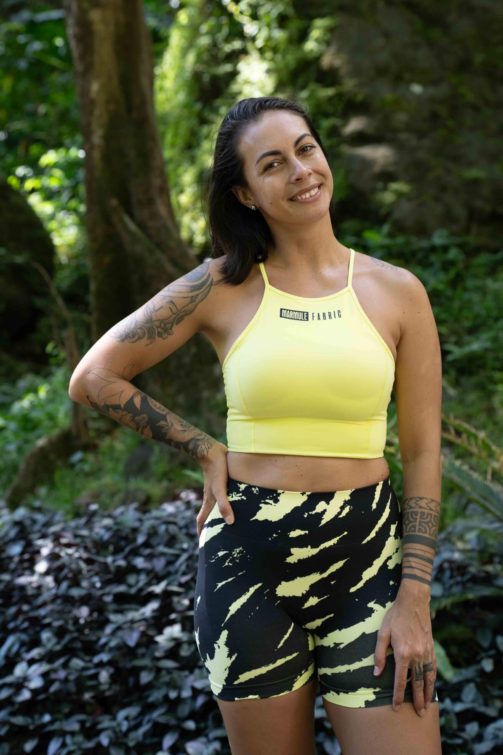 Issue de notre collection Drop in Tahiti: la Brassière “Hina” ! Avec sa couleur jaune et son dos hyper original, elle est juste dingue ! A assortir avec le legging Hina pour un ensemble “wouah !”