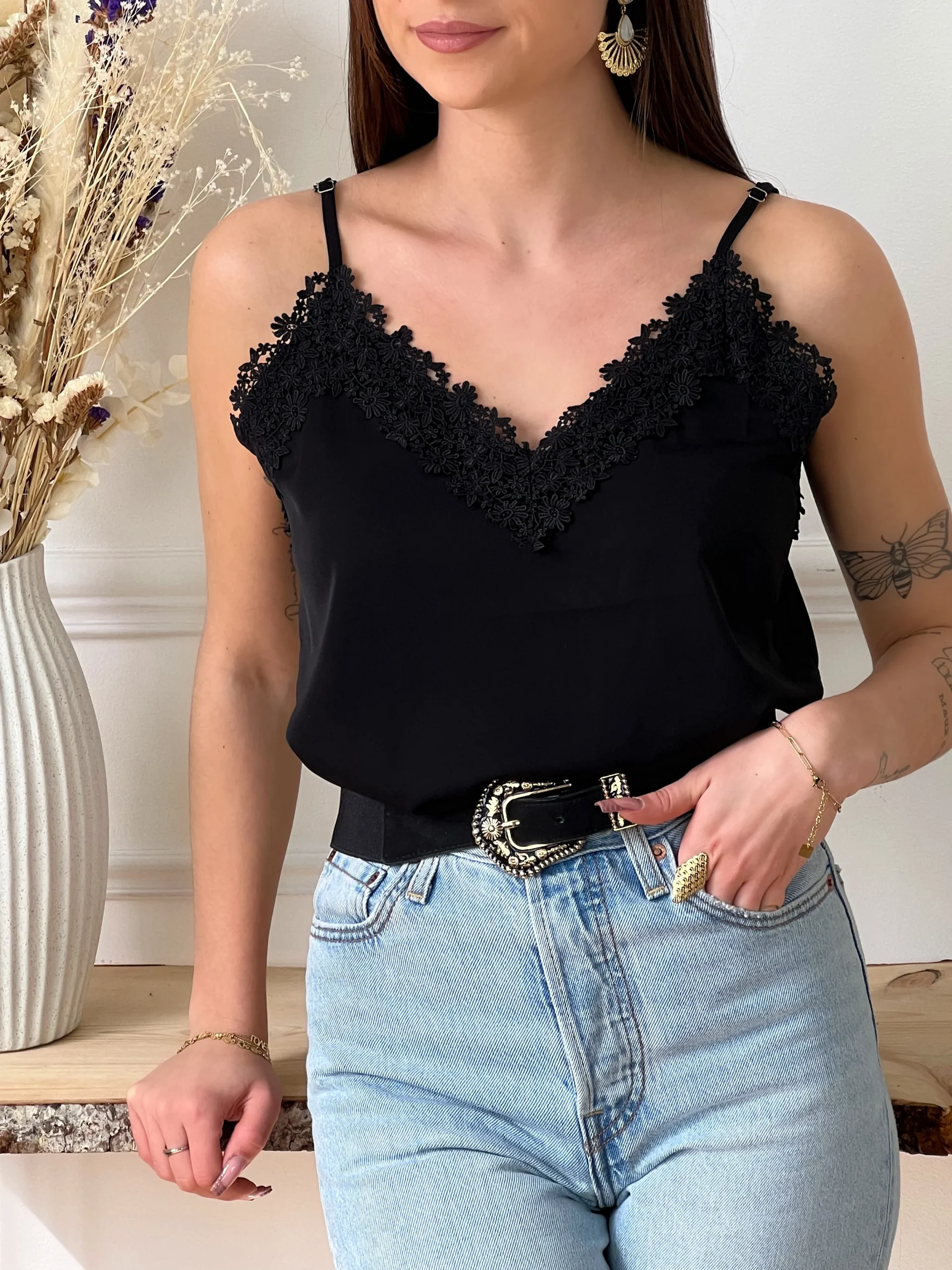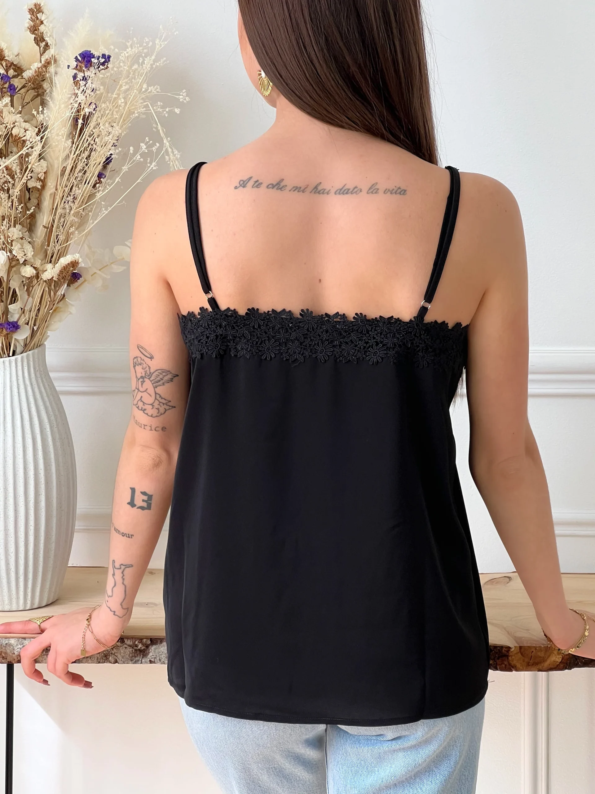 Top à bretelles réglables noir et broderie