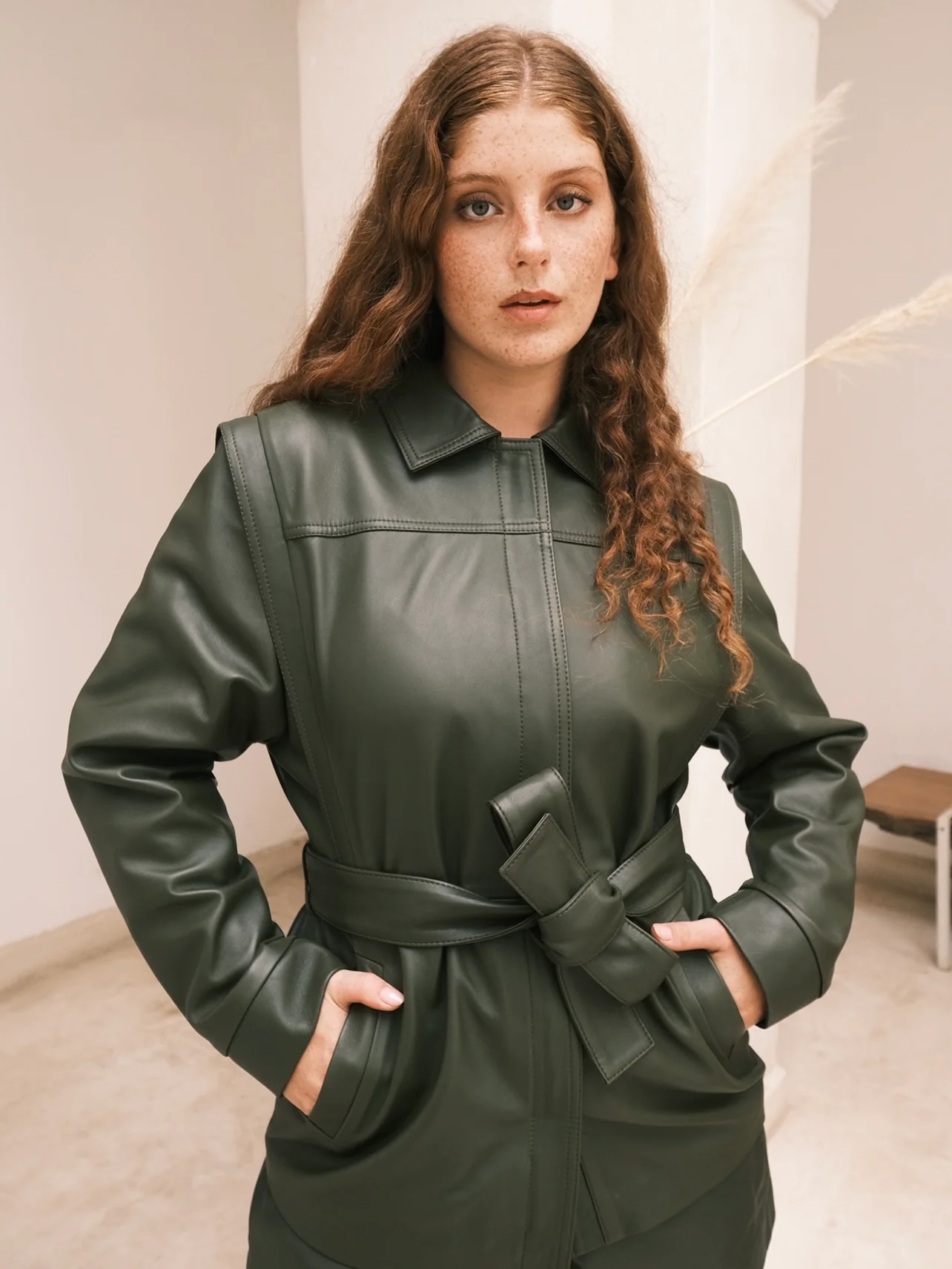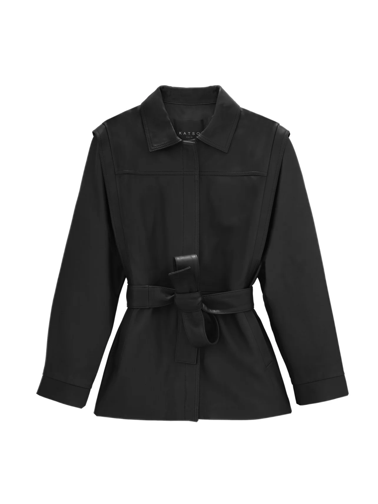 Détails: Col chemisier, fermeture par un zip caché sous patte, ceinture en cuir comprise, deux poches raglans à l’avant, longueur: 69 cm.