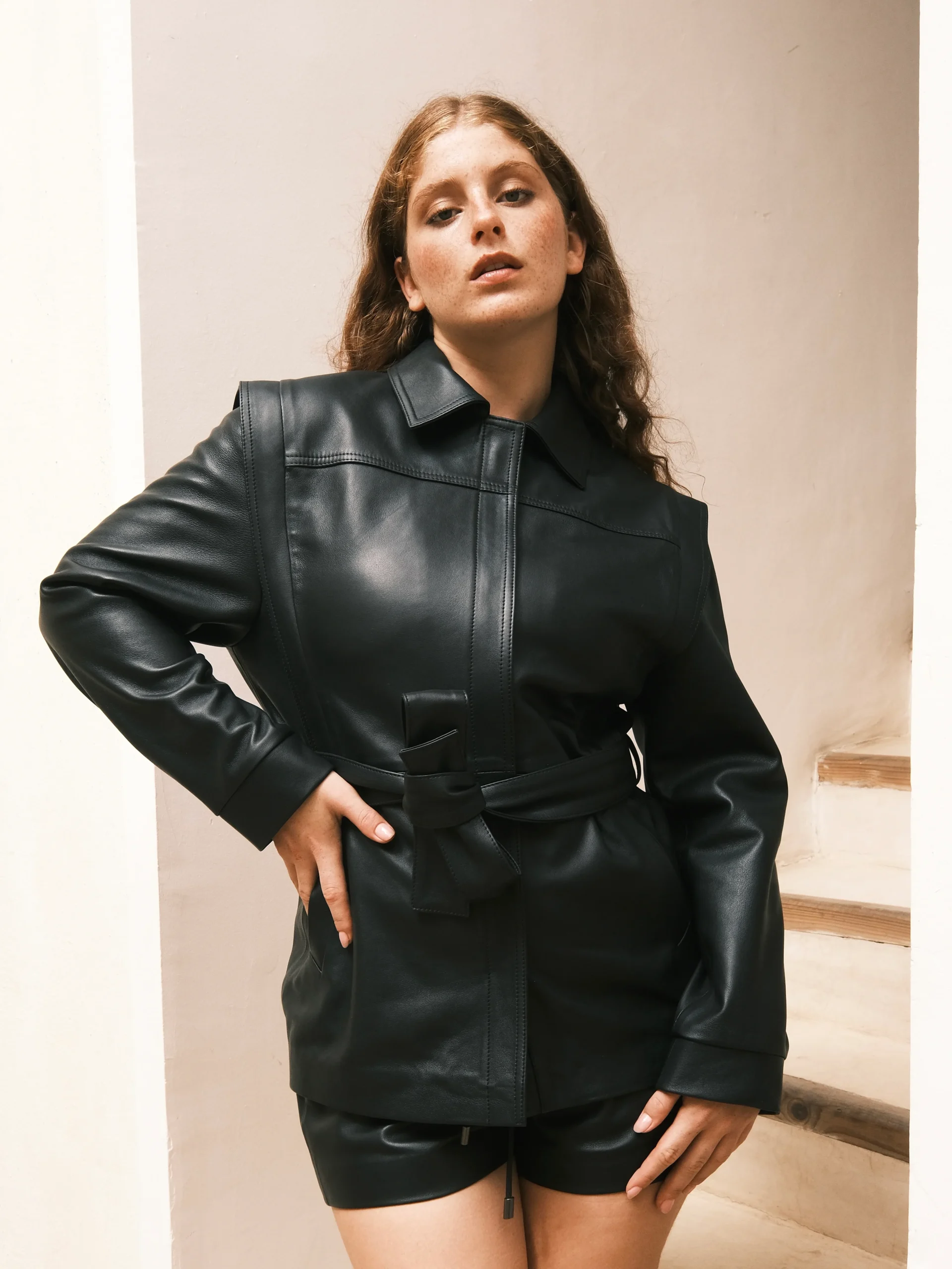 Cette veste en cuir structurée à la taille avec sa ceinture et ses volants aux épaules saura vous donner une allure féminine et élégante. À porter avec un jeans ou une jupe cloche pour un style chic et épuré.