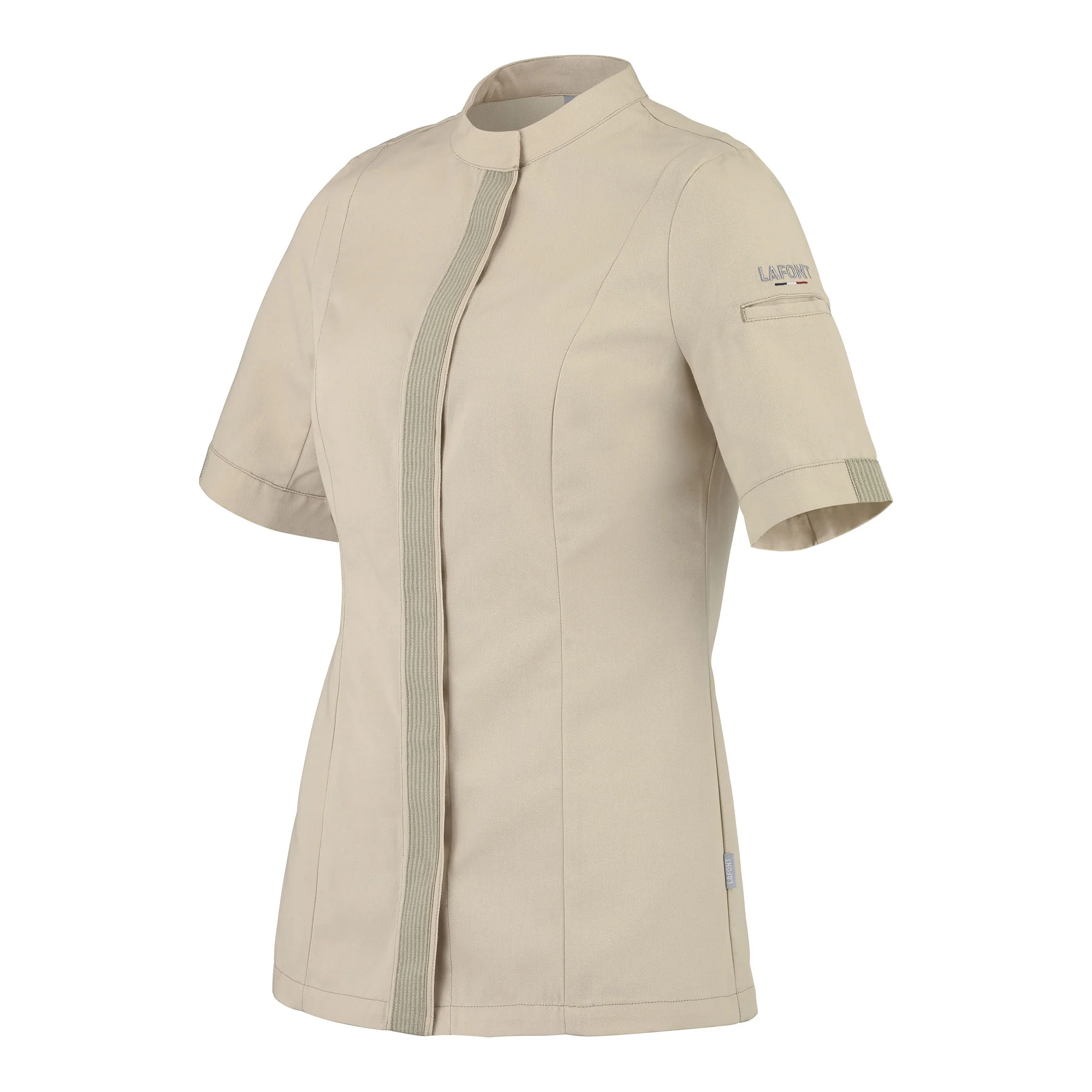 Veste de cuisine pour femme, manches courtes, avec galon sur patte cachée milieu devant, qui apporte un détail couture très délicat. Cette veste offre une bride encolure dos pour recevoir votre tablier et le maintenir en place tout au long de votre journée de travail. La matière est en mélange de polyester recyclé.