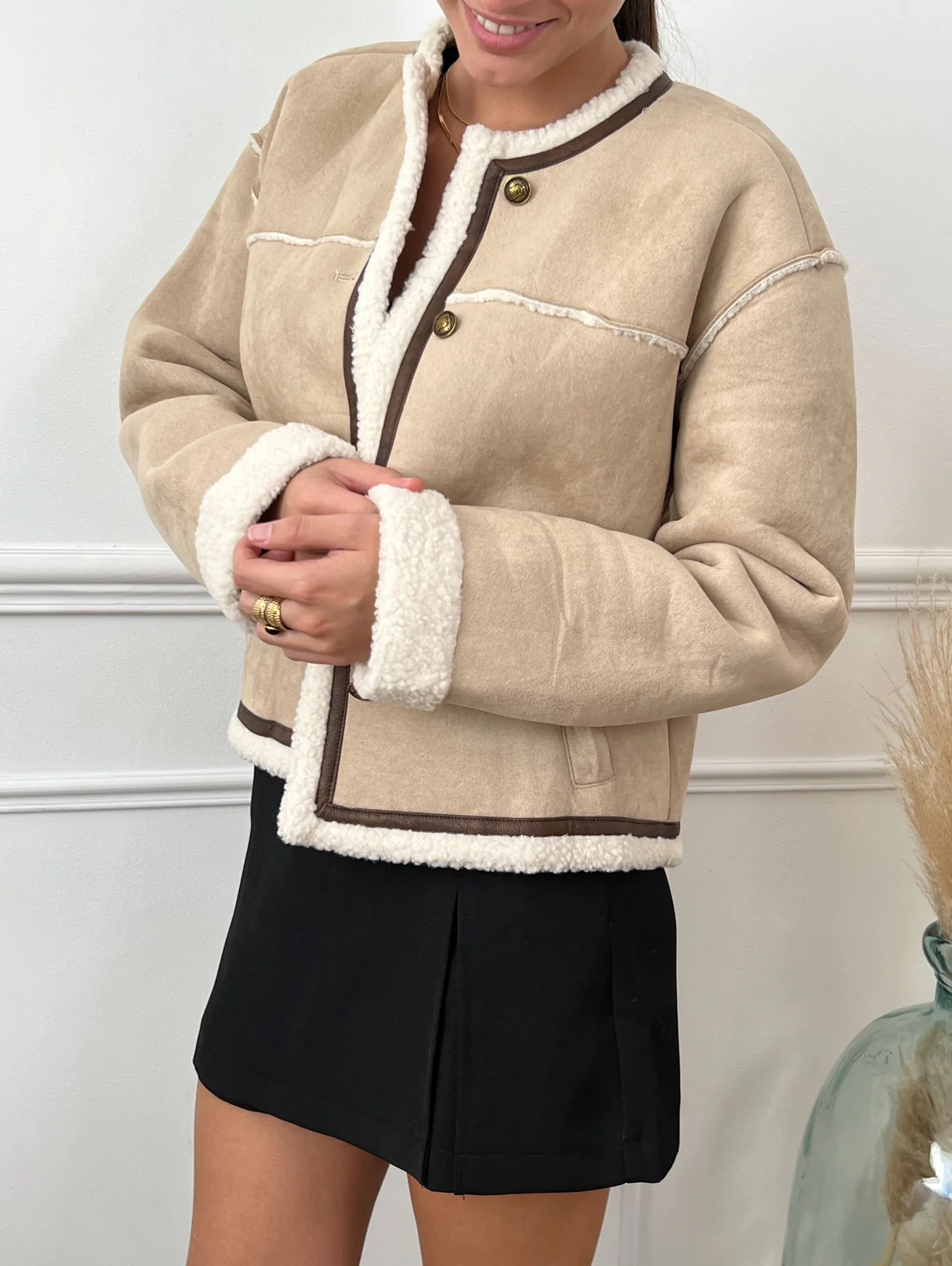 La veste manches longues Danae apporte chaleur et style grâce à son effet moumoute doux à l’intérieur et son effet daim élégant sur le torse et le dos. Avec son col en V et ses détails en cuir marron, cette veste offre un confort et une touche de sophistication.