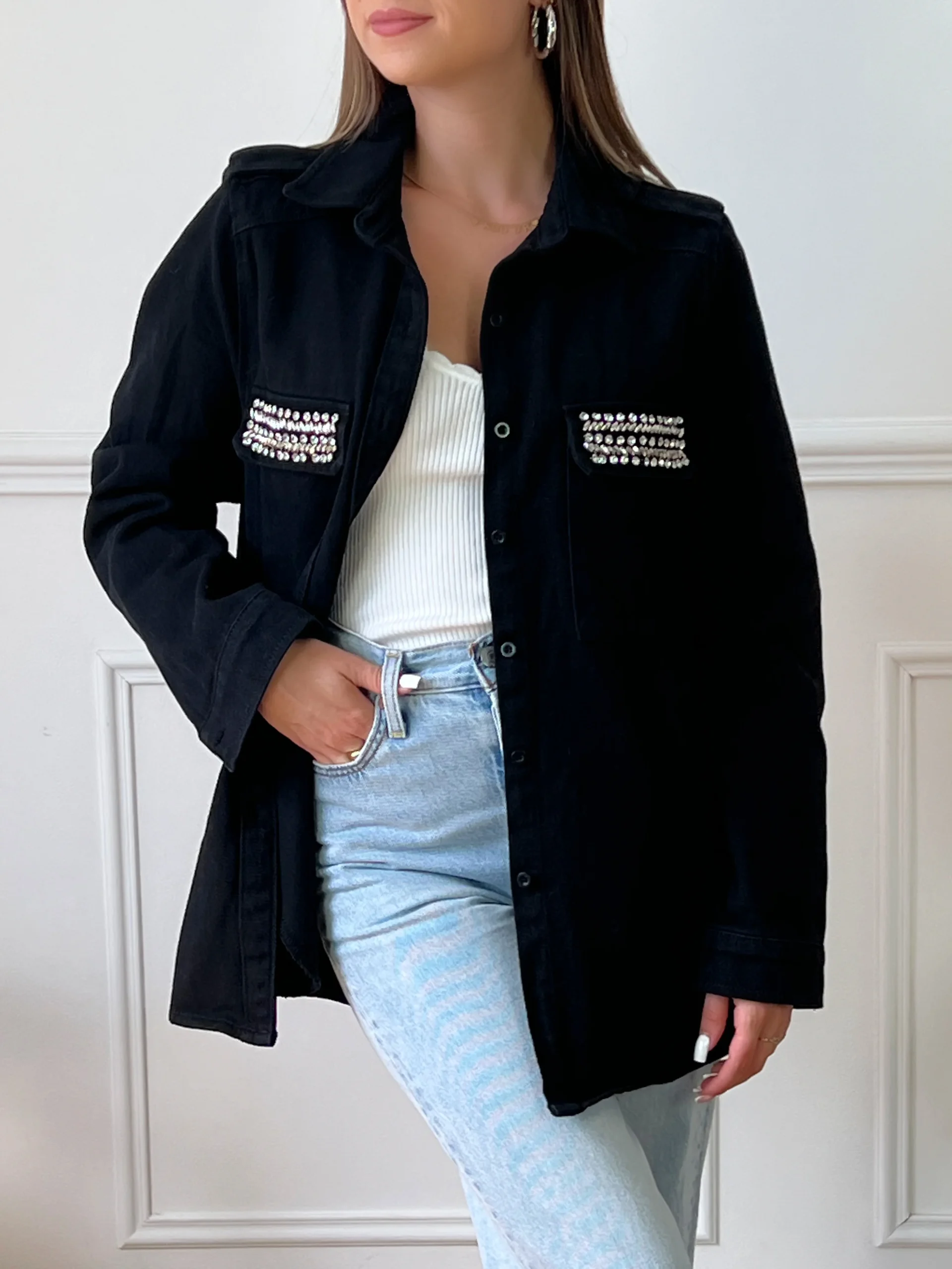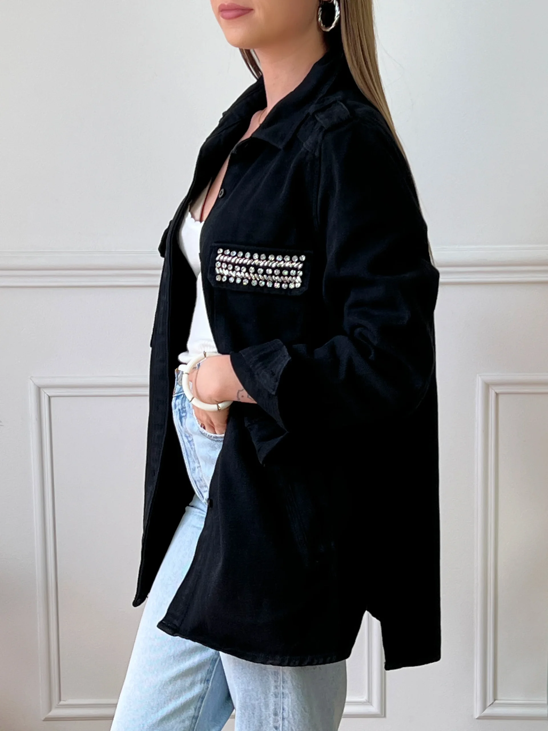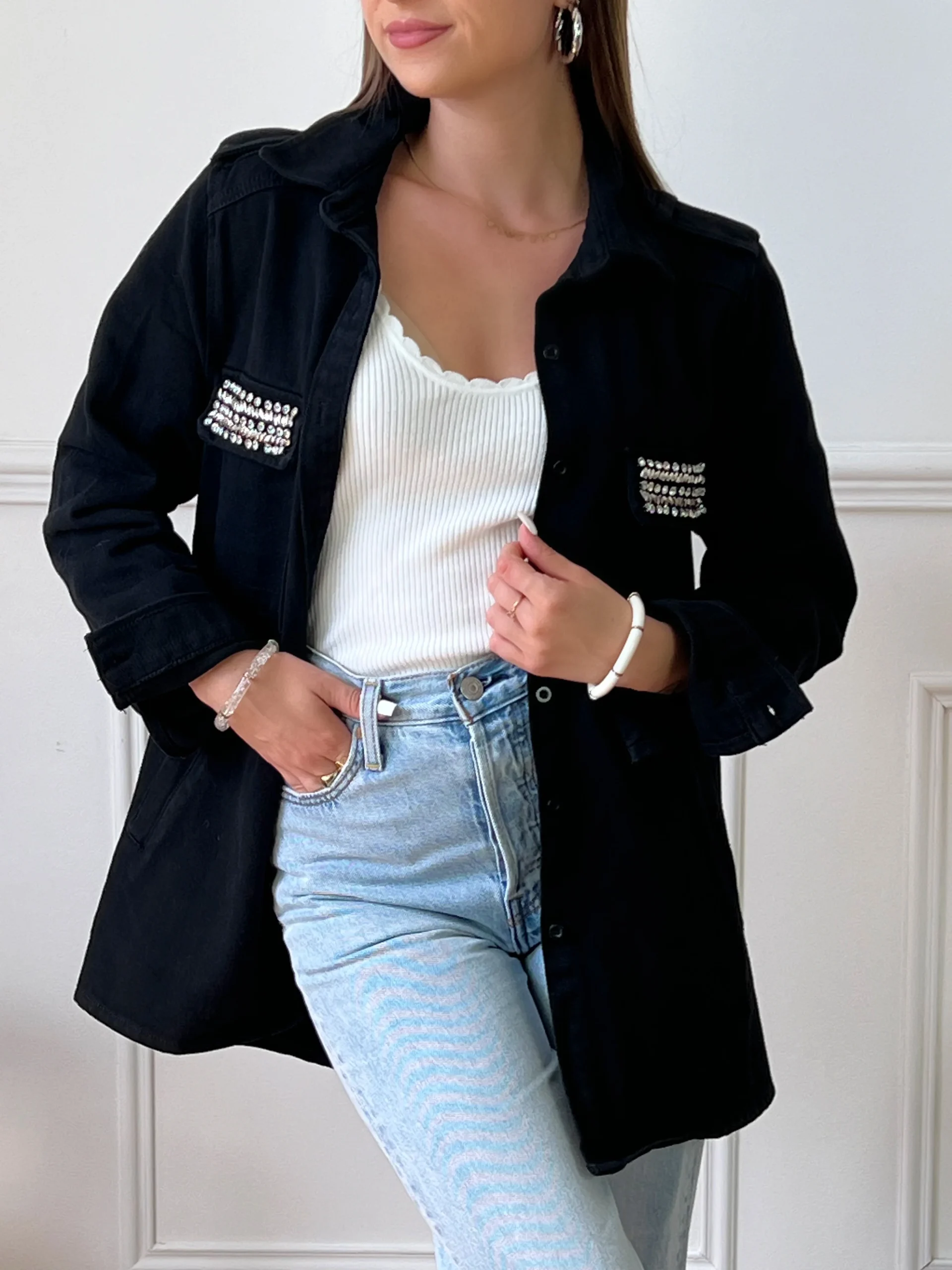 La Veste noire Misha est un indispensable pour les garde-robes. Elle est en coton, et est ornée de strass aux poches pour un look encore plus sophistiqué.